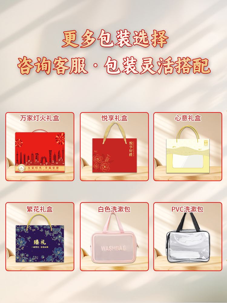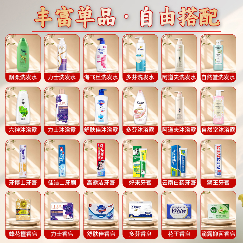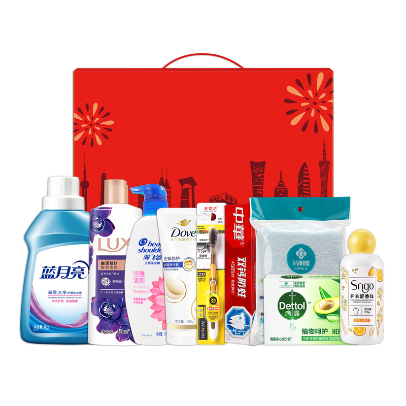 礼盒尺寸:32*8.5*24.5cm 包装尺寸:66*46.5*51CM 产品配置:(香型随机) 海飞些洗发水300ml 蓝月亮洗衣液1kg 多芬护发素100ml SIGO留香珠220g 力士沐浴露350ml 滴露香皂105g 中华牙膏90g 优思洁牙刷 洁丽雅毛巾69*33cm