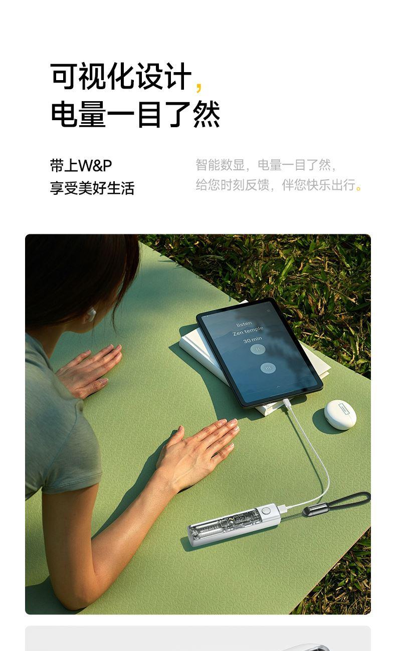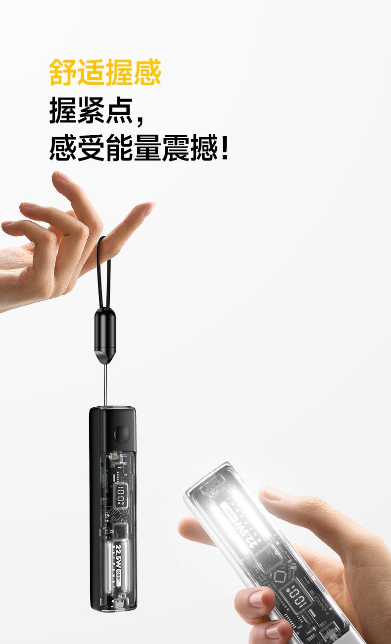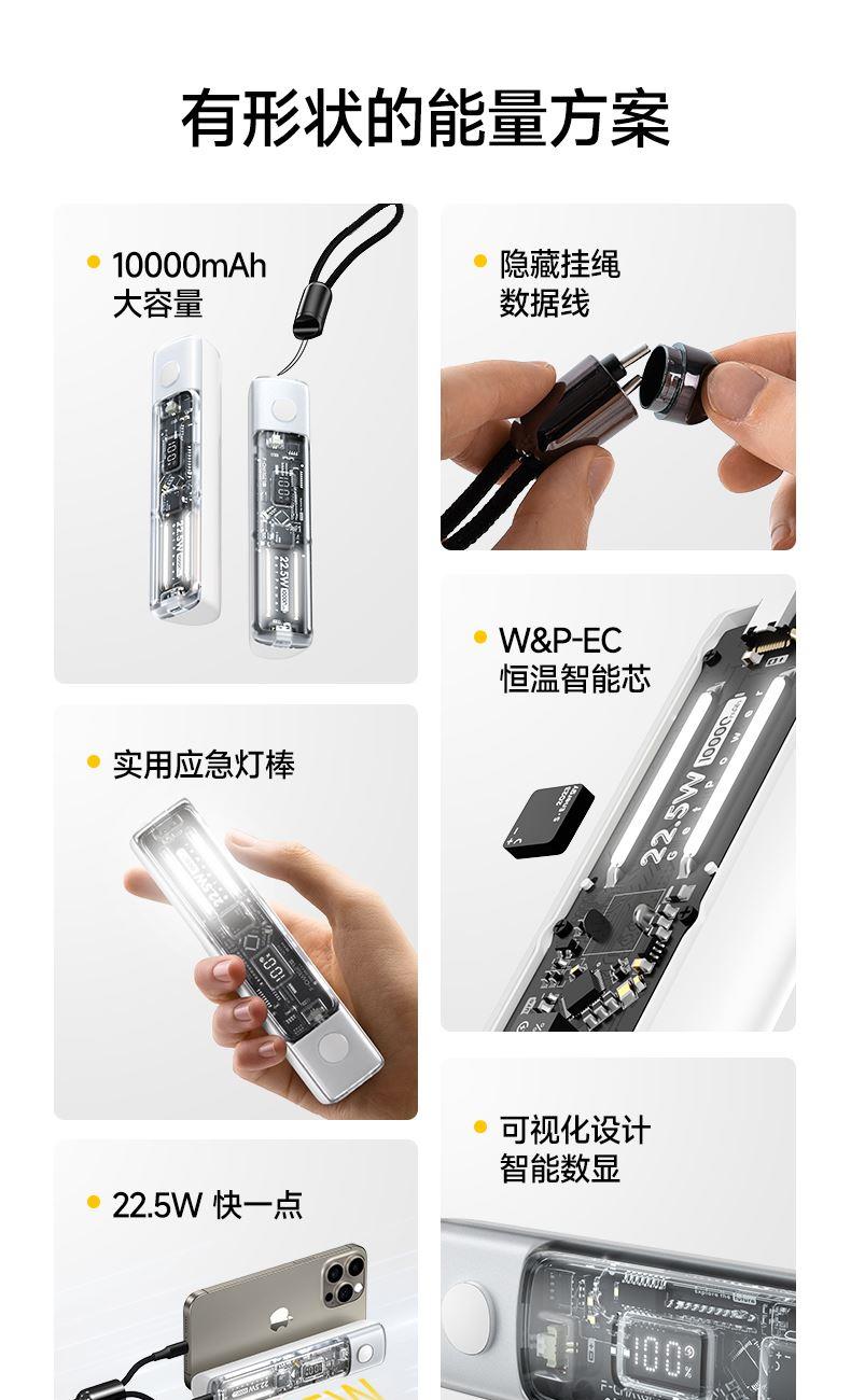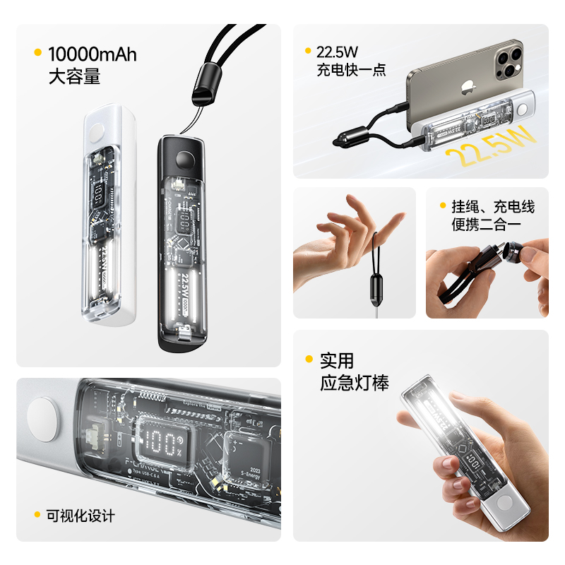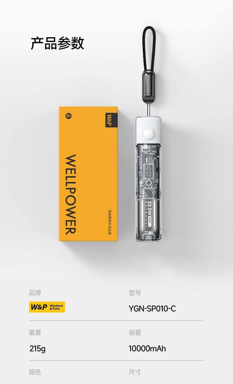 产品型号:SP010-C 产品尺寸:153x30x33mm 产品重量:约215g 22.5W快充,自带TC线+TC口+USB口; 创新磁吸矩阵,兼容苹果15/16-安卓,三设备同时充; LED数字屏实时显示电量; 隐藏式自带线+实验应急灯光,满足多样场景; 看演唱会,一秒秒变打call棒; 10000mAh电芯,满足全天差旅需求。