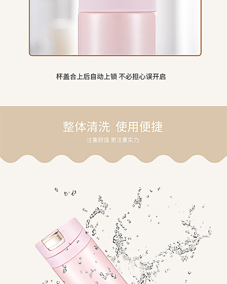 容量:200ml 颜色:白色、粉色、雪纺蓝、靛蓝色、雏菊粉 产品尺寸:5.8X5.8X15.1cm 重量:0.12kg 保温效果:1小时84℃以上,6小时63℃以上 保冷效果:6小时9℃以下 产地:中国 单手使用轻松快捷,一键开启自动上锁 优质304不锈钢材质 梦重力轻量设计 底部镭射焊接,可整体清洁,不易进水进空气 上盖可拆卸清洗