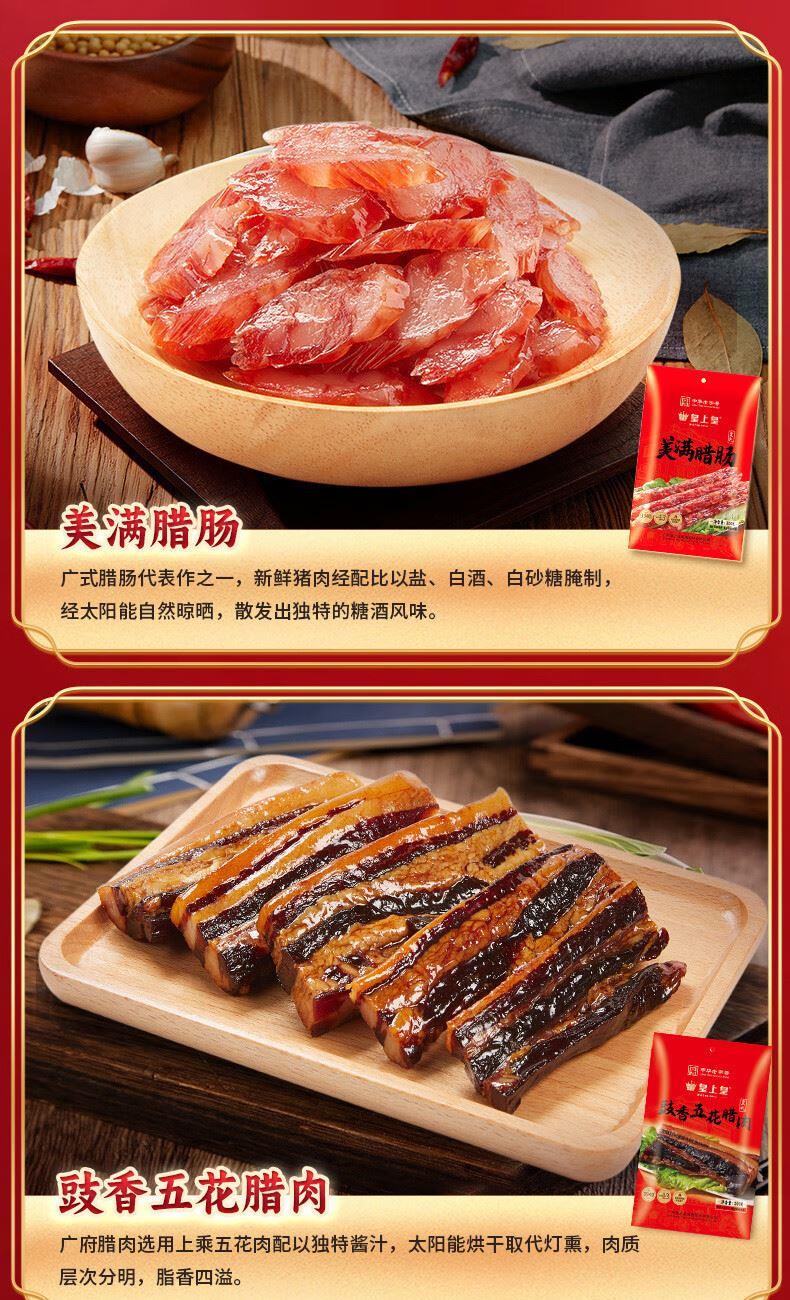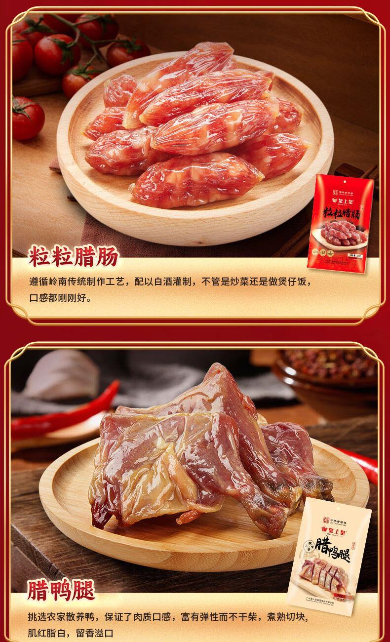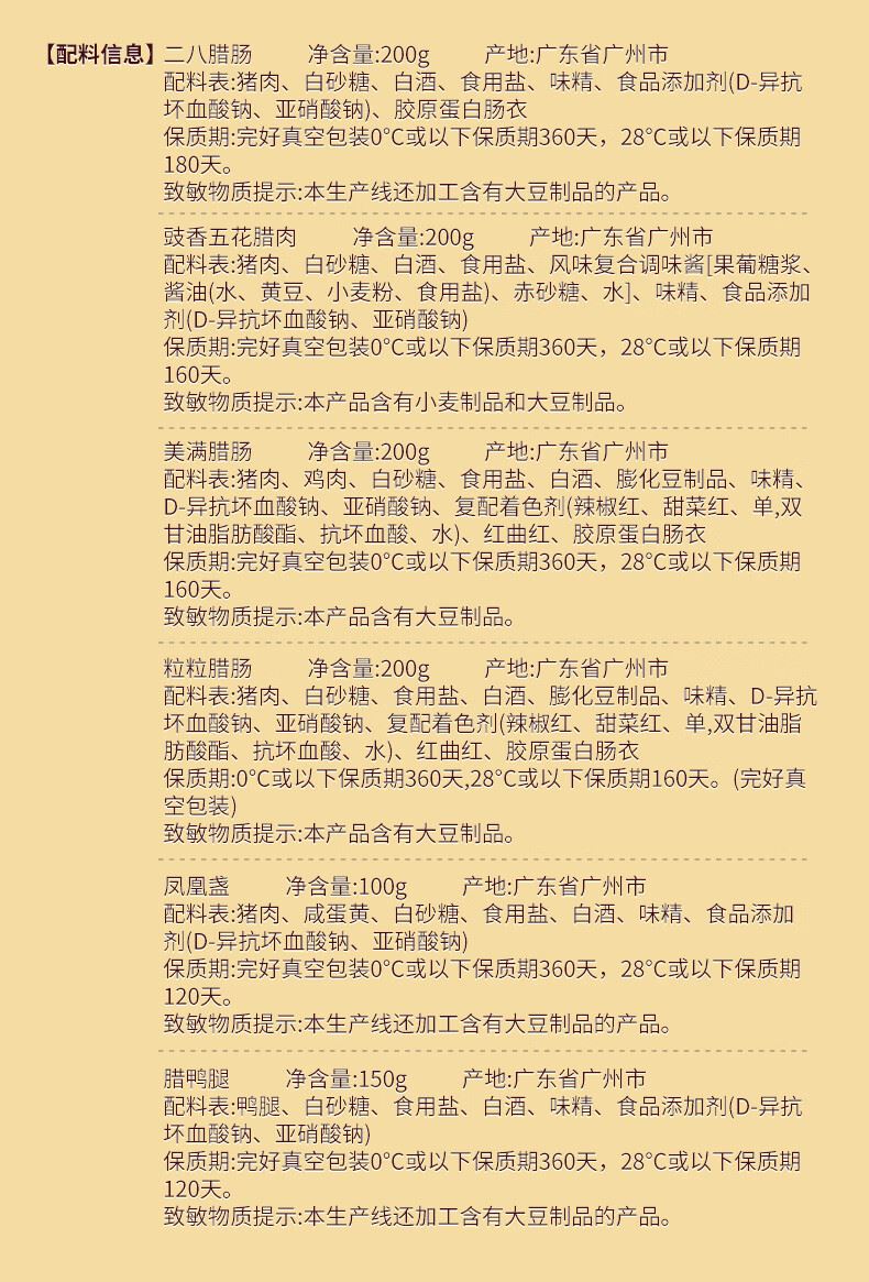 产地:广东 特产品类:广式腊肠 口味:原味 食用方法:烹饪食用 加工工艺:烘干 保质期:120天 内容物:美满腊肠200g(皇礼)、粒粒腊肠200g(皇礼)、豉香五花腊肉200g(皇礼)、凤凰盏100g(皇礼)、腊鸭腿150g(皇礼)、二八腊肠200g
