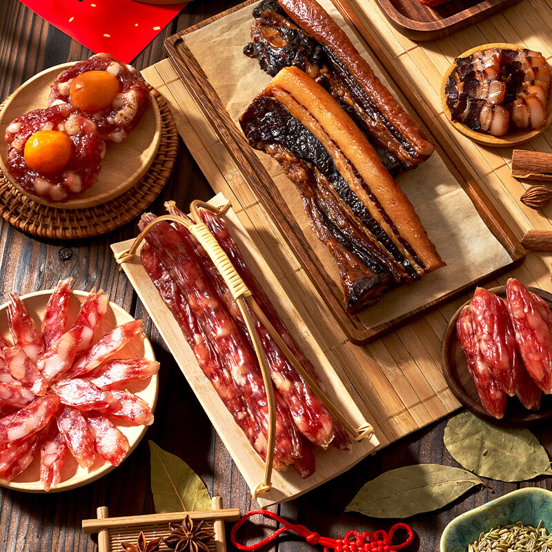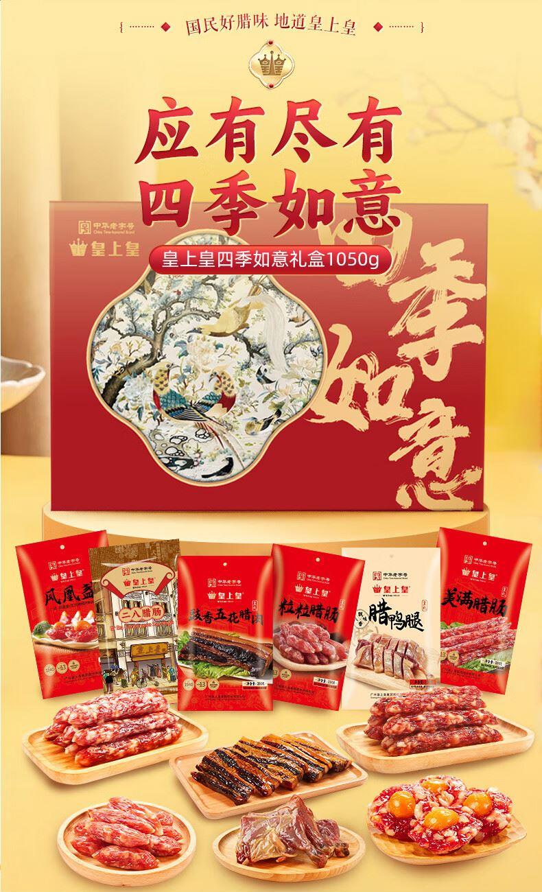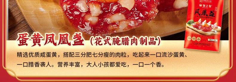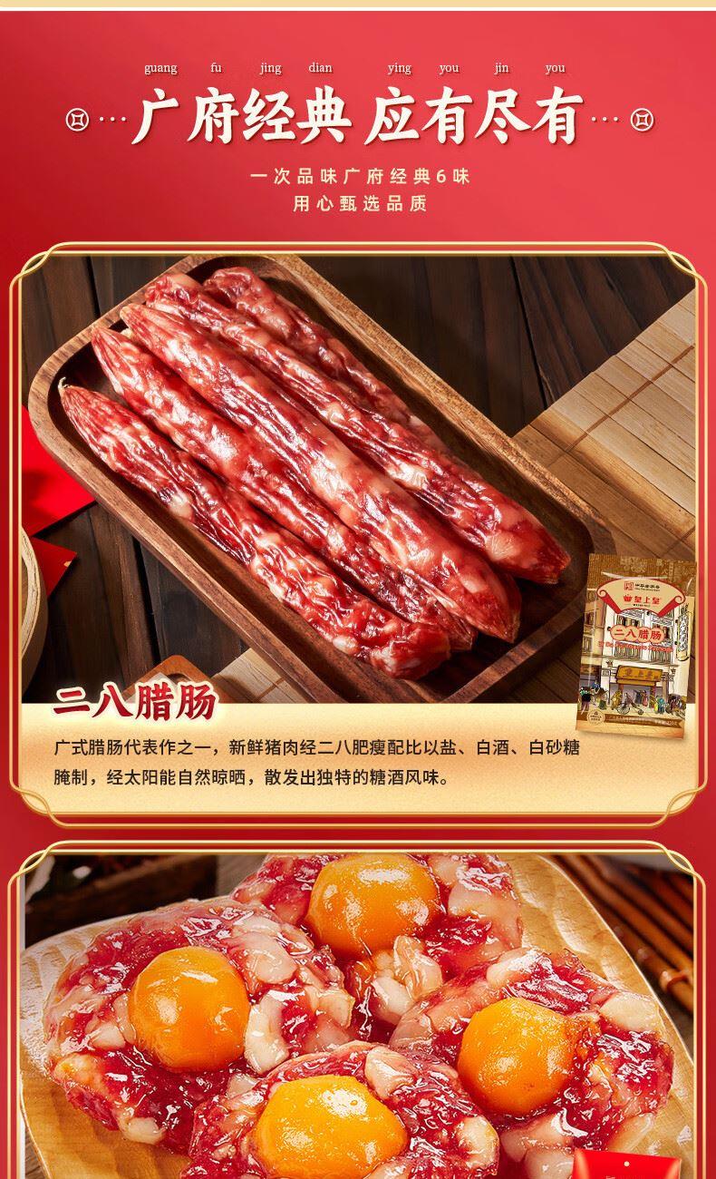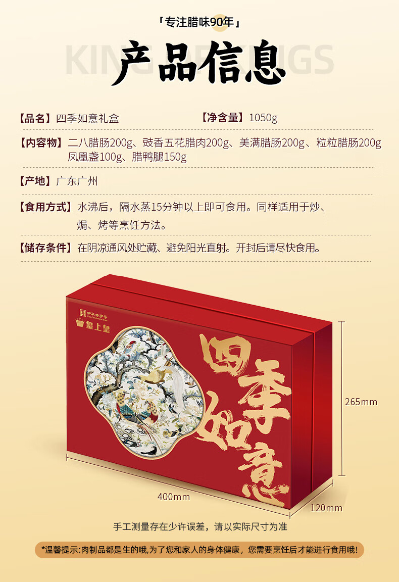 产地:广东 特产品类:广式腊肠 口味:原味 食用方法:烹饪食用 加工工艺:烘干 保质期:120天 内容物:美满腊肠200g(皇礼)、粒粒腊肠200g(皇礼)、豉香五花腊肉200g(皇礼)、凤凰盏100g(皇礼)、腊鸭腿150g(皇礼)、二八腊肠200g