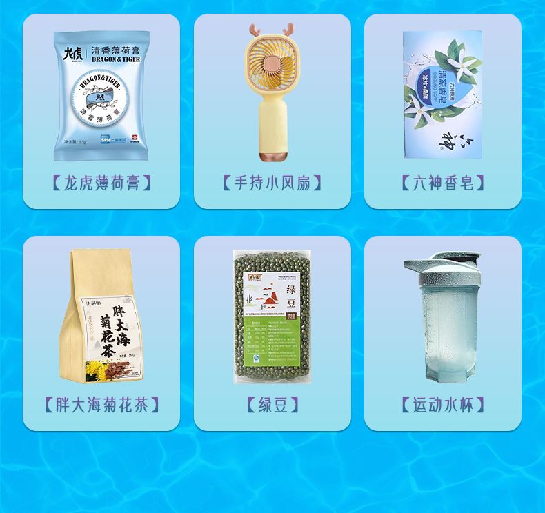 1.注:商城报价对应首张主图款式! 其他套装参考细节图,费用另计! 2. 咨询下单请备注好产品信息! 3.首图款式产品明细:防暑降温(套装一7件套):防晒冰袖1双 ,冷感毛巾1条,运动水杯1个,降温喷雾1瓶,龙虎花露水1瓶,龙虎薄荷膏1袋,网红袋1个