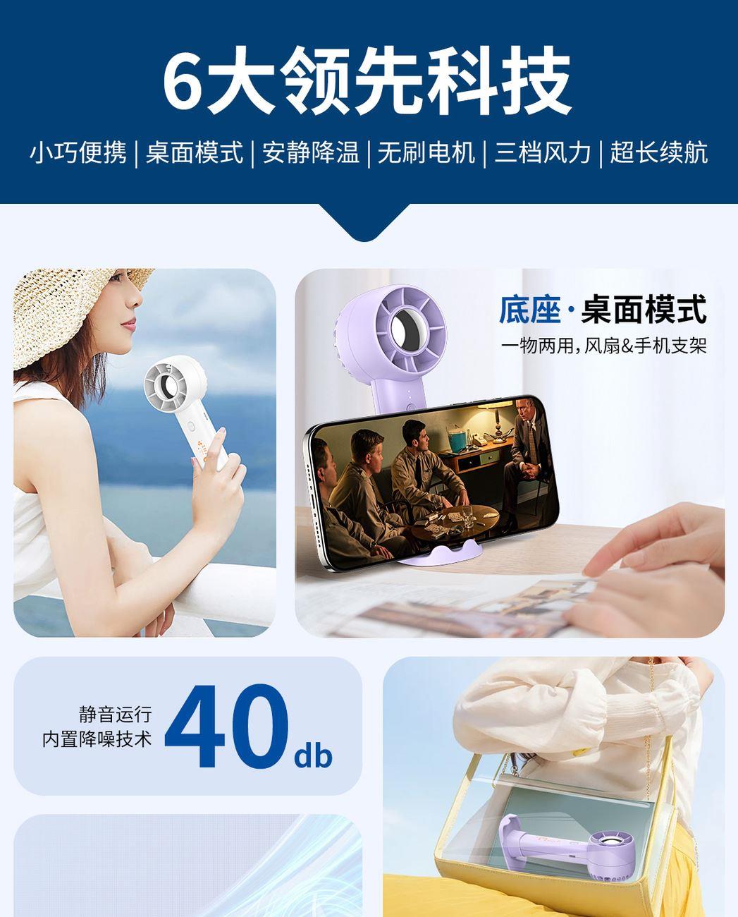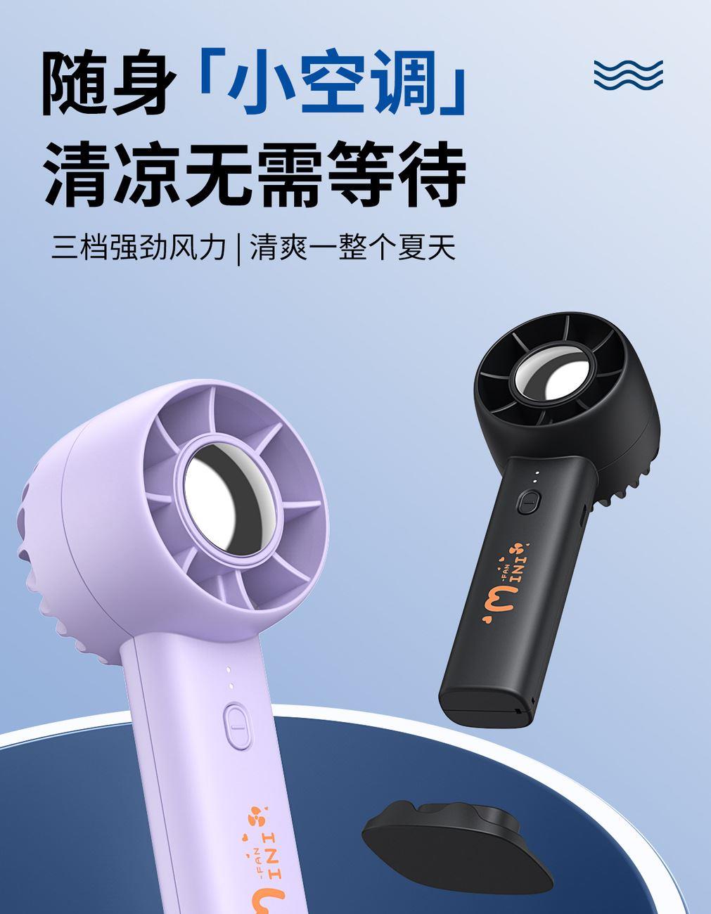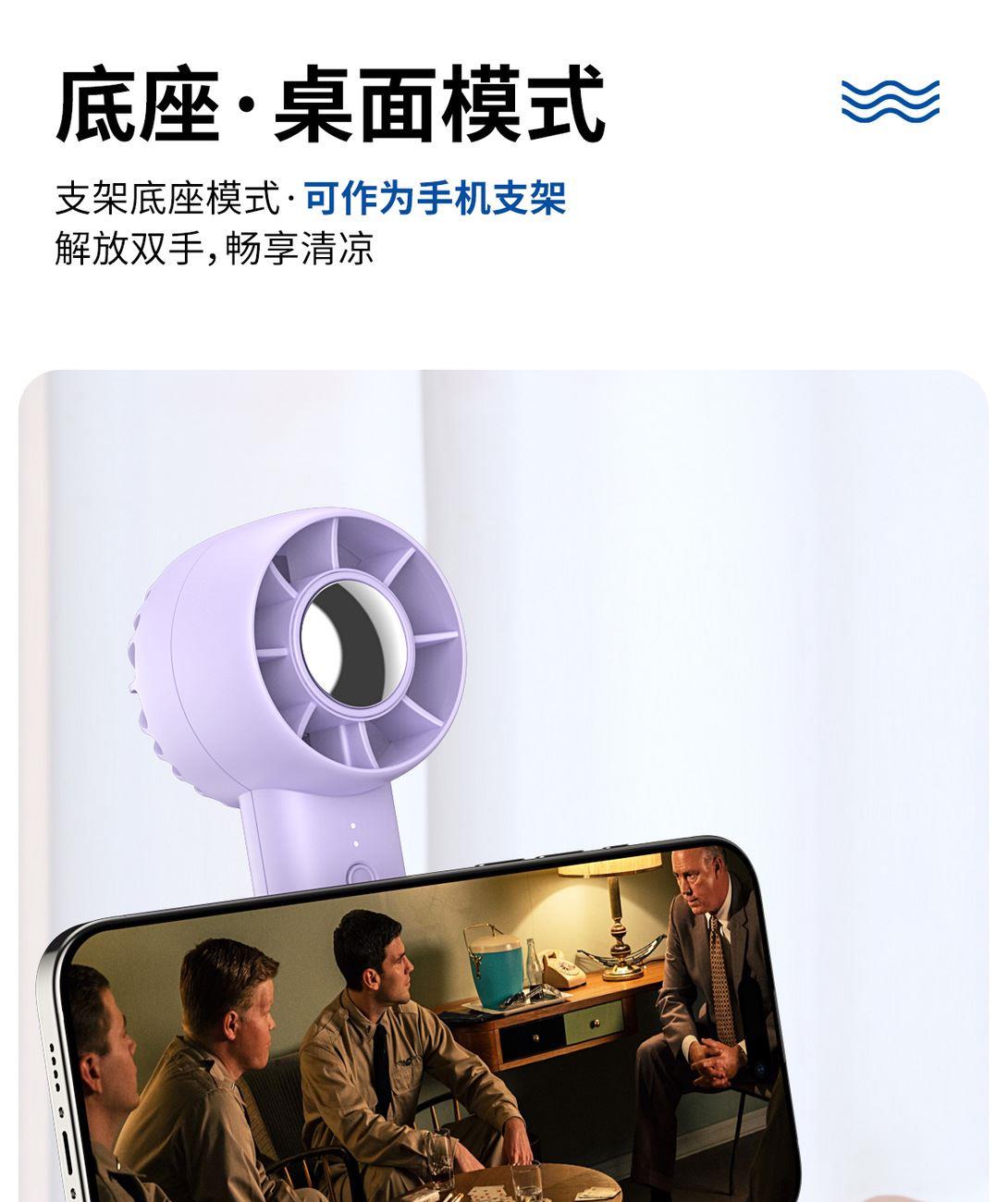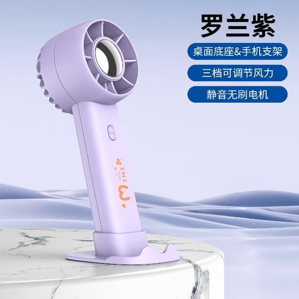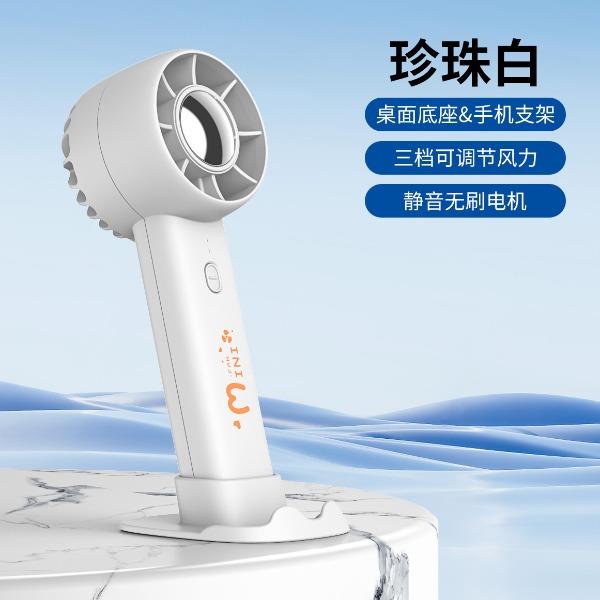 手持桌面支架小风扇 颜色:白色 黑色 紫色 材质:ABS 产品尺寸:162*53*63mm 包装尺寸:170*60*70mm 容量:400mAh 外箱尺寸:54.5*31*31cm 包装:彩盒包装 数量:100PCS/箱 推荐理由 精致小巧,方便携带 三档风速可调 桌面/手持 多种使用方法 支架功能可做手机支架