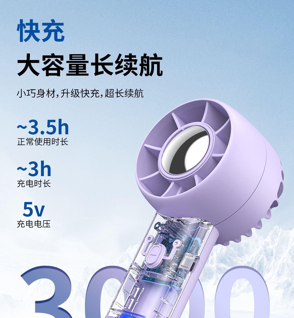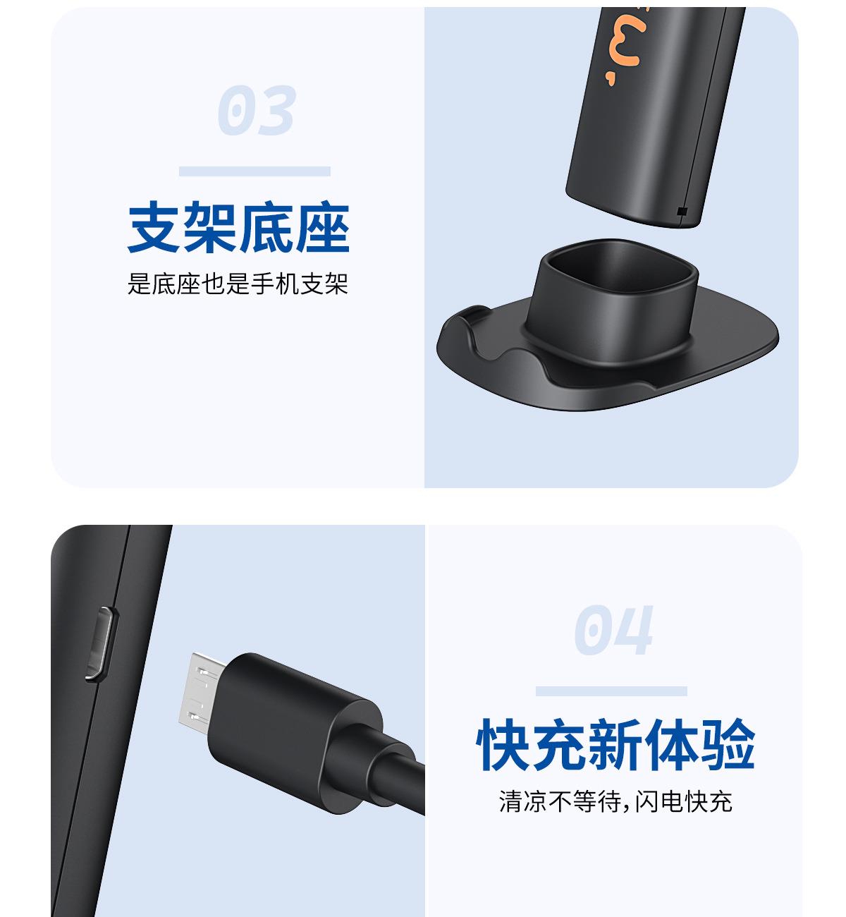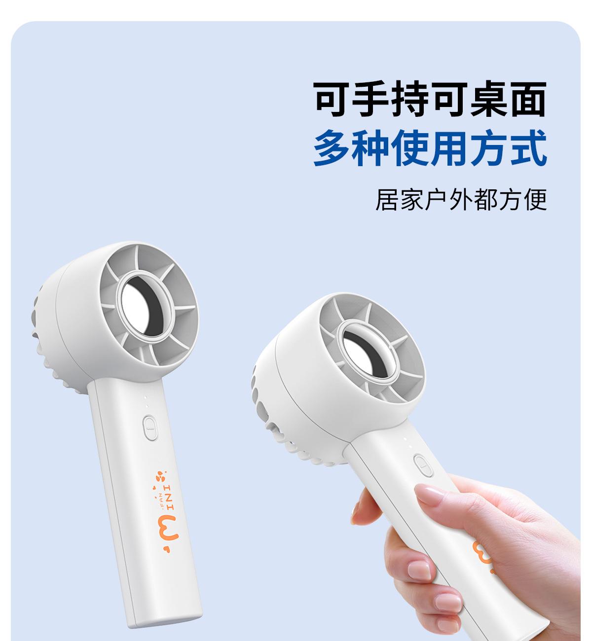 手持桌面支架小风扇 颜色:白色 黑色 紫色 材质:ABS 产品尺寸:162*53*63mm 包装尺寸:170*60*70mm 容量:400mAh 外箱尺寸:54.5*31*31cm 包装:彩盒包装 数量:100PCS/箱 推荐理由 精致小巧,方便携带 三档风速可调 桌面/手持 多种使用方法 支架功能可做手机支架