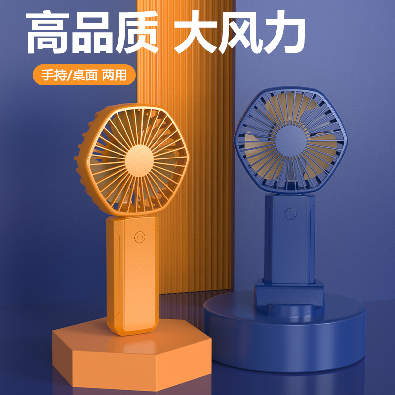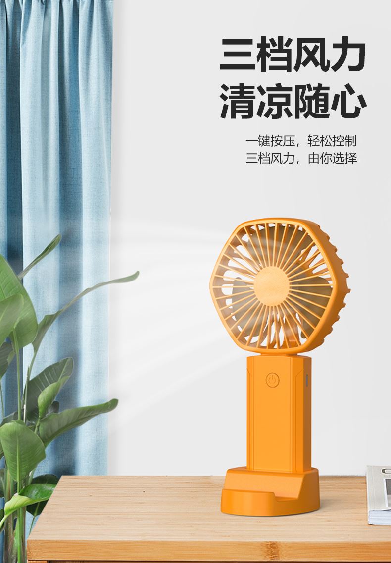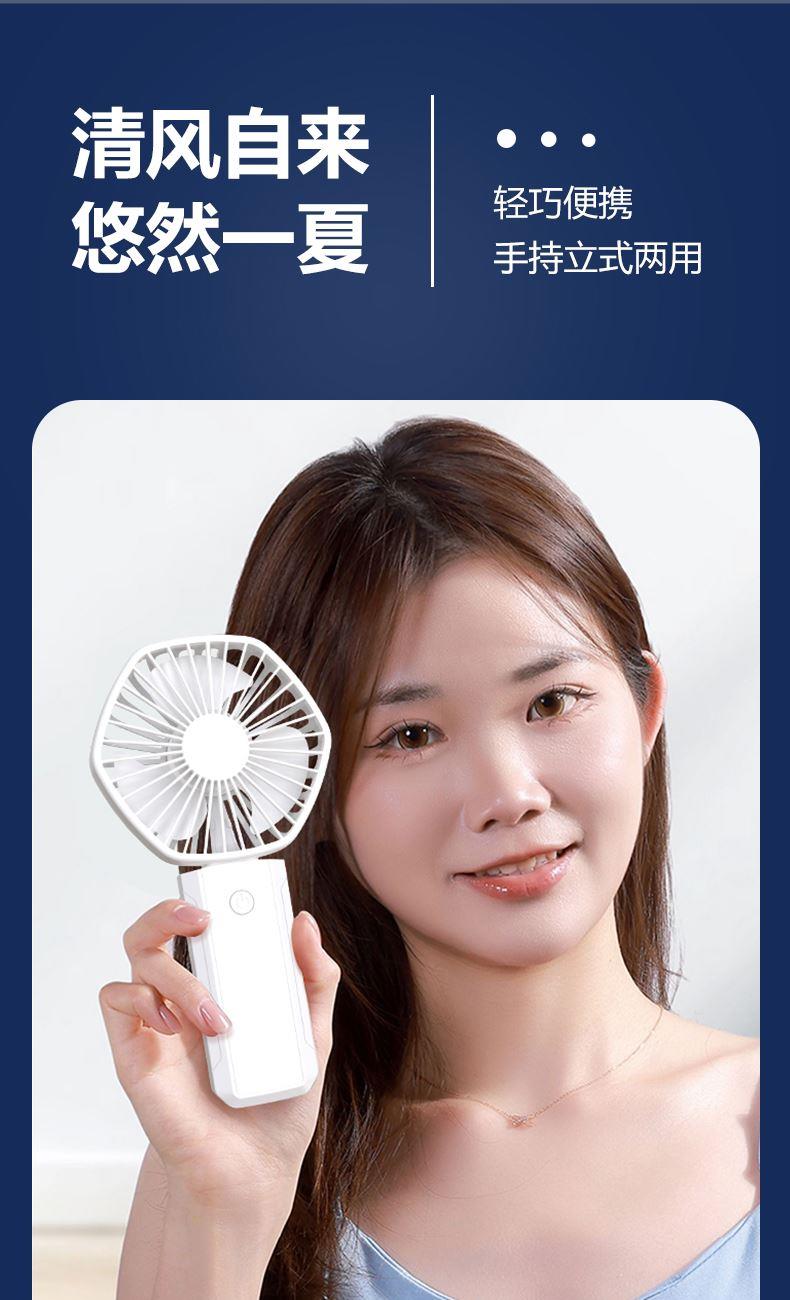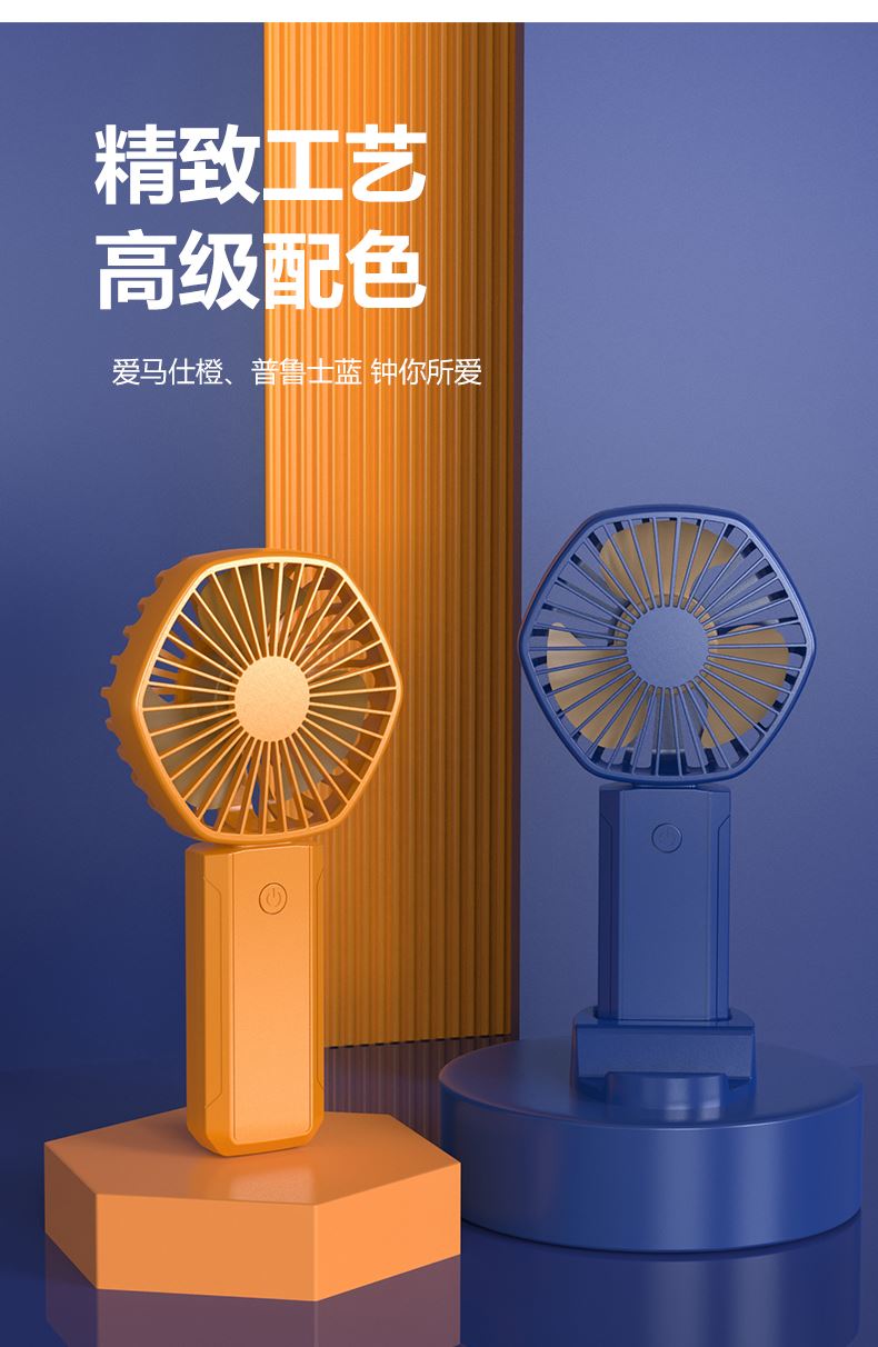 【推荐理由】: 精致小巧,方便携带 支架功能可做手机支架 三档风速可调 桌面/手持 多种使用方法 颜色:蓝色 白色 橙色 尺寸:180*90*27mm 容量:300mAh 包装:彩盒包装