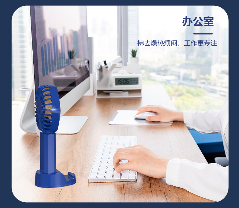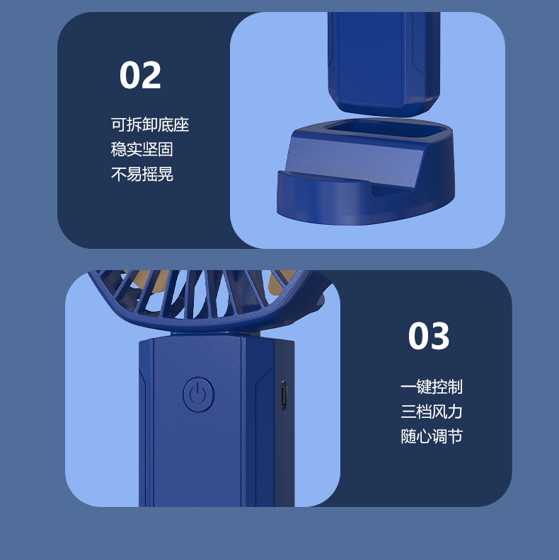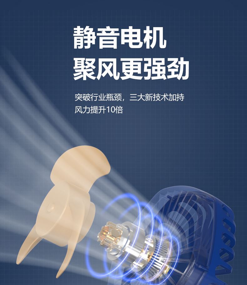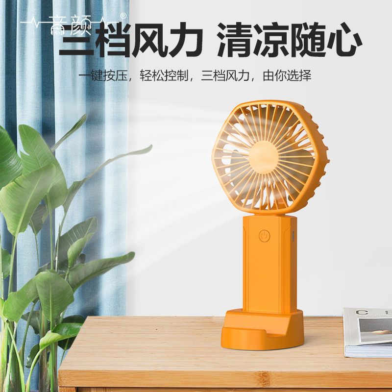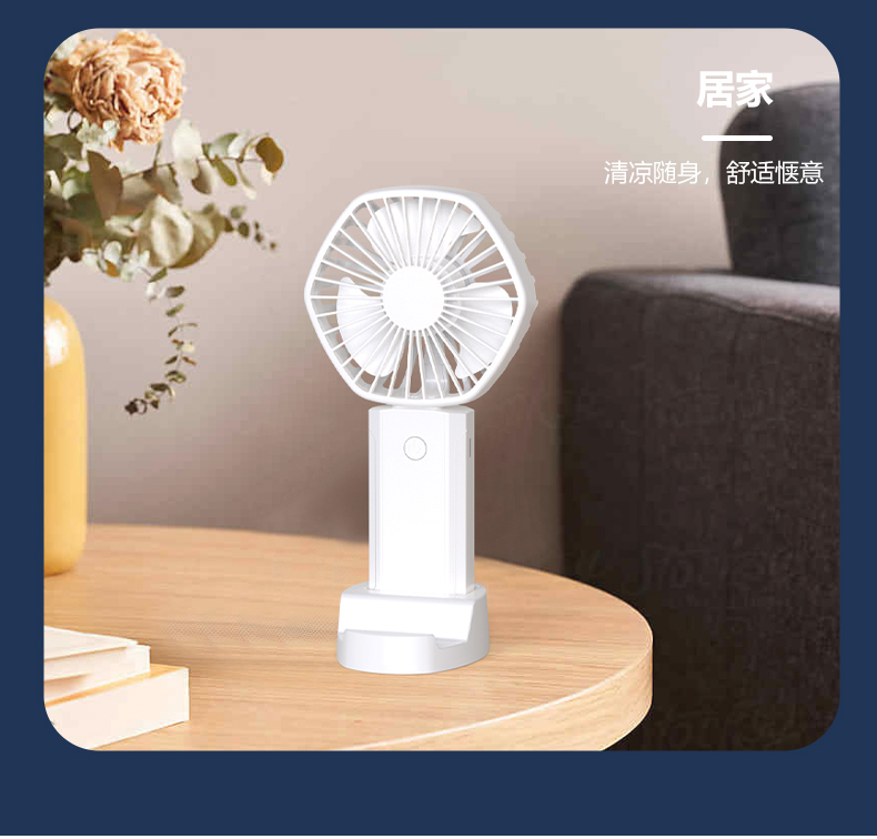 【推荐理由】: 精致小巧,方便携带 支架功能可做手机支架 三档风速可调 桌面/手持 多种使用方法 颜色:蓝色 白色 橙色 尺寸:180*90*27mm 容量:300mAh 包装:彩盒包装