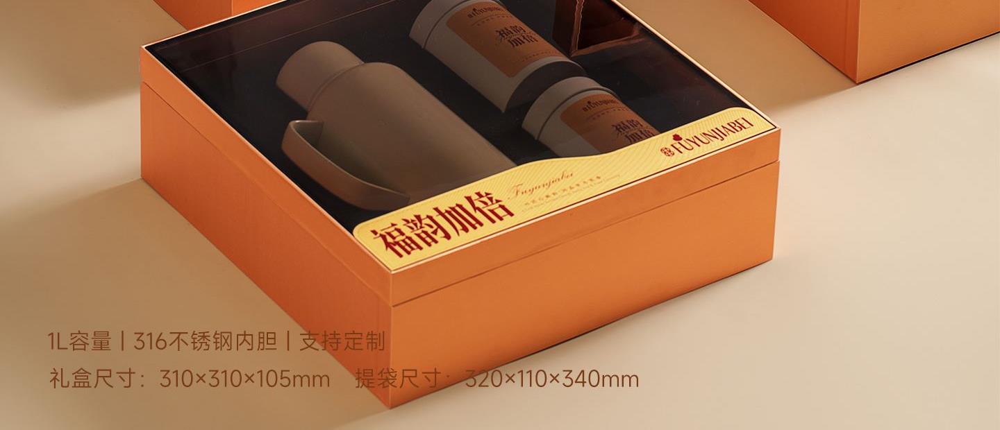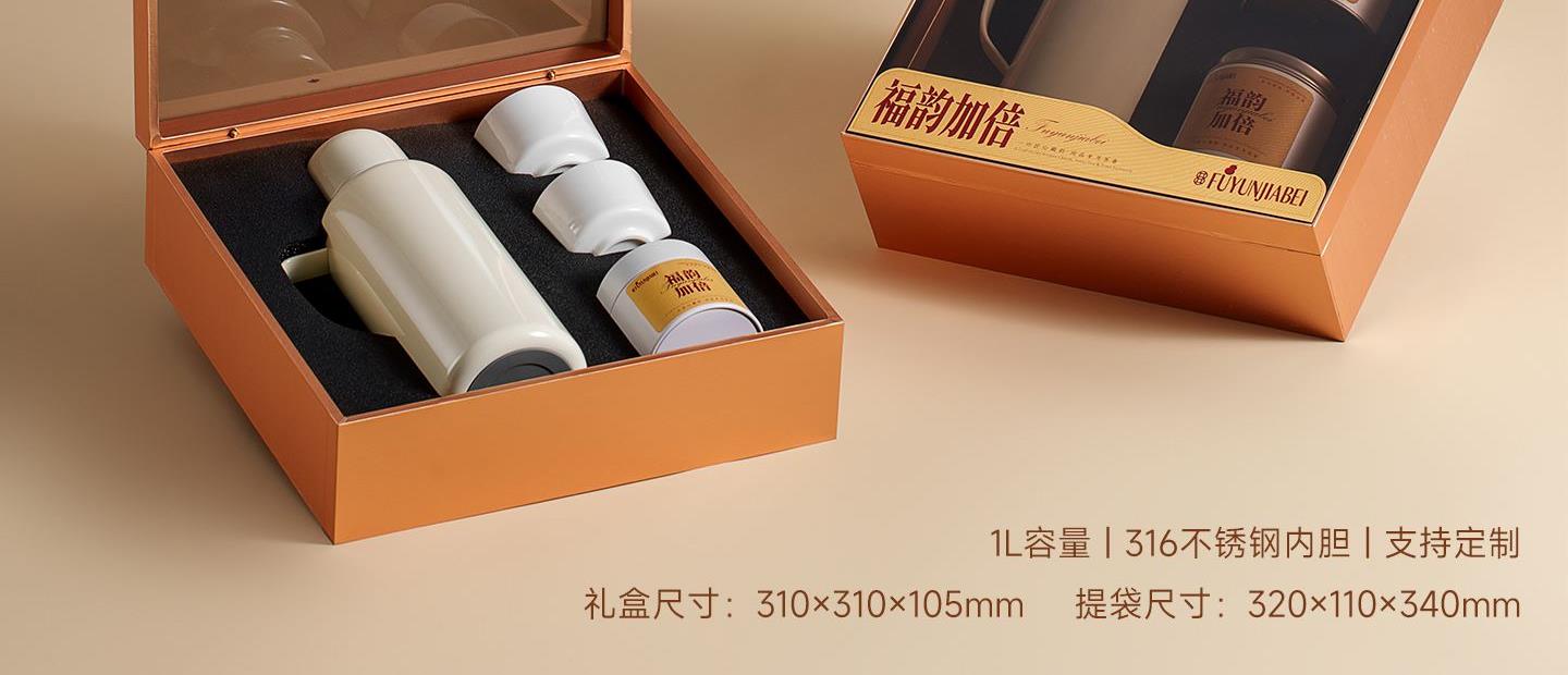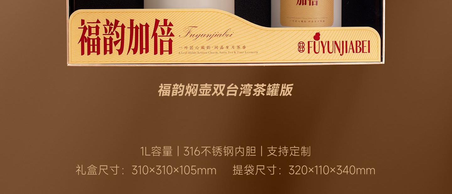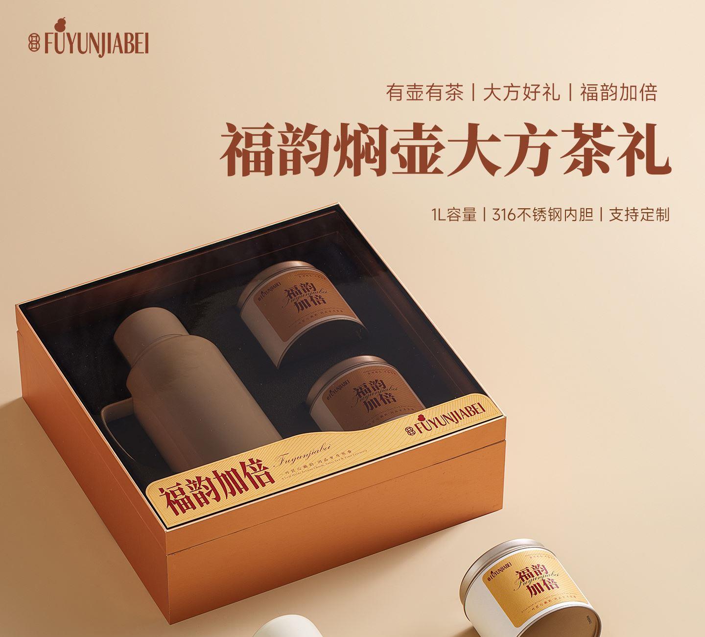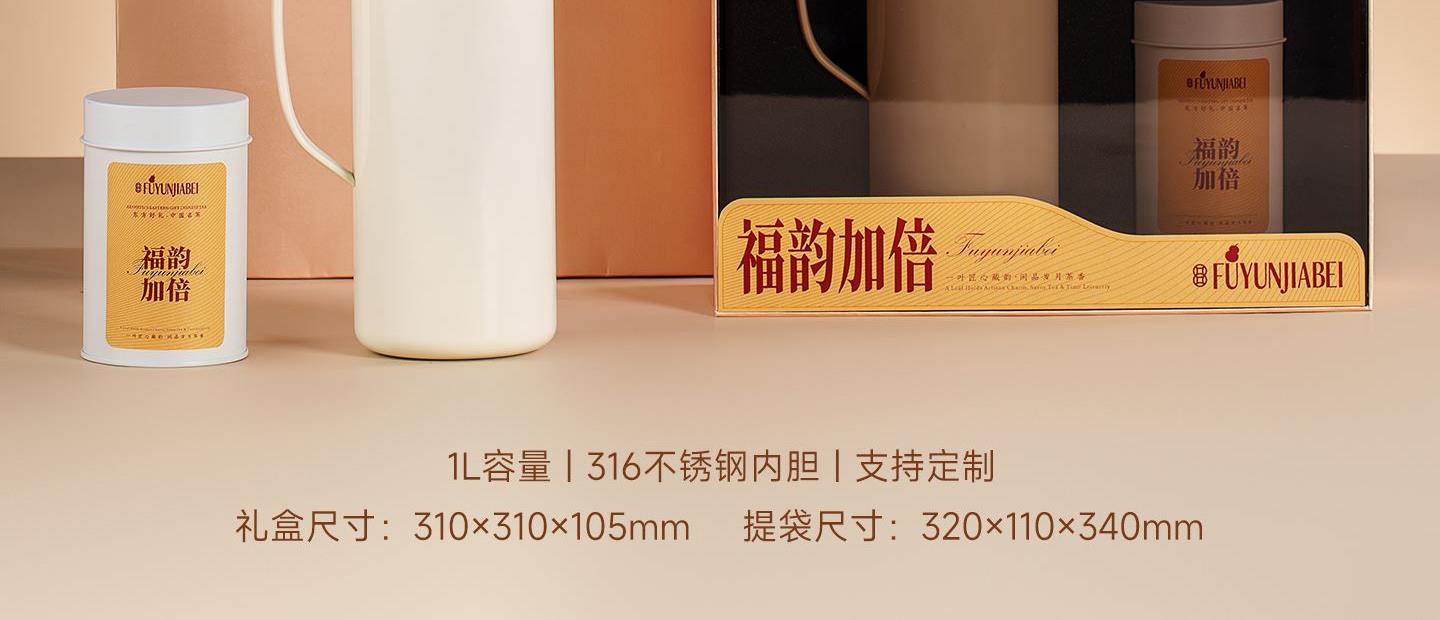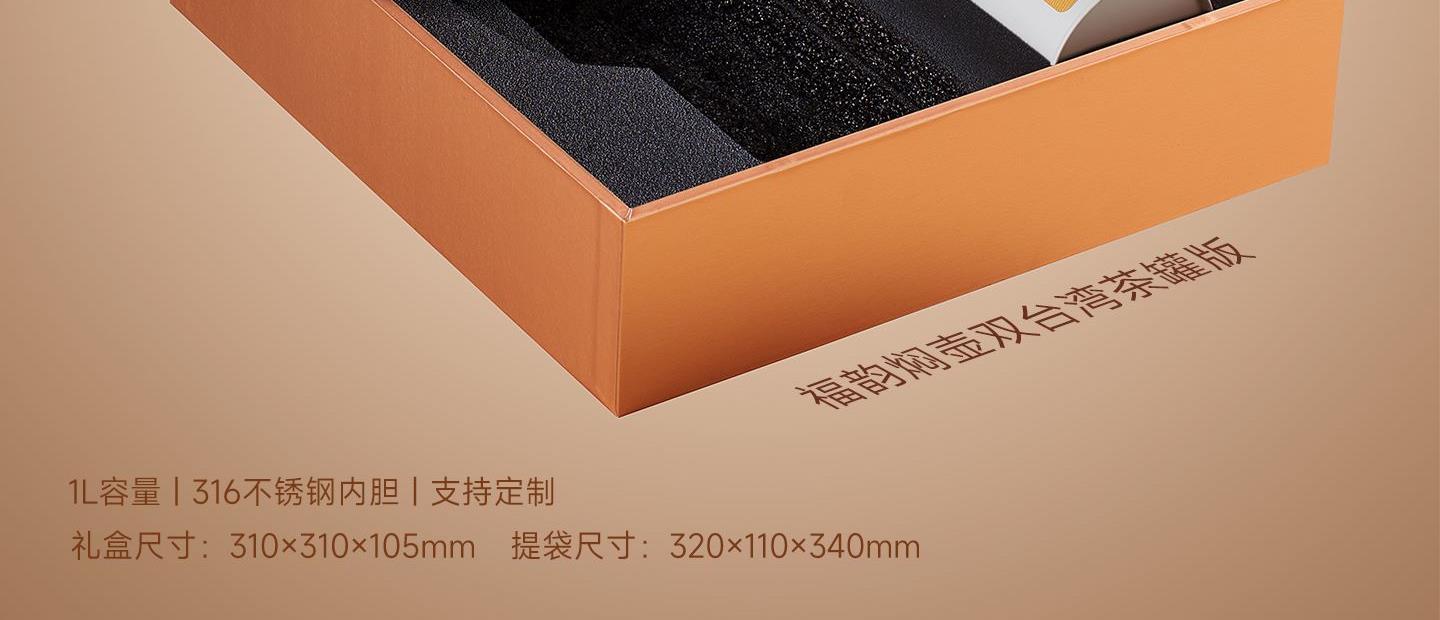福韵加倍——大方茶礼 规 格:礼盒:310x310x105mm 手提袋:320x340x110mm 材 质:焖泡壶:316不锈钢 容量:1000ml 茶 叶:定制版 磻龙号2016老树寿眉白茶龙珠 3克/颗 120g*2 罐 手提袋:纸袋*1 寓 意:福韵加倍 幸福美好 大方送礼 场 景:节日礼 | 员工福利 | 积分兑换 | VIP礼品 定 制:壶身、罐身可做丝印,UV专版定制 颜 色: 米白色 爱马仕橙