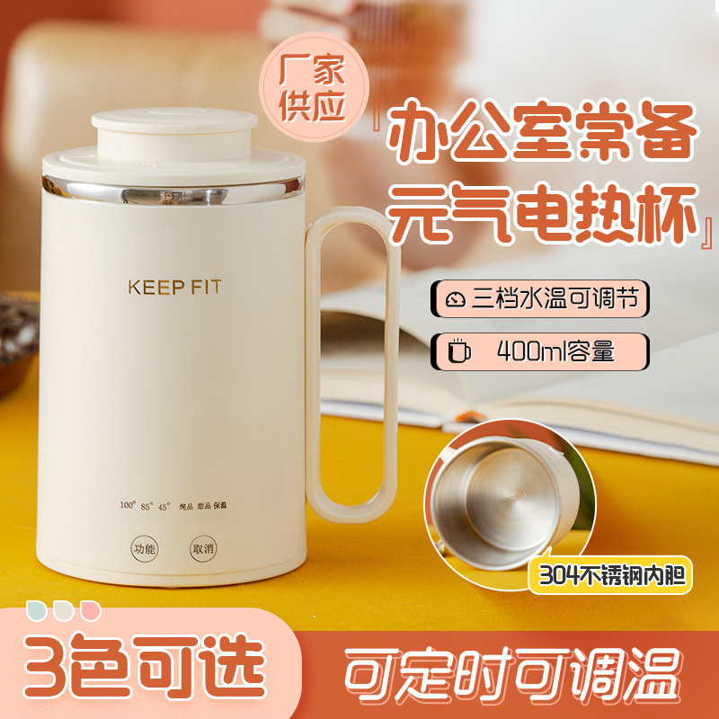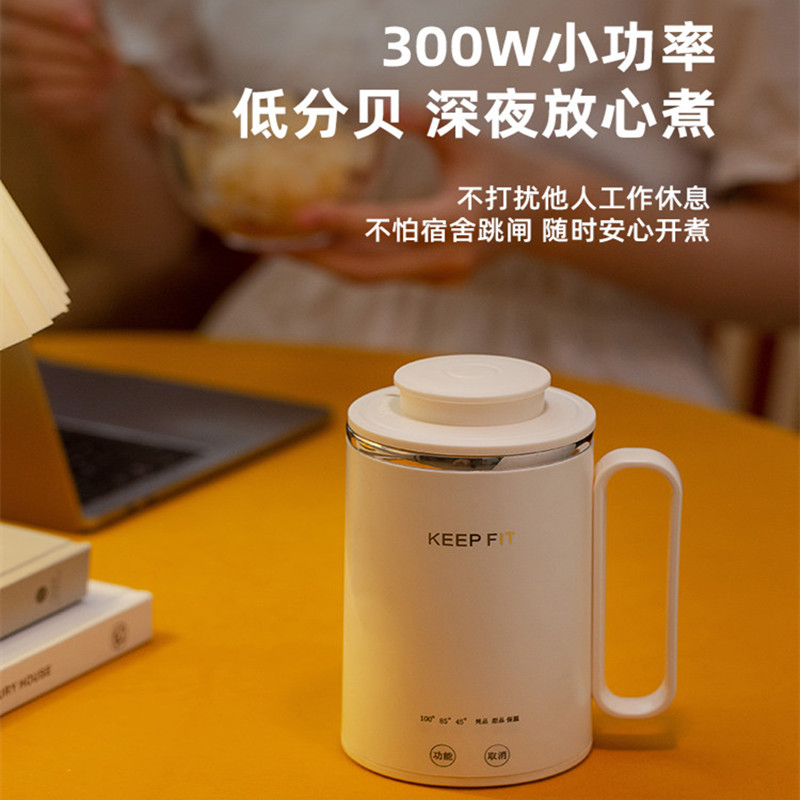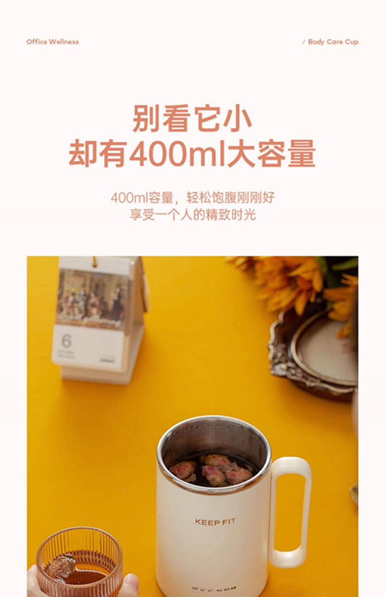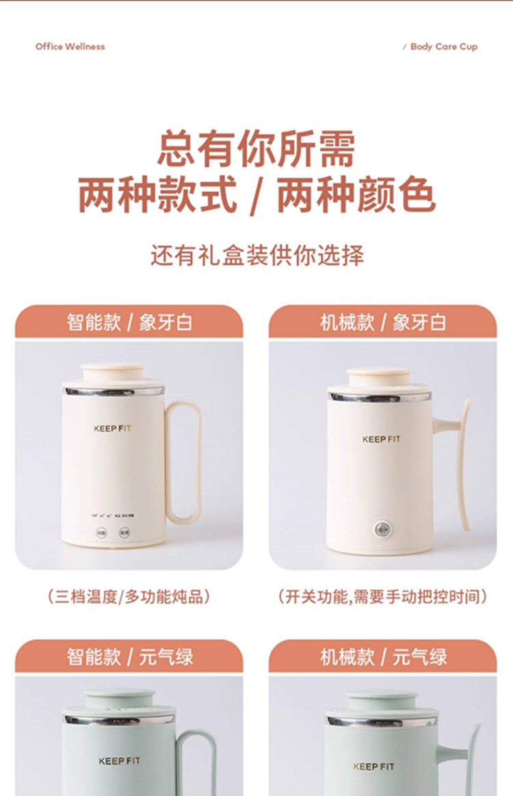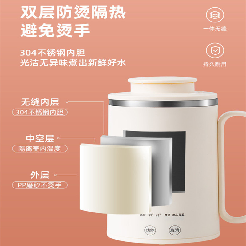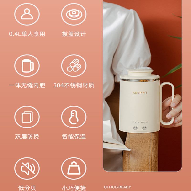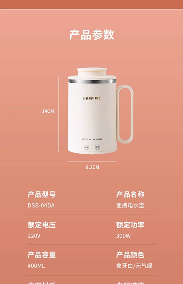 额定功率:300W 额定电压:220V 产品颜色:元气绿/樱花粉/象牙白 产品容量:400ML 产品款式:智能款 包装清单:主机、滤网、电源线、说明书 包装尺寸:13*13*17.5(cm) 特色功能 1、食品级食品可接触304不锈钢内胆 耐腐蚀材质 2、携带方便,出行好伴侣,轻巧实用颜值高 3、机械款方便操作,即插即用人体工程学 4、温度随意调节,45-85-100°;舒适提手,细密滤网,透气盖口 5、电热杯/水杯二合一,三挡水温
