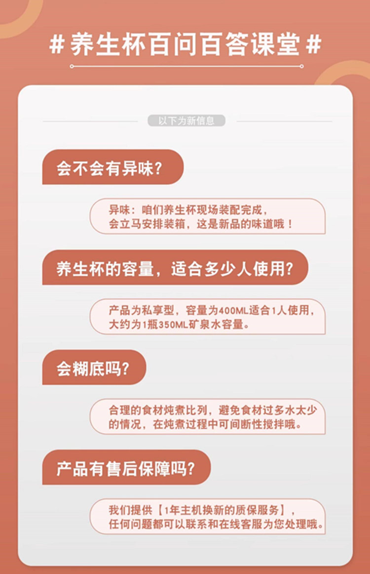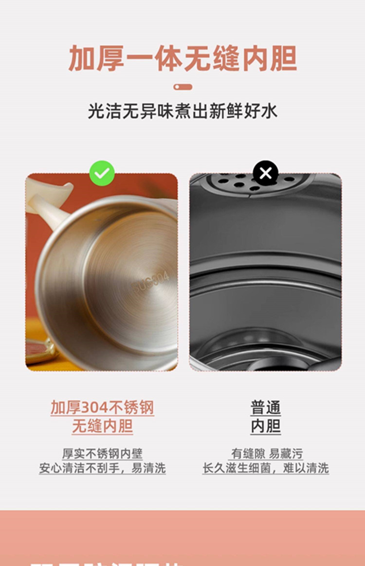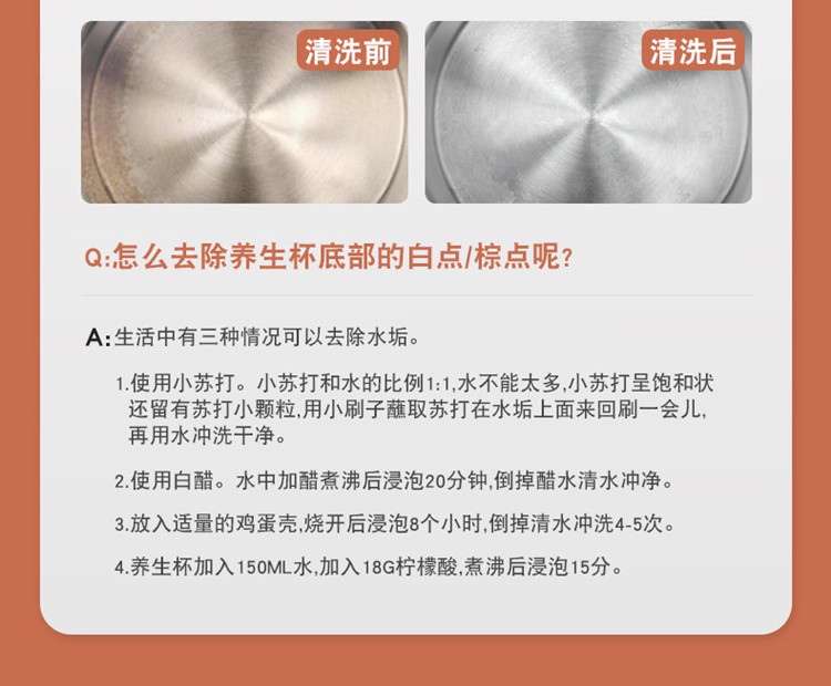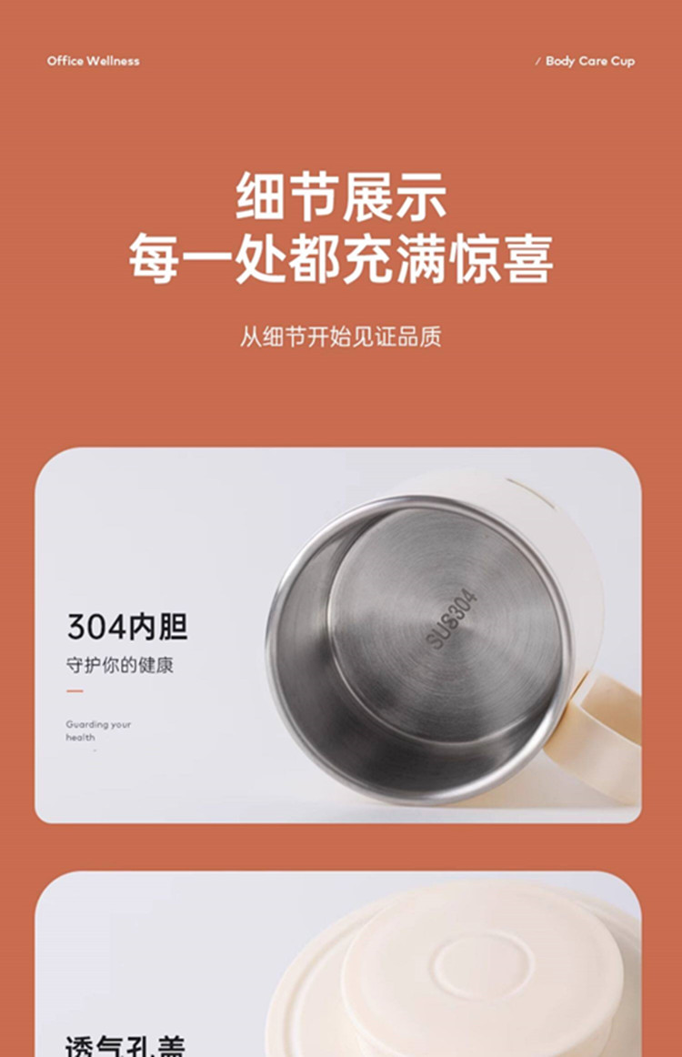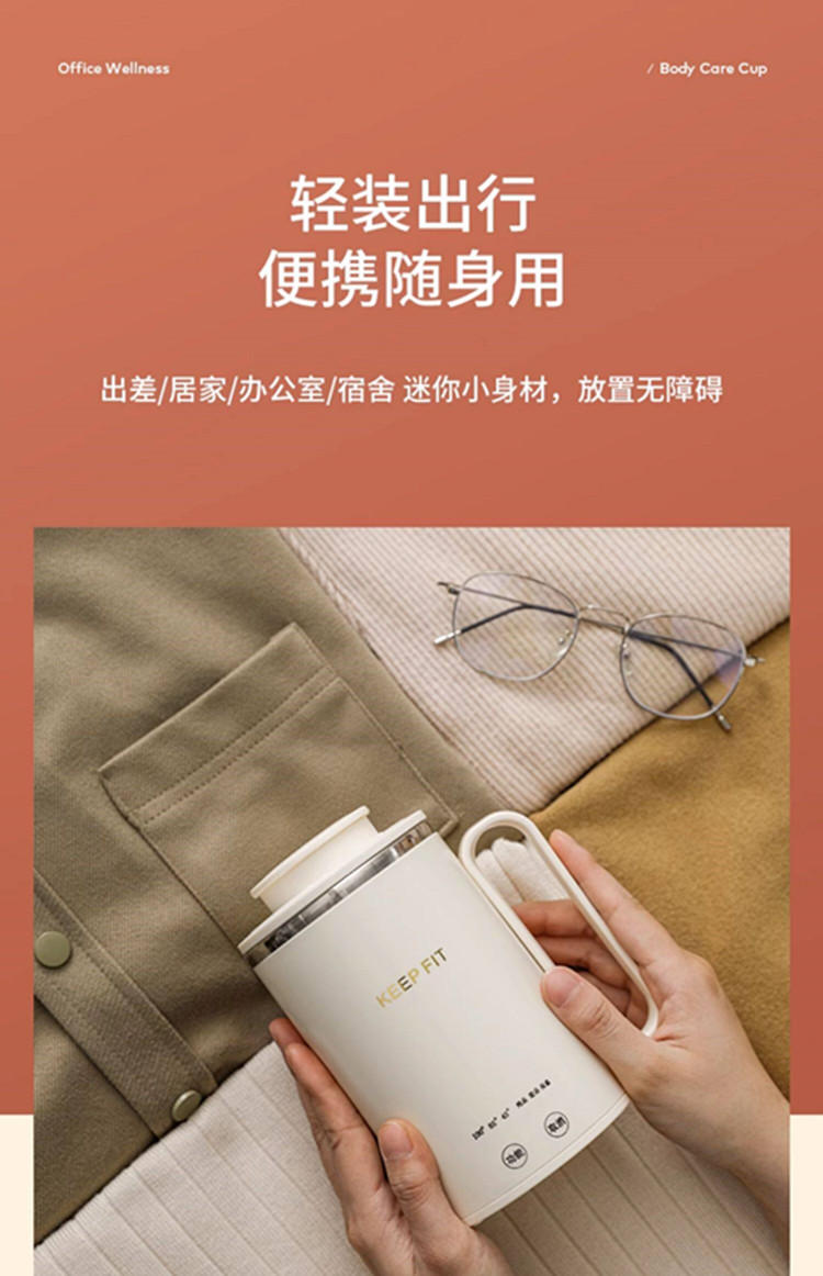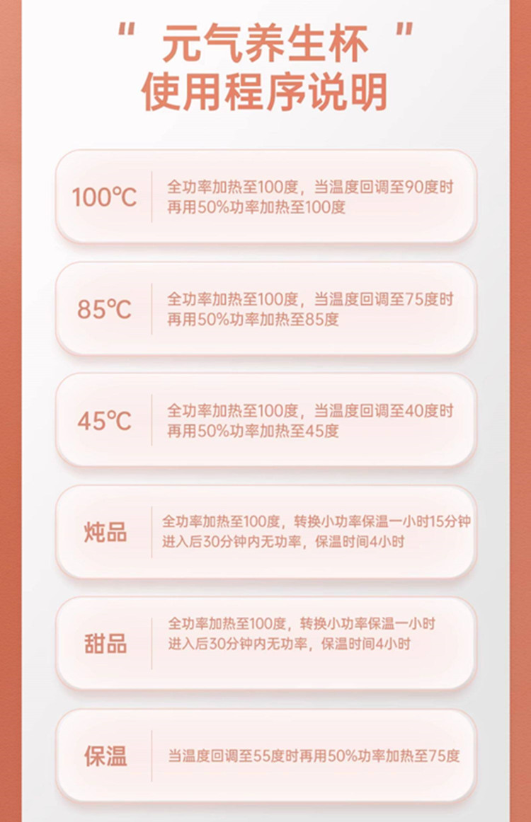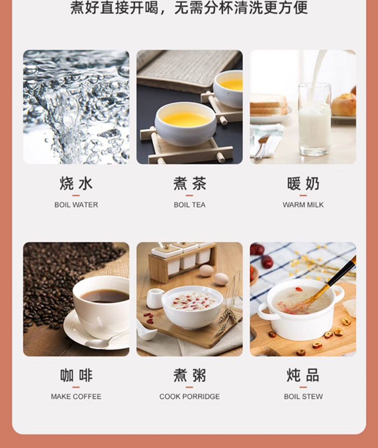 额定功率:300W 额定电压:220V 产品颜色:元气绿/樱花粉/象牙白 产品容量:400ML 产品款式:智能款 包装清单:主机、滤网、电源线、说明书 包装尺寸:13*13*17.5(cm) 特色功能 1、食品级食品可接触304不锈钢内胆 耐腐蚀材质 2、携带方便,出行好伴侣,轻巧实用颜值高 3、机械款方便操作,即插即用人体工程学 4、温度随意调节,45-85-100°;舒适提手,细密滤网,透气盖口 5、电热杯/水杯二合一,三挡水温