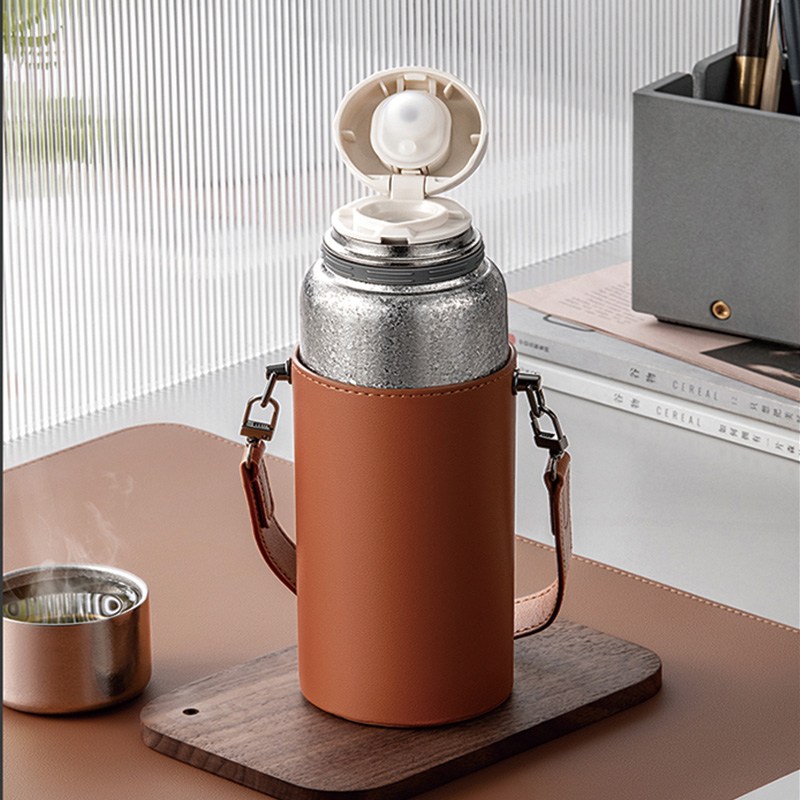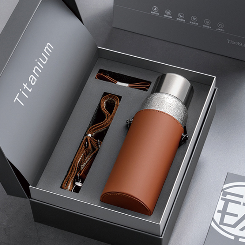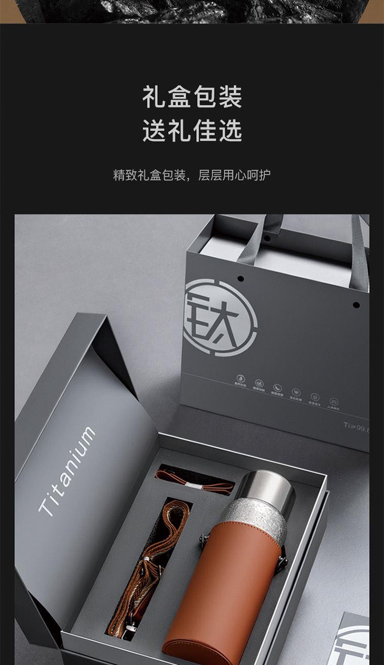 产品参数:1、产品容量:450ml 2、材质:内外纯钛 3、产品净重:247g±10g 4、包装标准:大/小礼盒+礼袋 5、颜色:皓月银、冰川蓝 6、尺寸信息:高:20cm,直径7.5cm 产品特点: 1、整杯纯钛打造,保鲜饮品更安全;2、一键按压开关,轻松畅快补水;3、倒饮、直饮两种饮水方式,饮水不受限,开启趣味饮水时刻; 4、自带纯钛茶隔,熟茶久焖更香醇; 5、精致皮革杯套,可拎可背,出街必备。