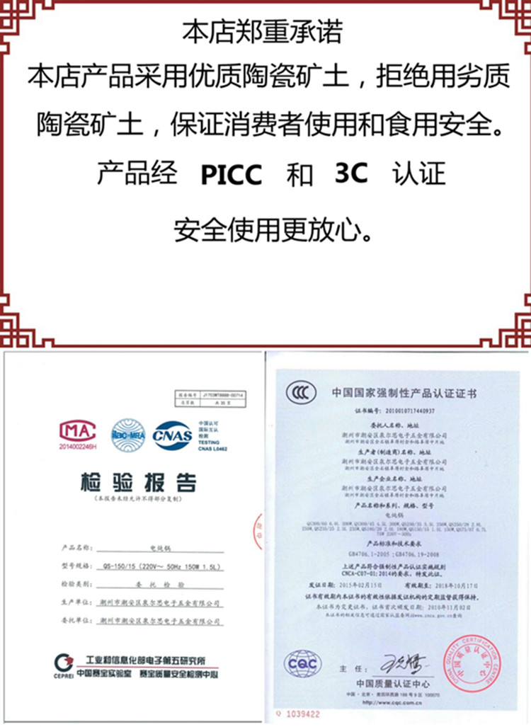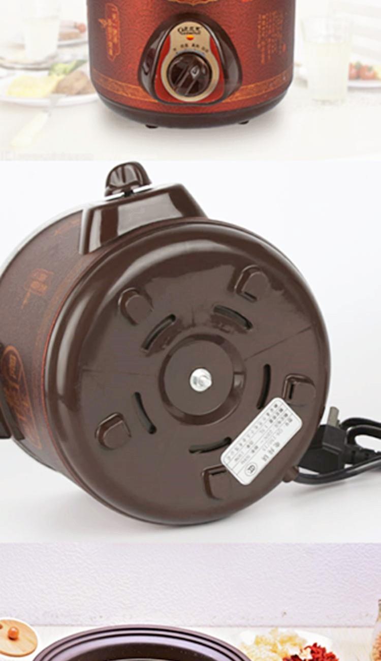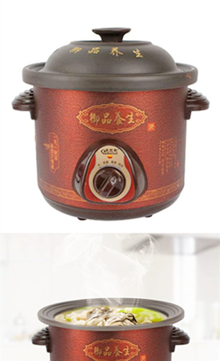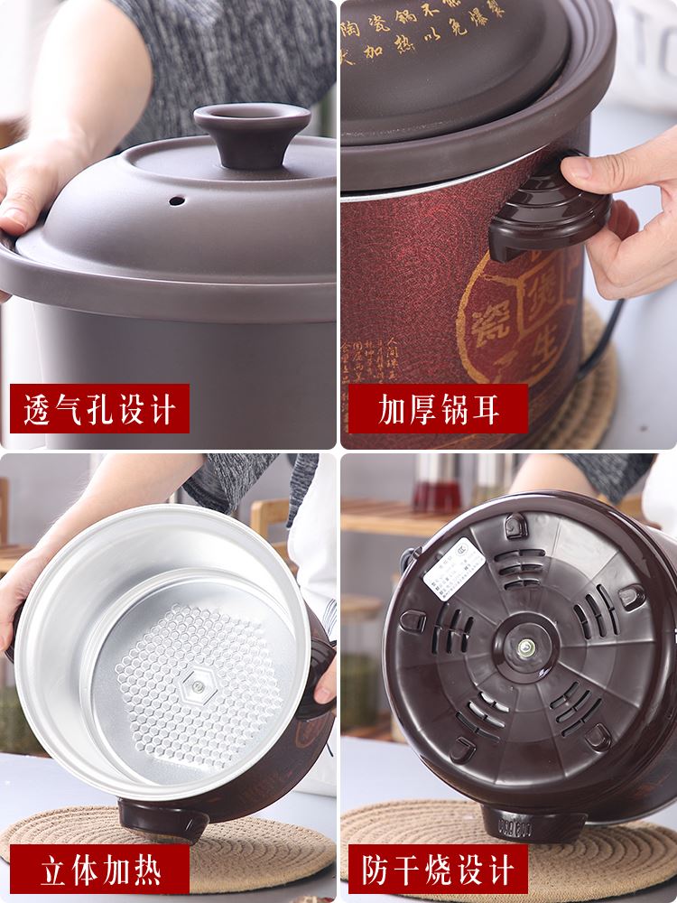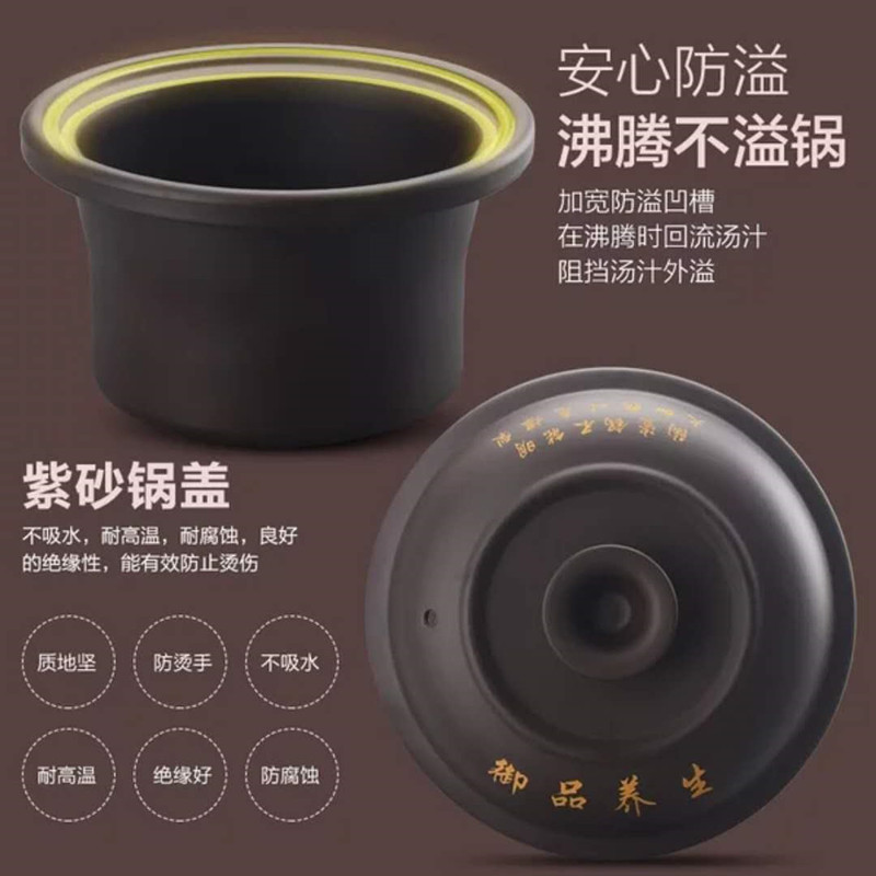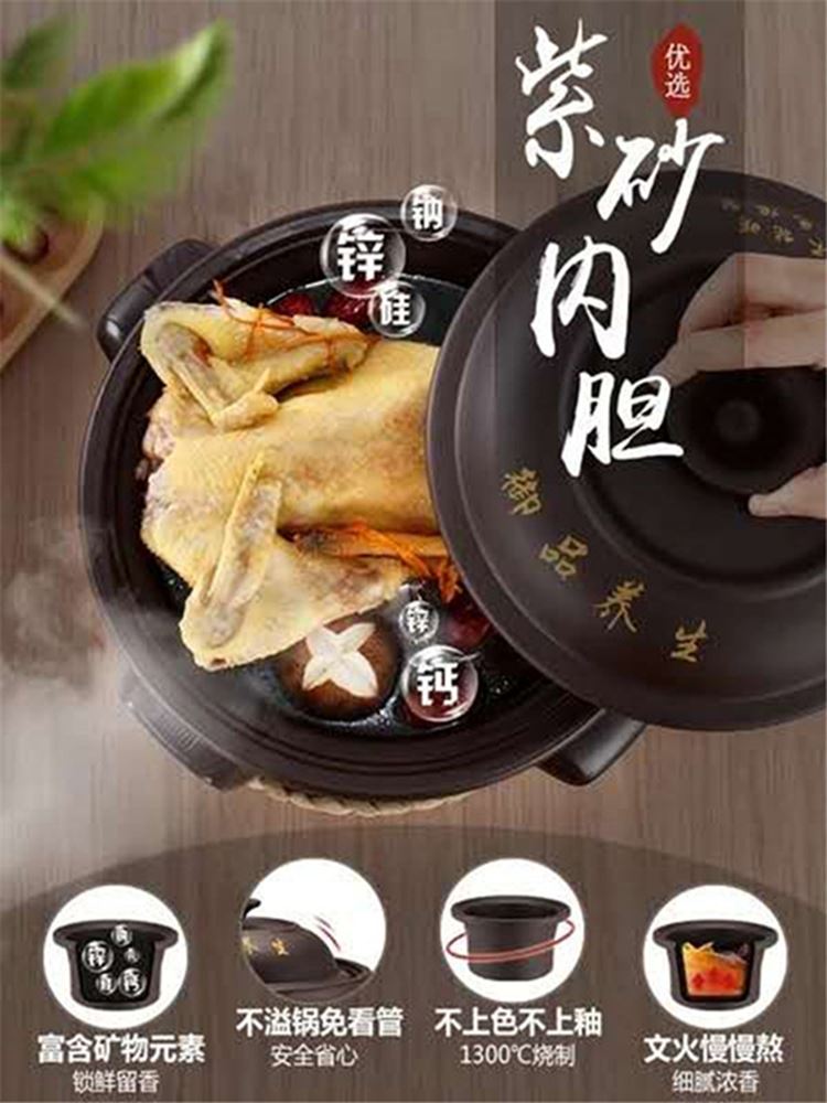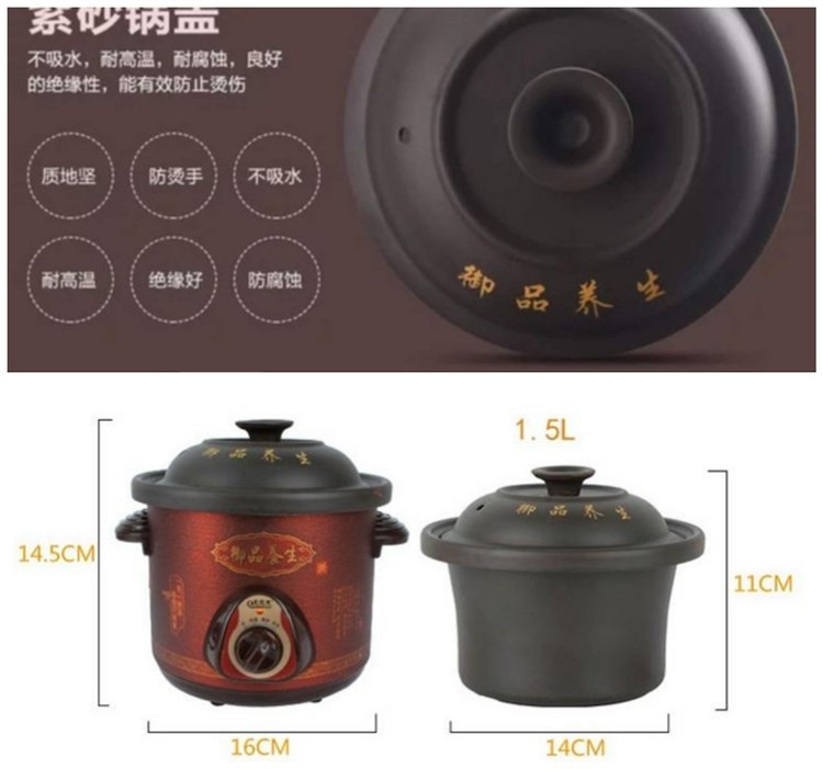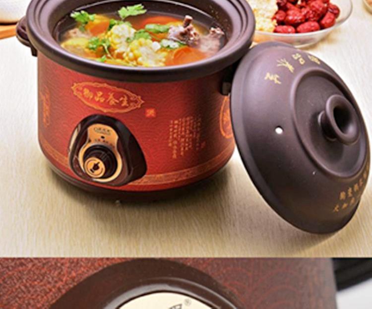 额定功率:135W/235w 额定电压:220V 产品颜色:本色 主机容量:1.5L 产品款式:机械款 包装清单:主机、透明盖、蒸格、电源线、说明书 特色功能 1、机械款,分体设计;可视化锅盖,紫砂瓷内胆。 2、精选陶瓷内胆,烹饪不串味。悬空精熬慢炖 3、铝锅发热盘,导热快;紫瓷内胆,天然瓷土无污染 4、PP防烫把手,防止防烫双手;防溢理念易清洗 5、天然瓷土,安全健康,机械档位简单操作一机多用;