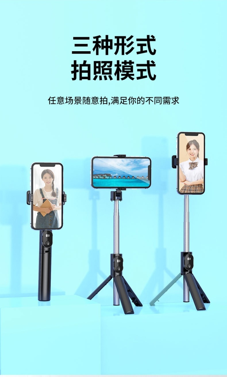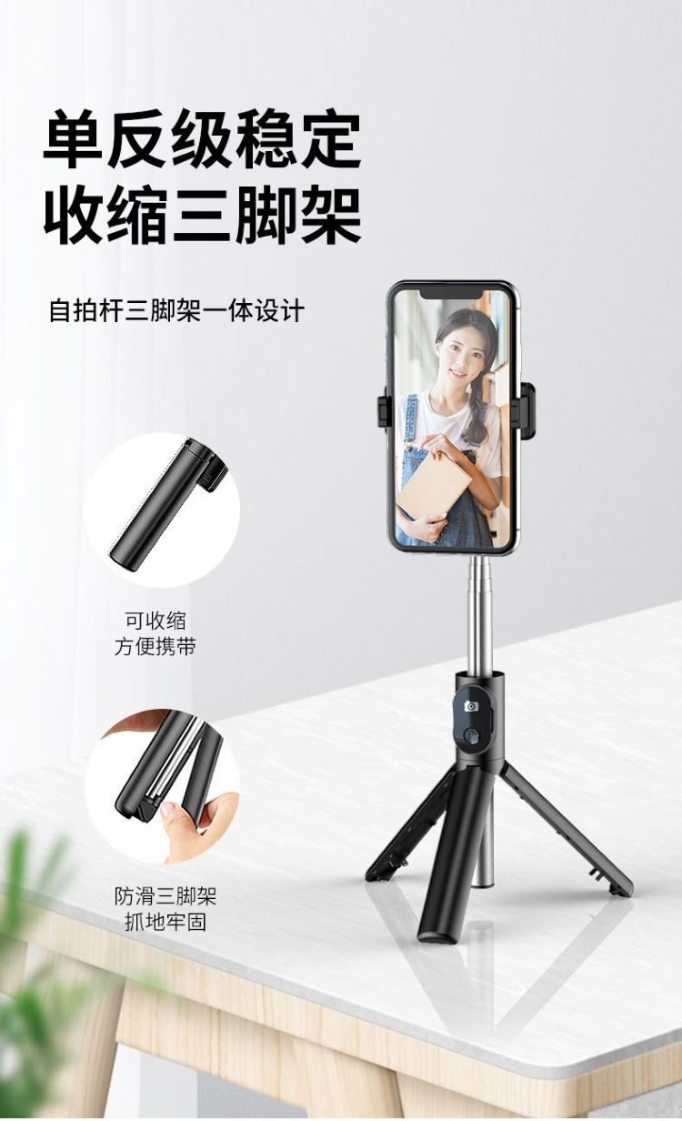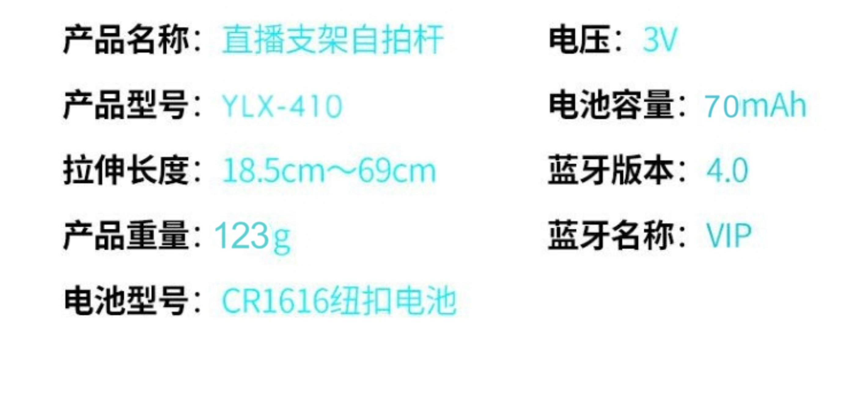 主 材 质: 不锈钢+ABS 产品颜色: 黑色 白色 净 重: 123g 载 重 量: 500g 可夹范围:65-65mm 伸缩长度:18.5-71cm 伸缩节数:5 电池容量:70mAh 充电电压:3V 待机时间:100小时以上 连拍次数:500次以上