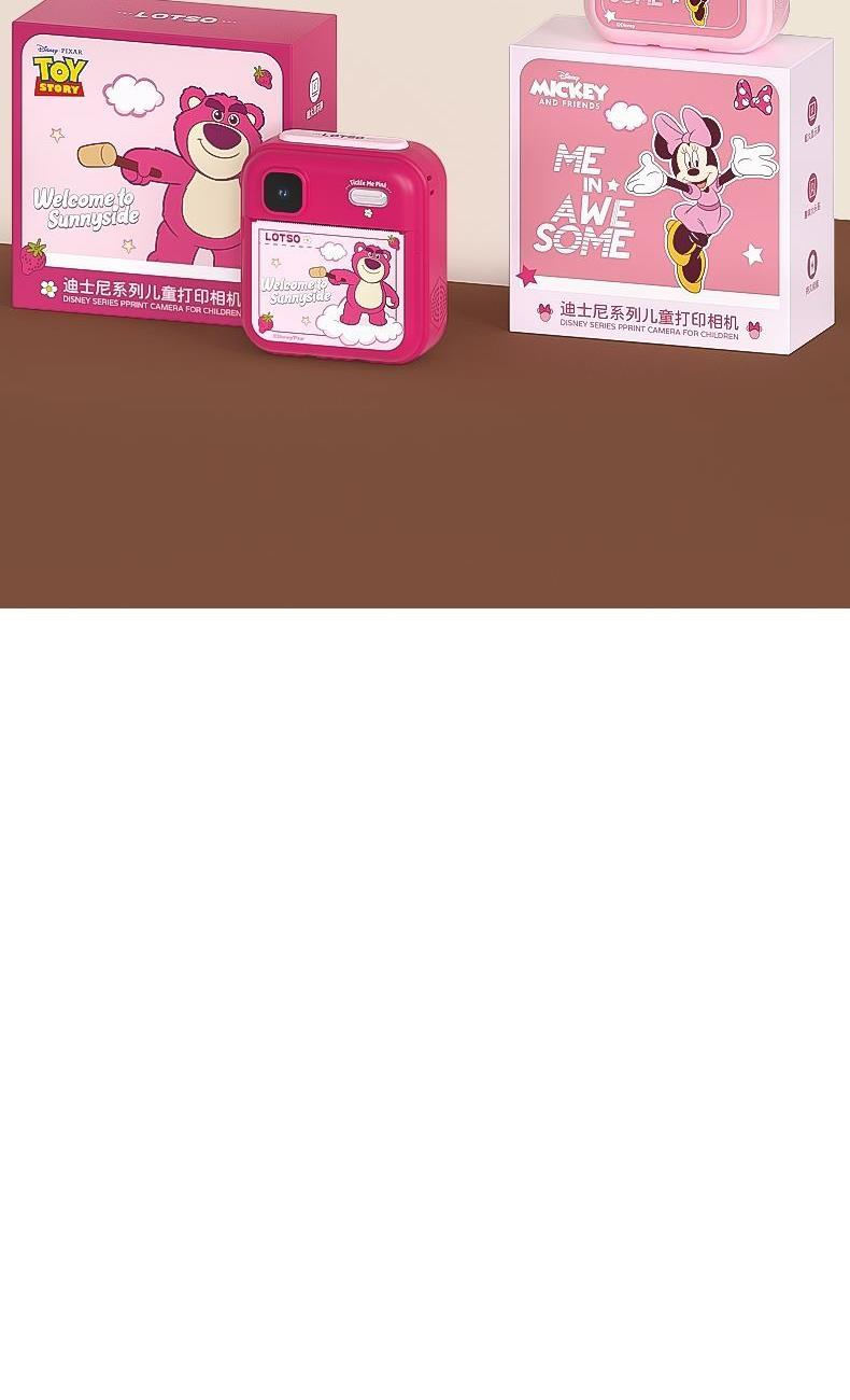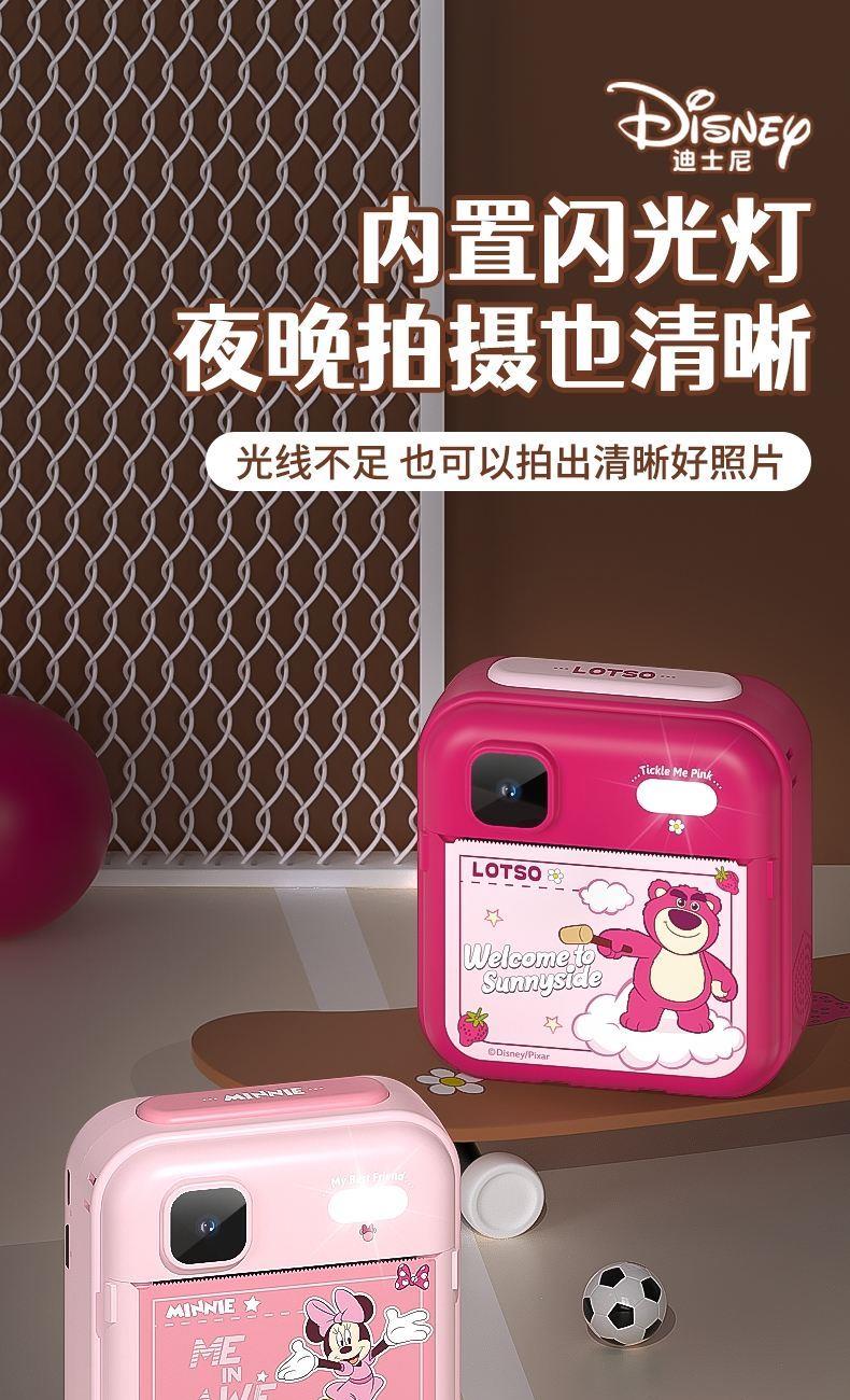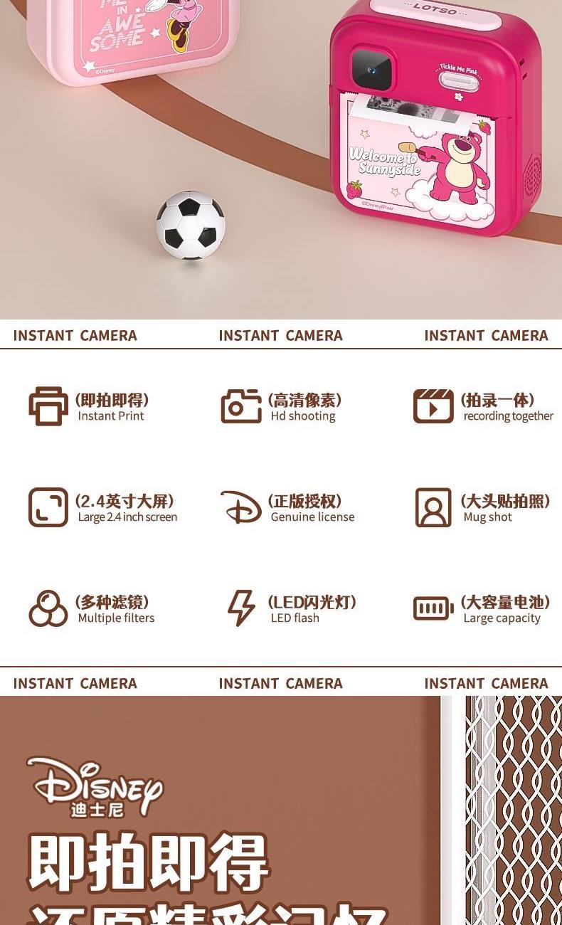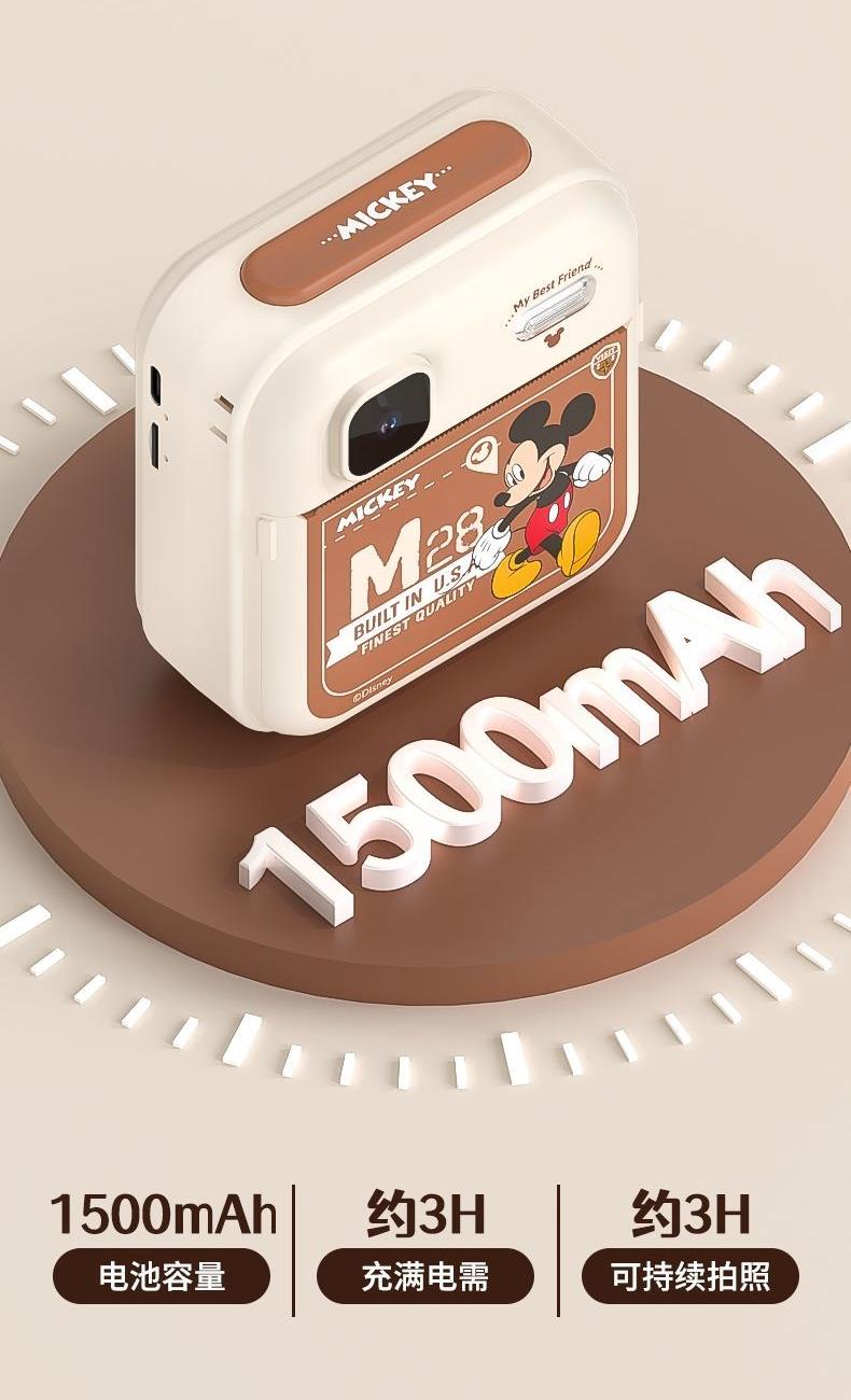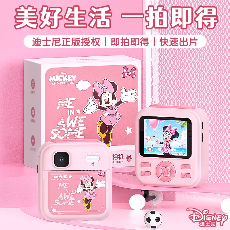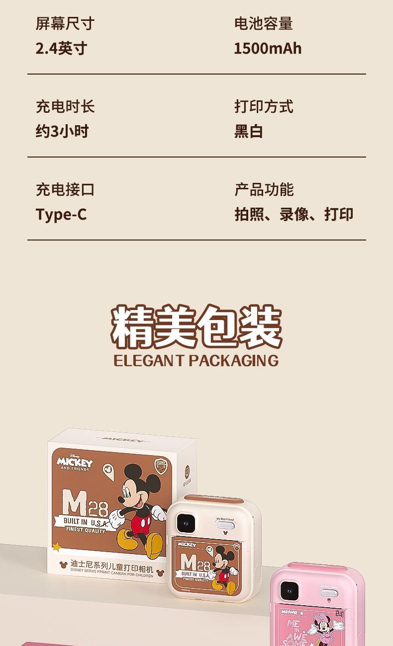 屏幕尺寸:2.4"IPS高清屏 录像分辨率:1920*1080P 产品功能:拍照/录像/游戏/音乐播放 产品材质:ABS+PC ; 电池容量:1500mAh 产品款式:米奇/米妮/草莓熊/艾莎 充电接口:TYPE-C 充电电压:直流DC-5V/1A 存储方式:TF卡(需单独购买) 支持:32GB(需单独购买) 拍照时间:约4小时;录像时间:约3小时 纸张规格:57*25mm 1、迪士尼正版儿童拍照打印相机 2、简单操作,乐趣无穷 3、2.4英寸高清大屏幕,看得更清楚,自带闪光灯不怕环境暗 3、1920P高清摄影,4800万高清图片像素; 4、拍照打印二合一,高清一秒出片,自带相纸 5、可单独购买32GTF,读卡器,数据线方便家长取出打印相片更便捷; 6、可单独购买彩色相纸,升级彩色打印;
