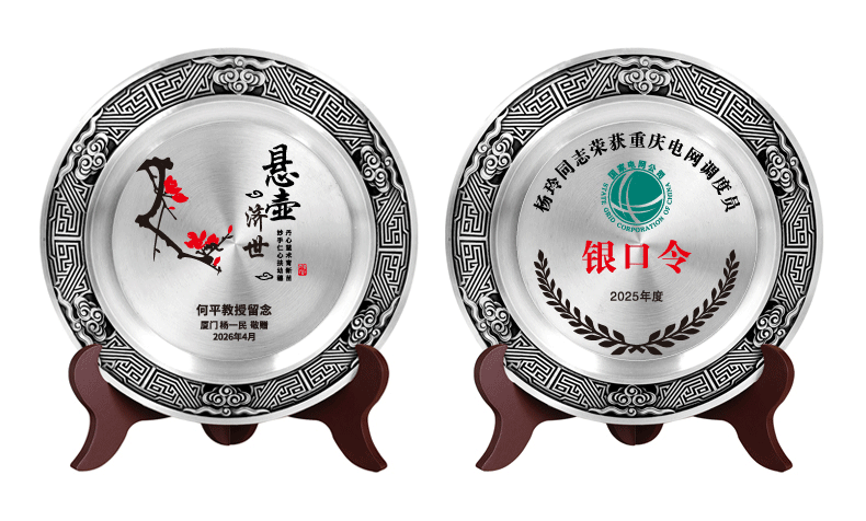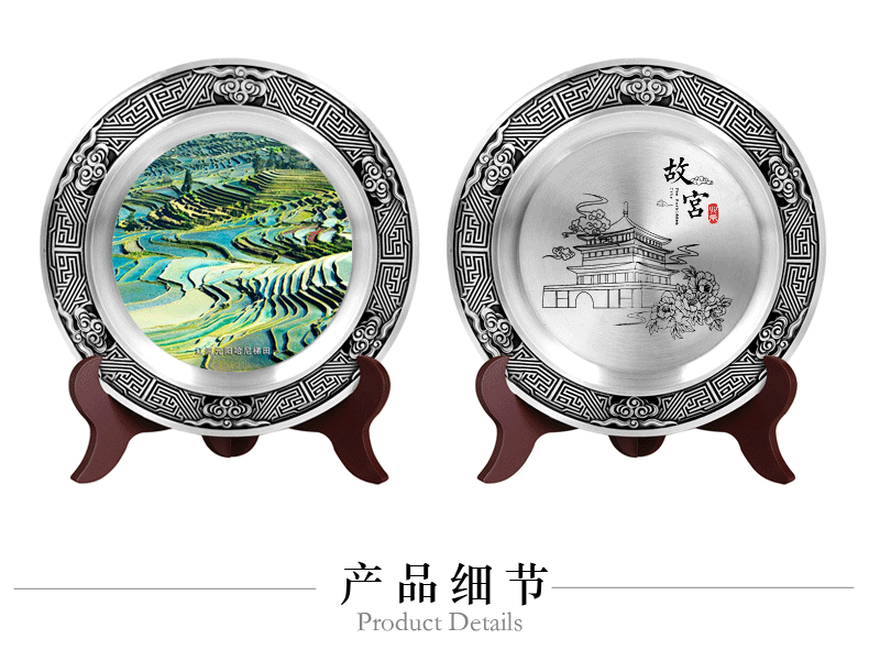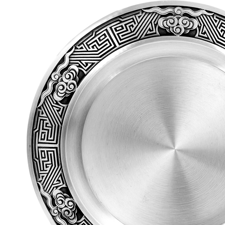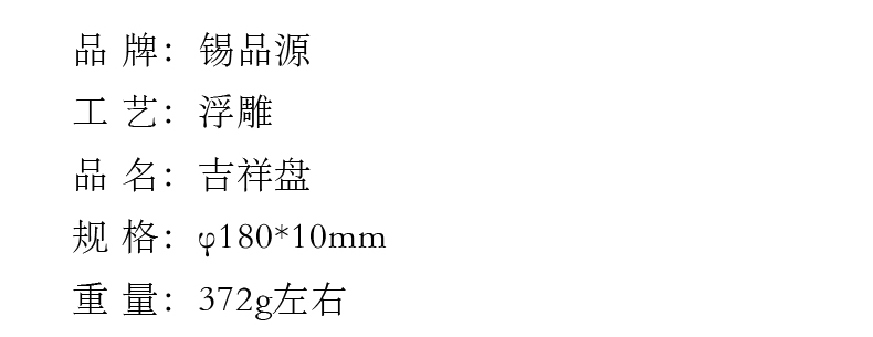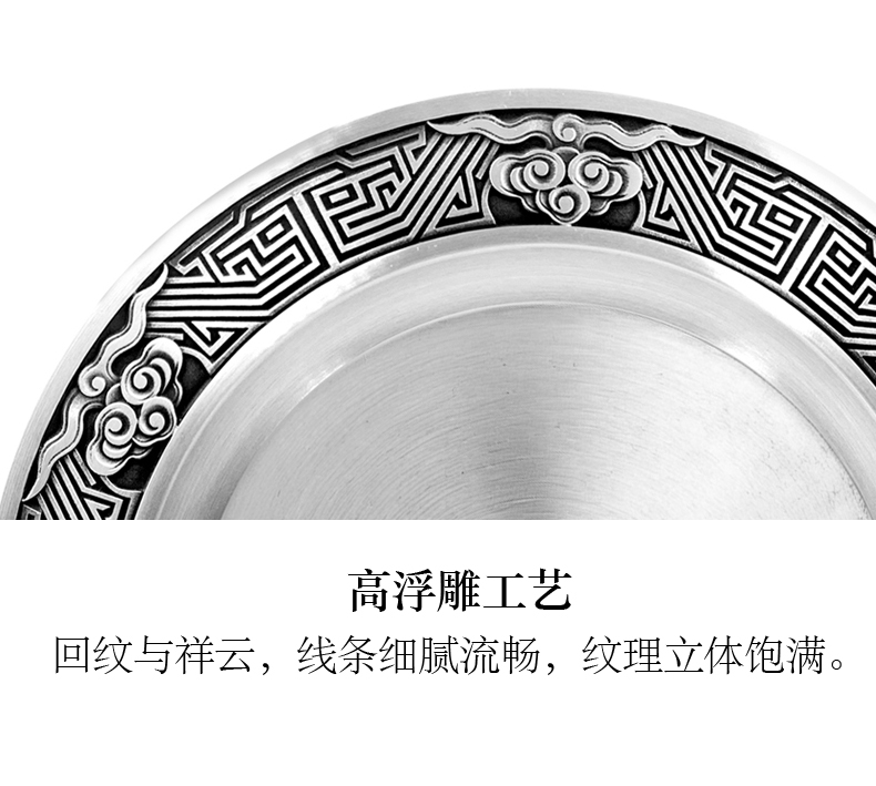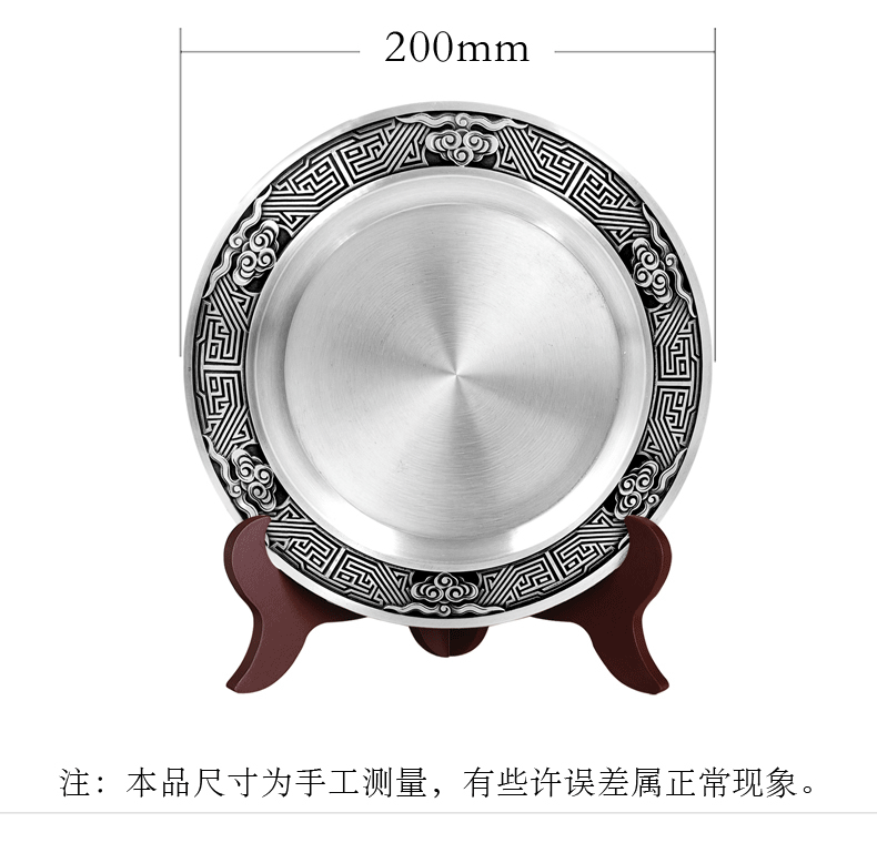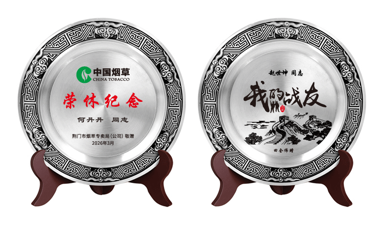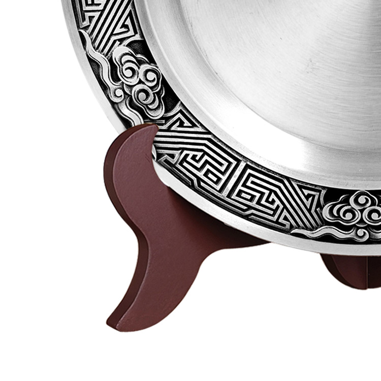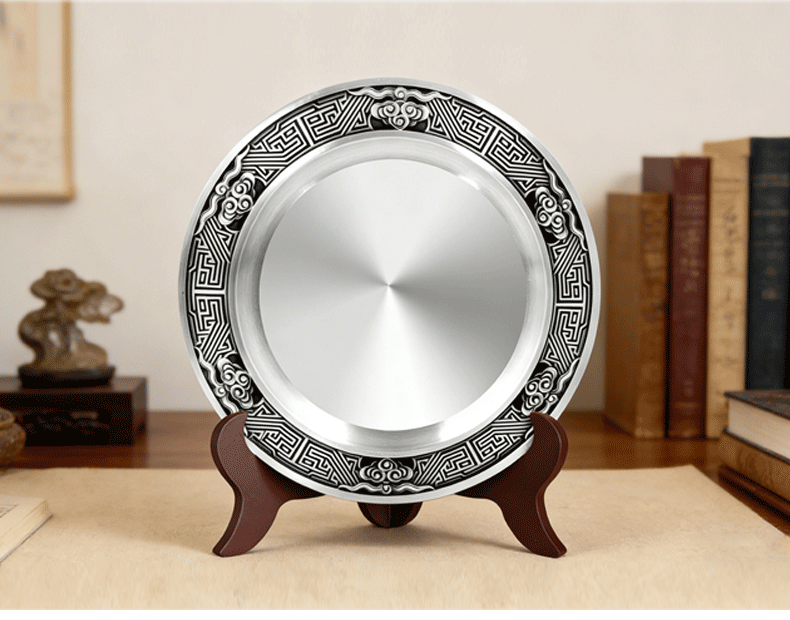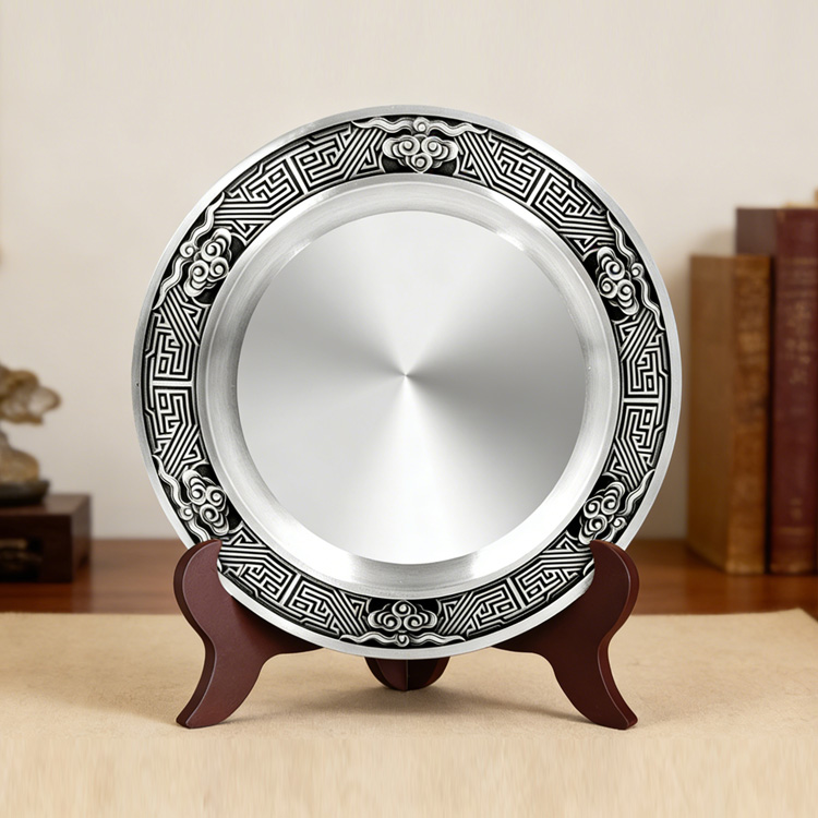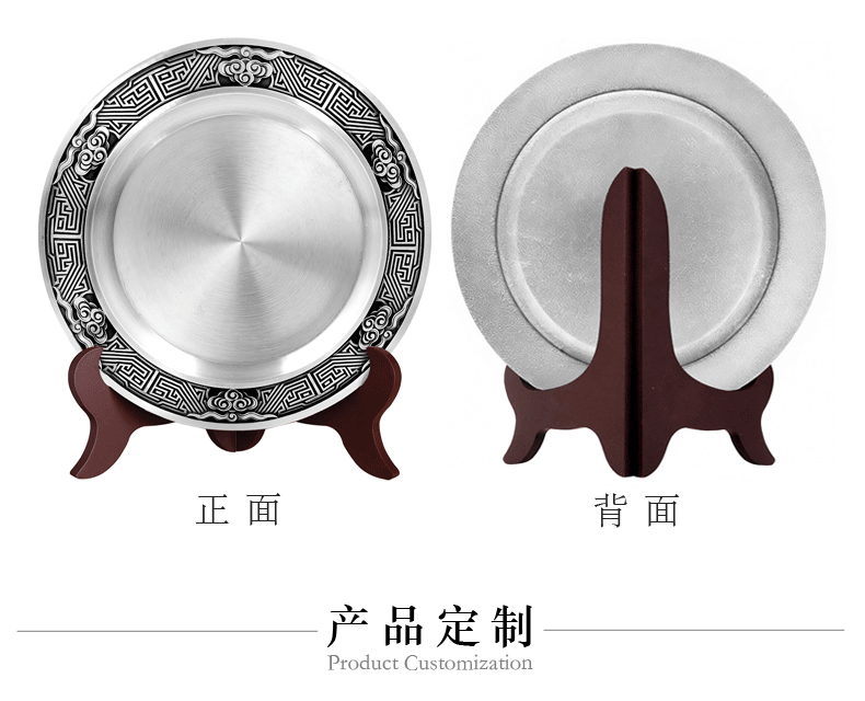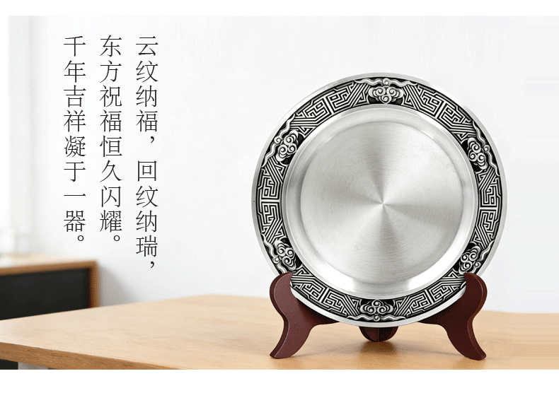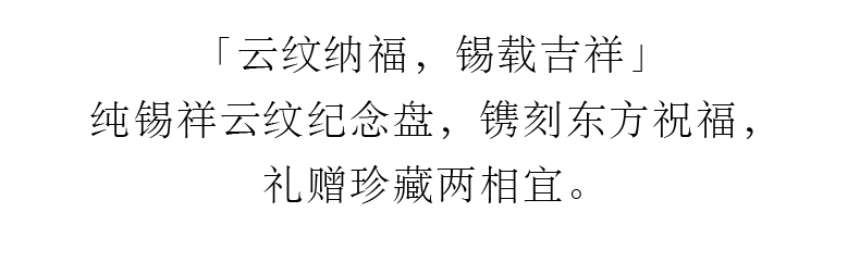 产 品:吉祥盘 规 格:φ180*10mm 重 量:372g左右 ✅ 云纹纳福:盘边浮雕祥云回纹,寓意吉祥如意、福运绵长,护佑事业顺遂、安康顺遂,承载东方祝福。 ✅ 锡艺匠心:锡材打造,外圈搭配立体浮雕,质感温润,历久弥新。 ✅ 圆心定制:中心支持激光刻字,可刻寄语、LOGO、姓名,适配伴手礼、商务答谢、周年庆典、乔迁纪念等场景。 ✅ 礼赠珍藏:搭配实木支架与精美礼盒,仪式感拉满,是礼赠、收藏、居家陈列的上乘之选。