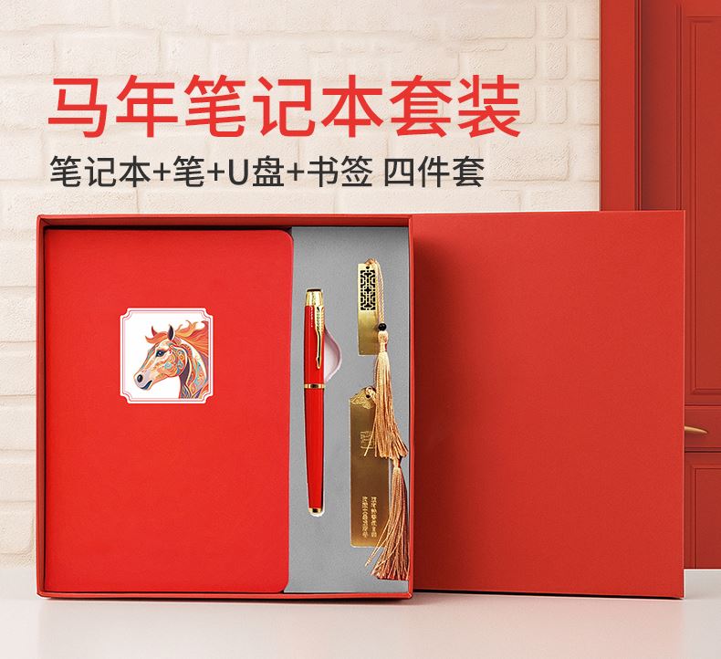 礼盒配置 : A5硬皮PU笔记本 金属烤漆签字笔 古铜书签 金属镂空16GU盘 红色包装盒尺寸: 227x227x35mm 红色手提袋尺寸: 270x270x55mm 重量:35kg/箱