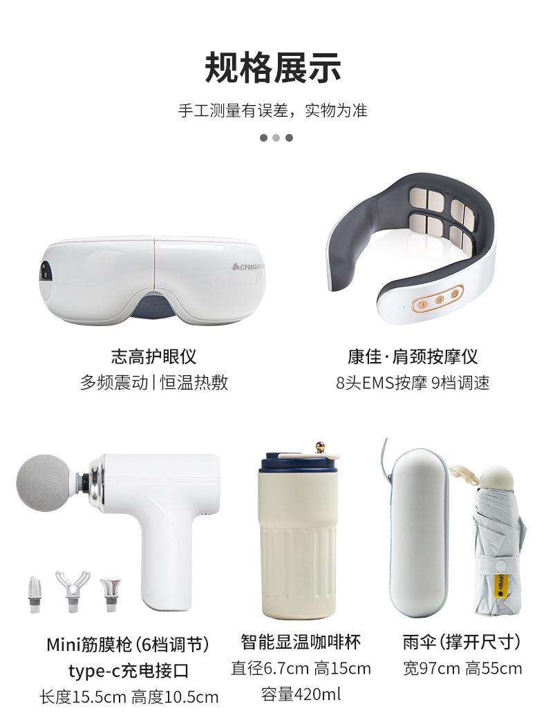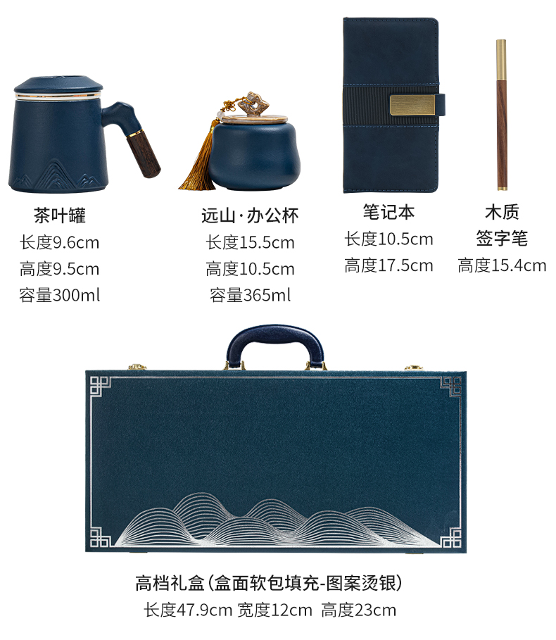 办公杯:16*10厘米 茶叶罐:8.2*8厘米 礼盒 :48*12*23厘米 办公杯 茶叶罐 护眼仪 笔记本签字笔 礼盒 配置齐全,商务实用,陶瓷高温烧制,无铅铬,送礼自用两相宜。