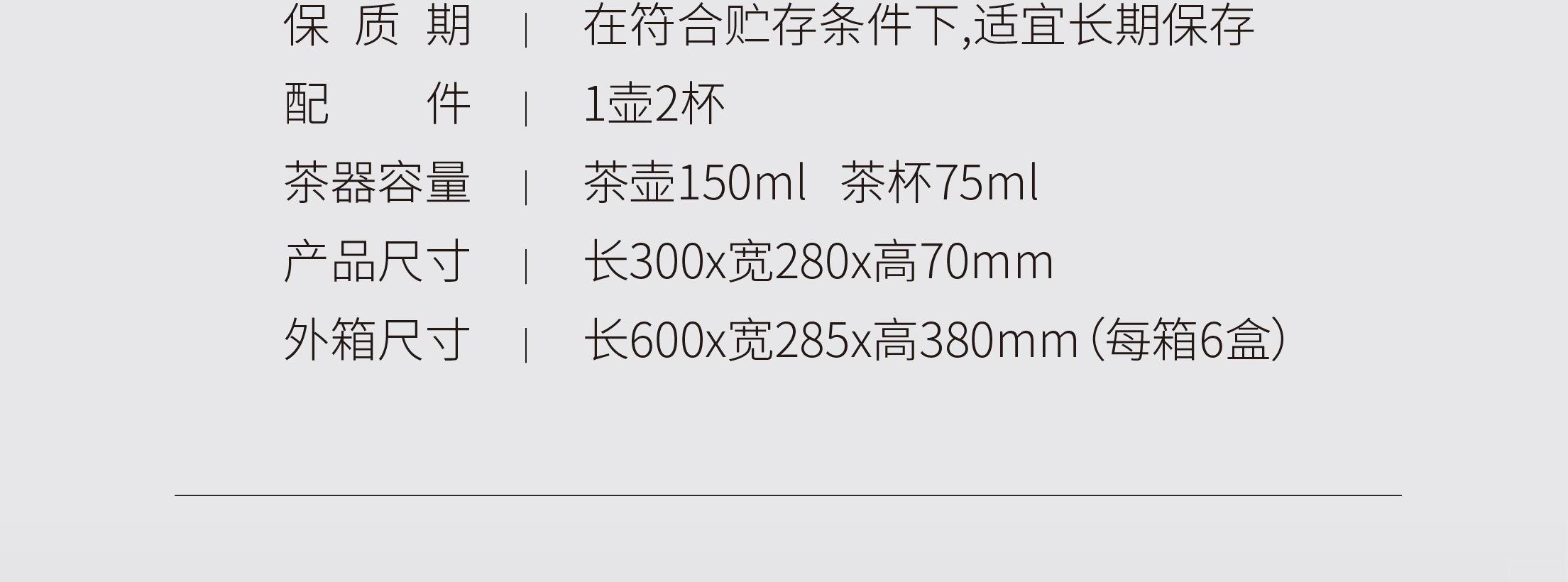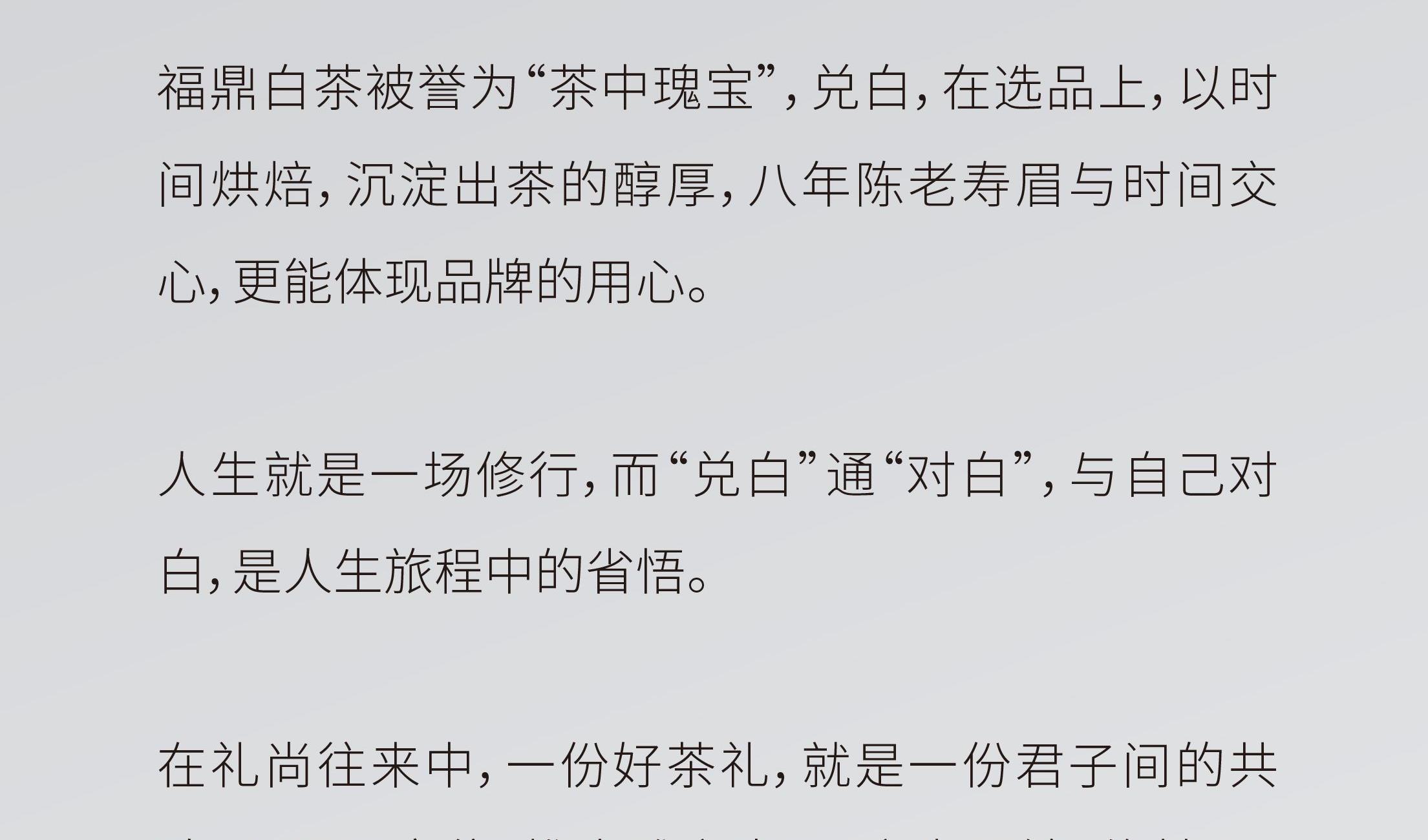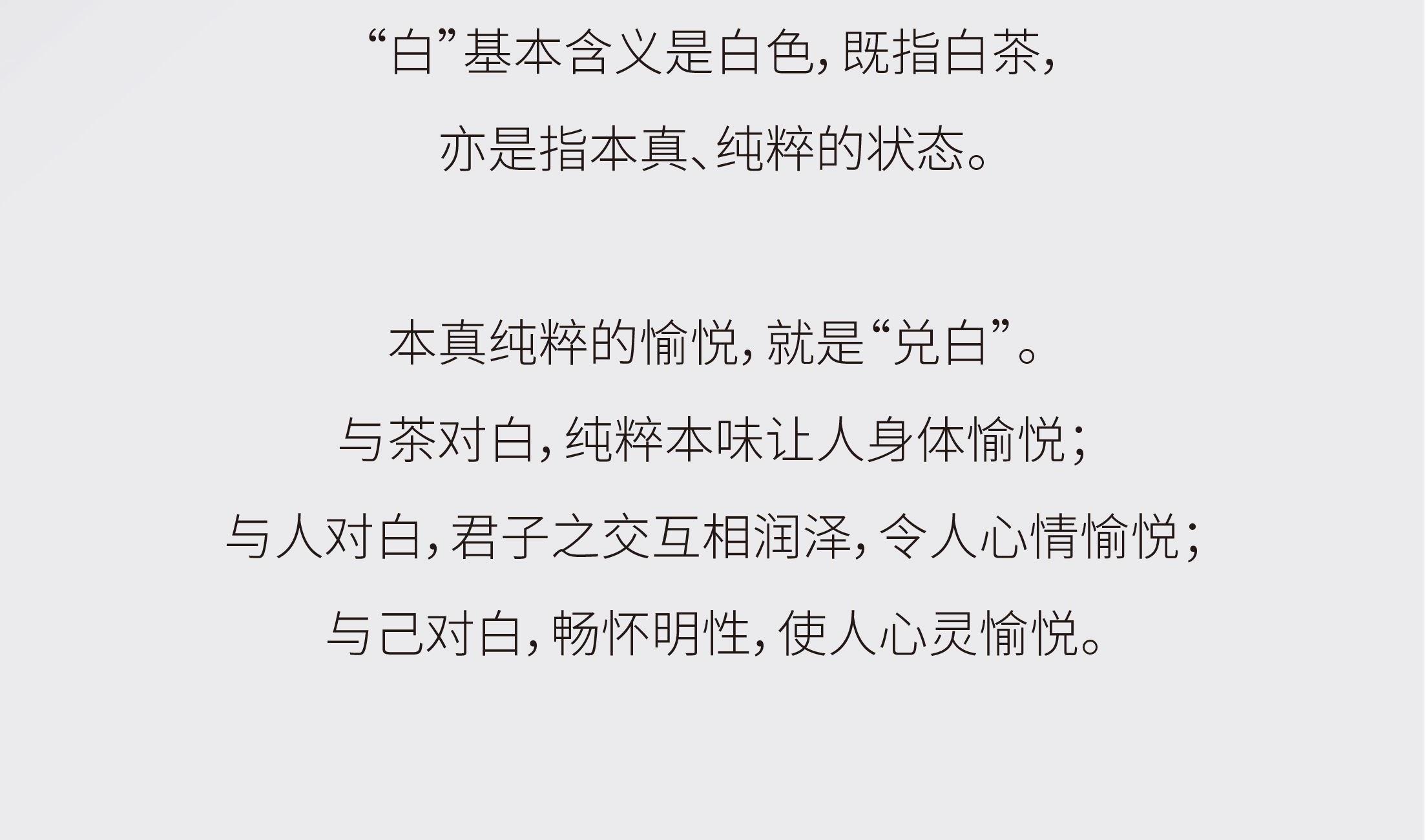 品 类丨福鼎白茶(寿眉)+茶具 规 格丨福鼎春寿眉200g(5g/包x40包) 茶具1套:1壶/ 2杯 与《易经》第58卦兑卦结合,传递“无心之悦”的价值主张 源自福鼎白茶核心产区生态茶园 8年陈寿眉,琥珀色茶汤 滋味甘醇细腻,枣香馥郁