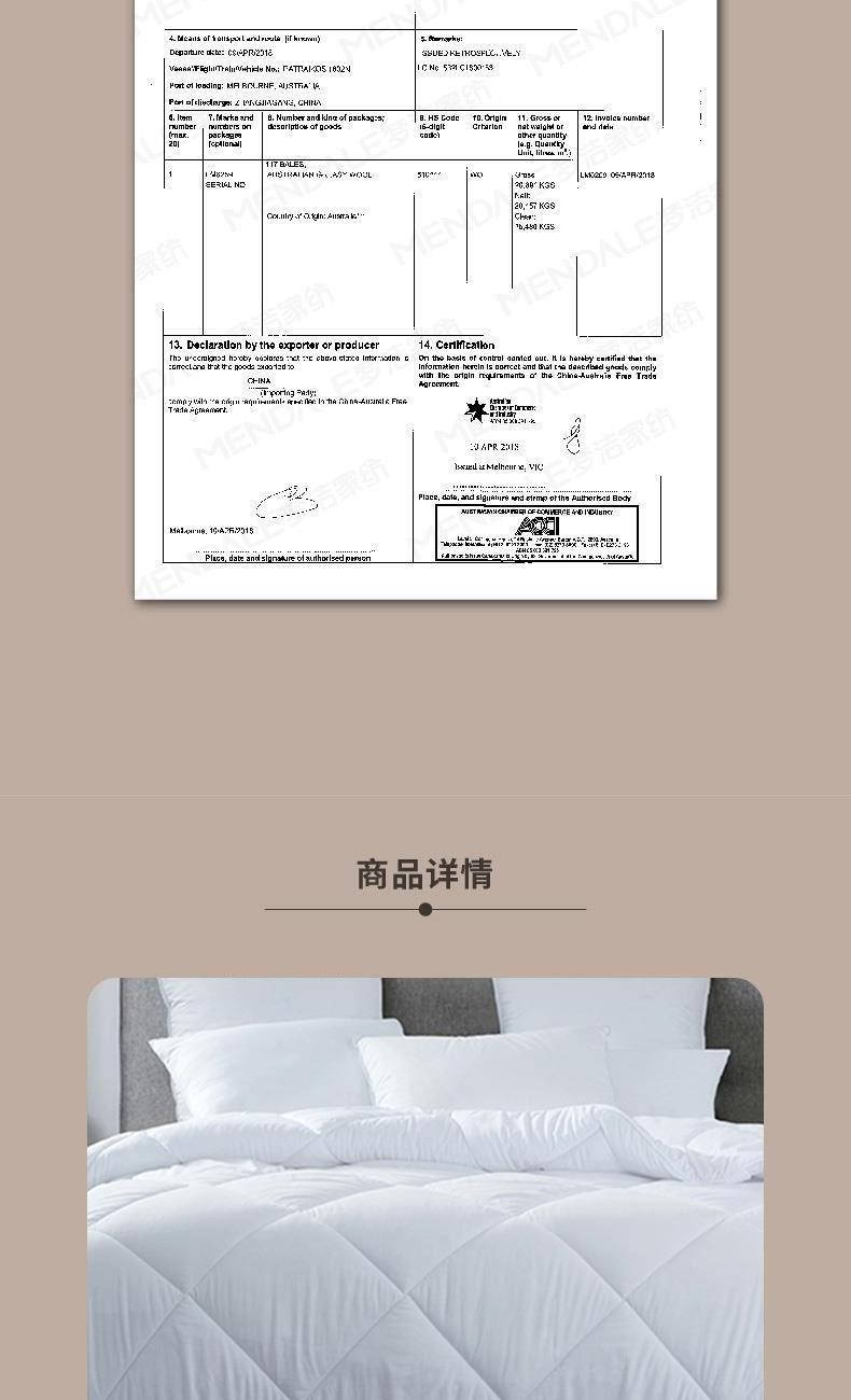 面 料:聚酯纤维 尺 寸:200×230cm 填充物 :羊毛 填充克重:1000g 填充:羊毛本身具有良好的吸、放湿性。澳洲进口羊毛,保暖性更佳,且无异味。 面料:手感细腻,亲肤柔软,舒适贴合; 工艺:细致包边,固定被芯。