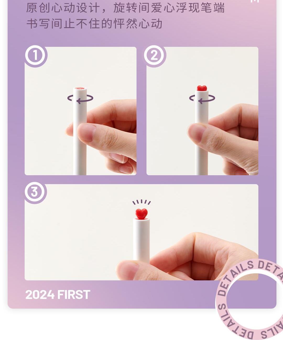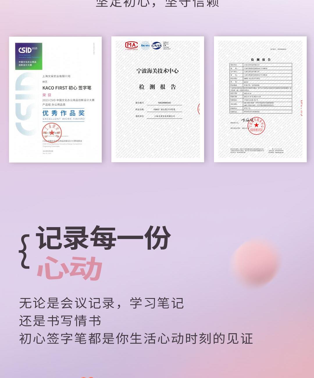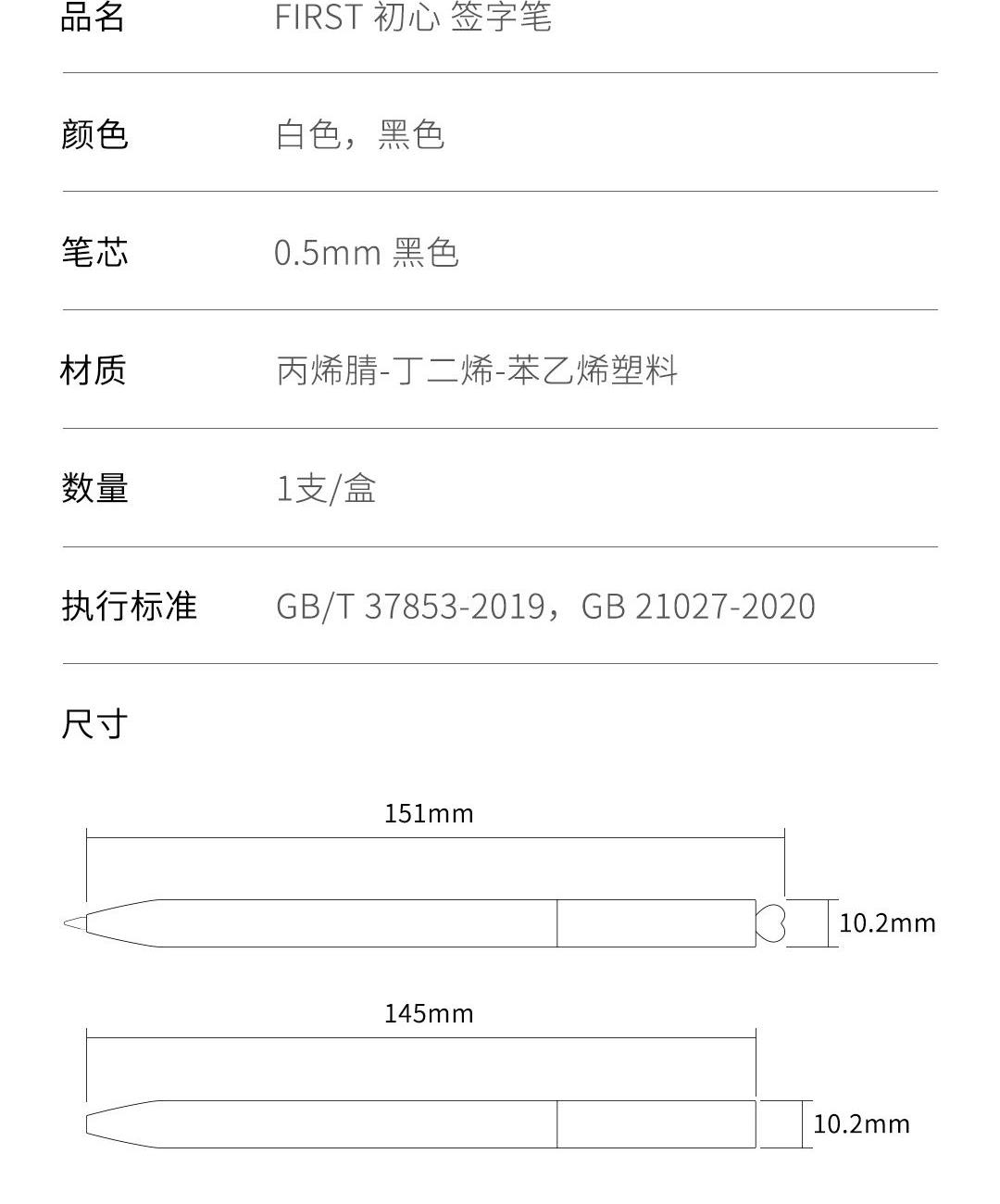 尺 寸:151*10.2mm 材 质:丙烯腈-丁二烯-苯乙烯塑料 外观颜色:黑色/白色/浅蓝色/浅橙色 1、原创设计,一笔旋转出芯,蕴含心动巧思创意。 2、采用KEFILL 双珠笔芯,书写流畅顺滑,不易断墨。 3、大容量速干墨水,书写长度约600米,落笔速干。 4、赠2支同款笔芯,记录心动时刻,满足日常书写。 定制工艺:笔身印刷Logo 打样周期:3-5天 货 期:7-10天发货(不含重大法定假日) 包装方式:彩盒(内含初心笔*1,替换笔芯*2)