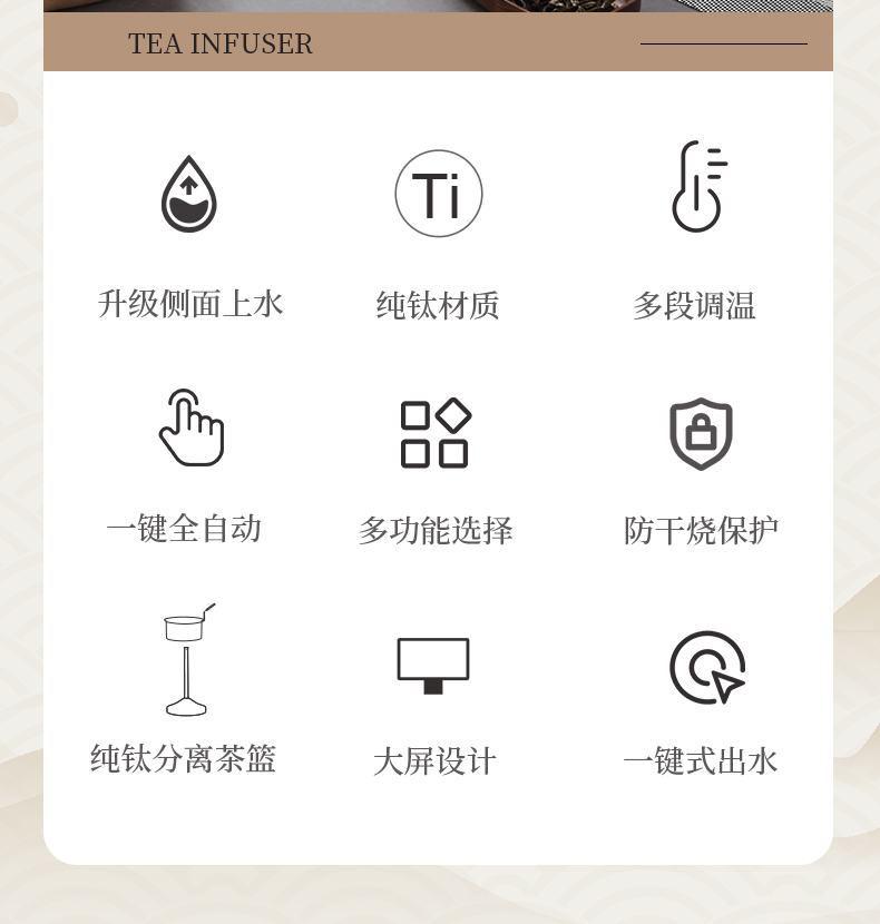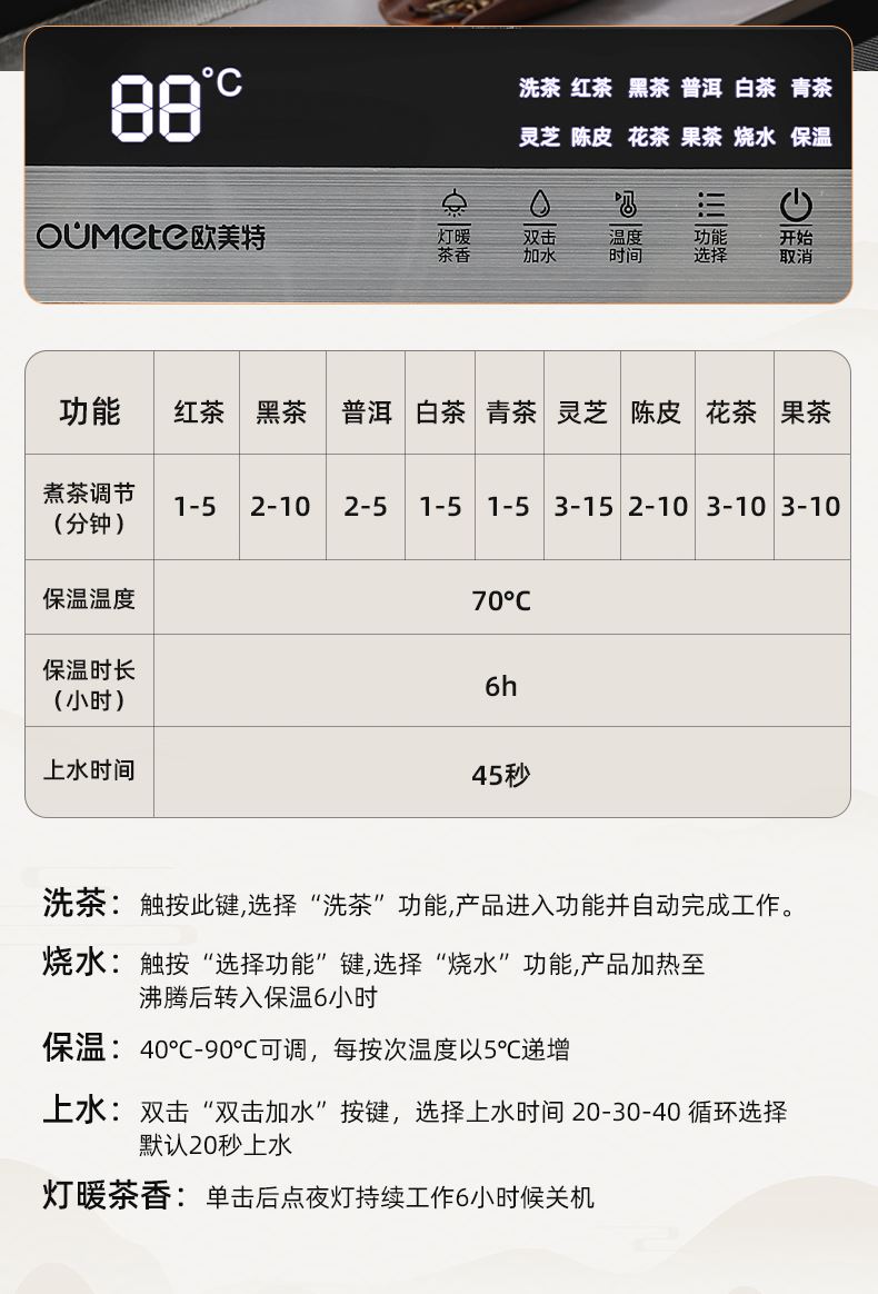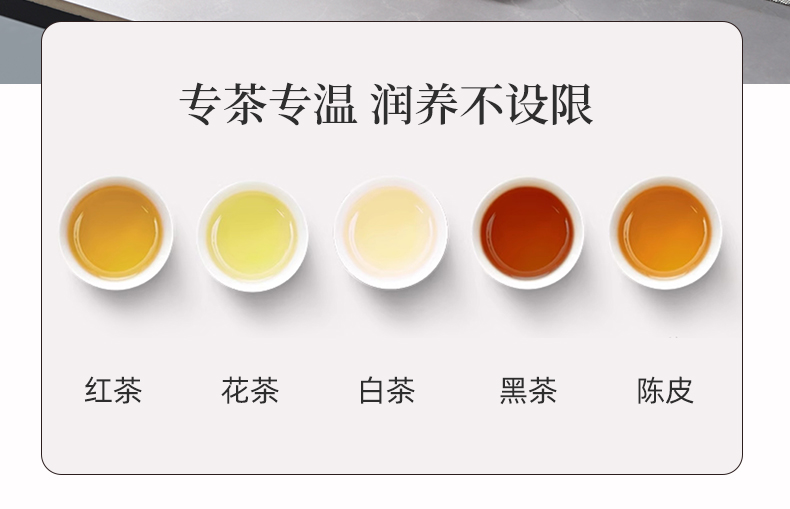 按键功能:洗茶 红茶 黑茶 普洱 白茶 青茶、灵芝 陈皮 花茶 果茶 烧水 保温