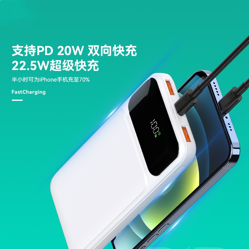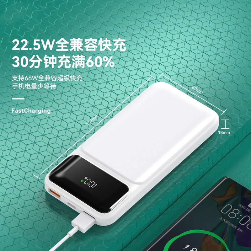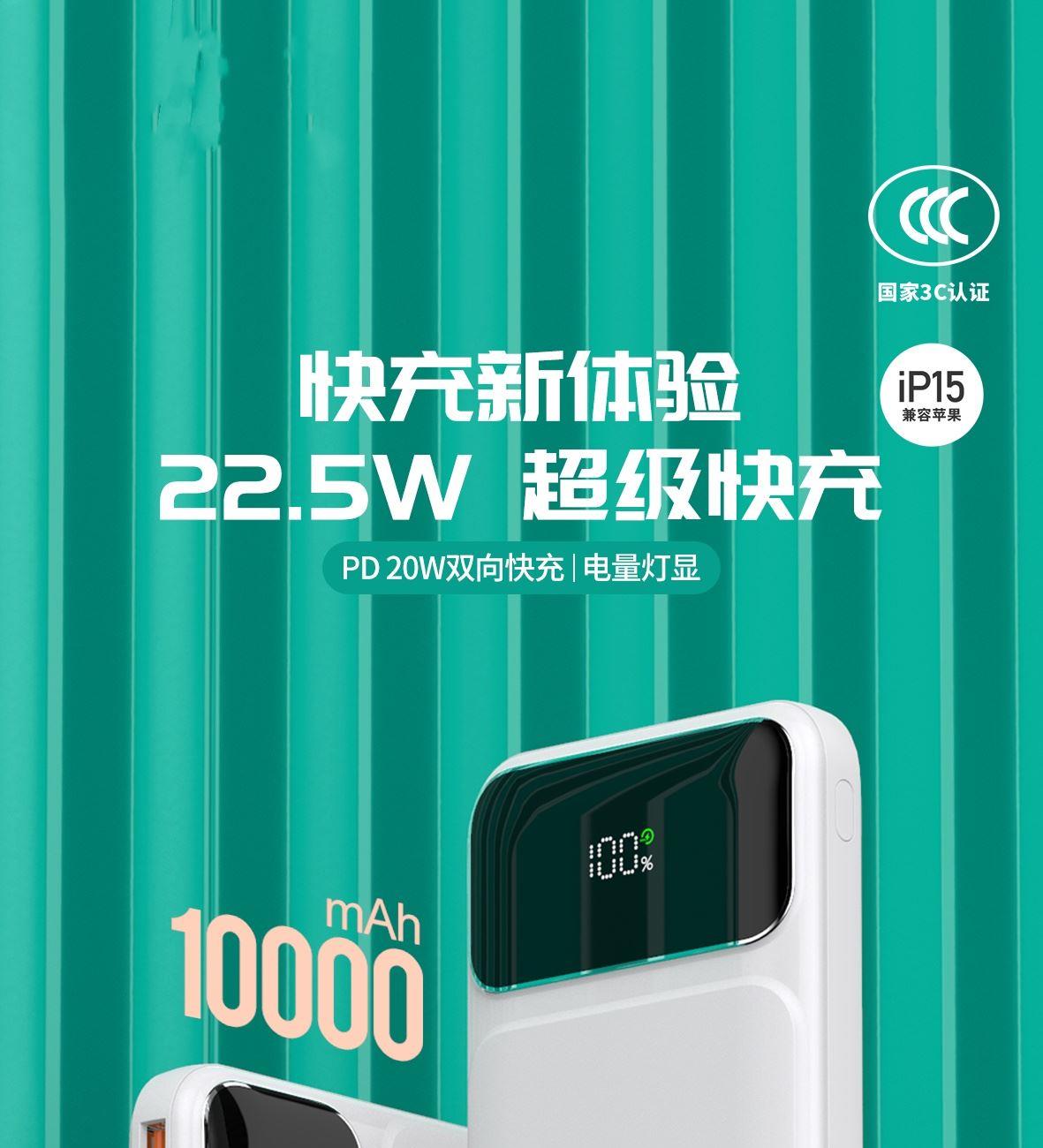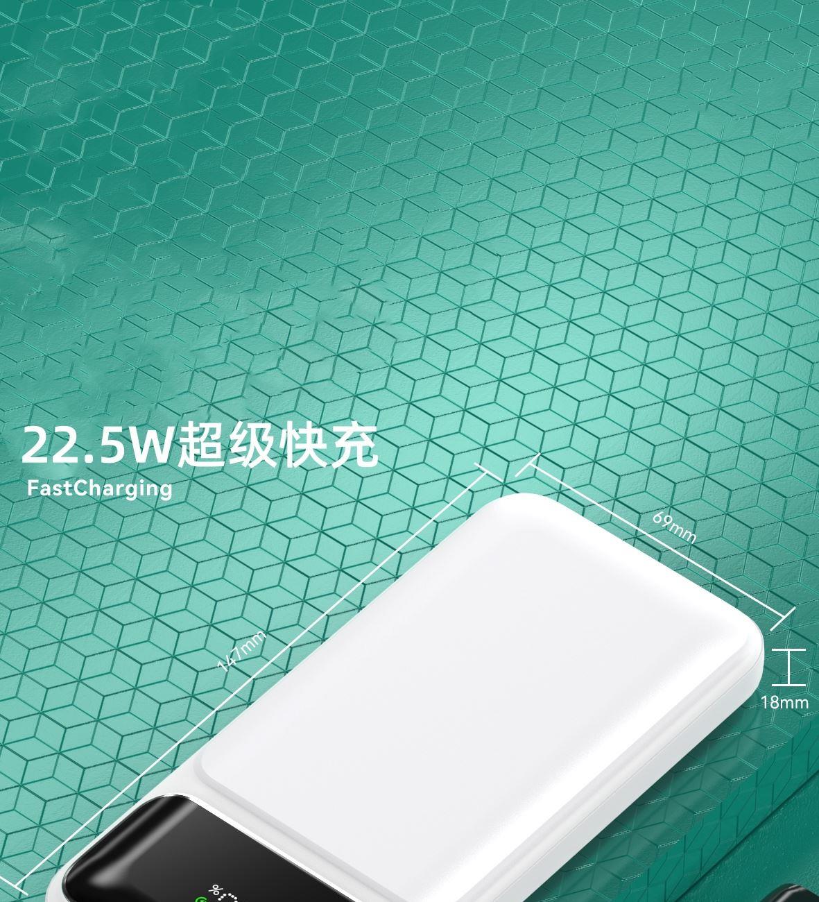 电池种类:可充电锂离子电池 容量:10000mAh(3.7V/37Wh) TYPE-C输入:5V-3A/9V-2A/12V-1.5A TYPE-C输出:5V-3A/9V-2.1AV/12V-1.5A/PD20W USB黑色输出:5V-2.4A USB橙色输出:5V-3A/9V-2.5A/12V-1.5A MAX 多口同时输出:5V-2.4A 执行标准:GB 4943.1-2022,GB31241-2022 产品尺寸:147*69*17mm 产品重量:约230g 产品包装尺寸:167*90*25mm(彩盒) 产品卖点:LED数显电量,掌握剩余电量,USB接口支持22.5W超级快充,充电宝支持快充蓄电,具有过压保护,过放保护,短路保护,过充保护等功能,可带上飞机。