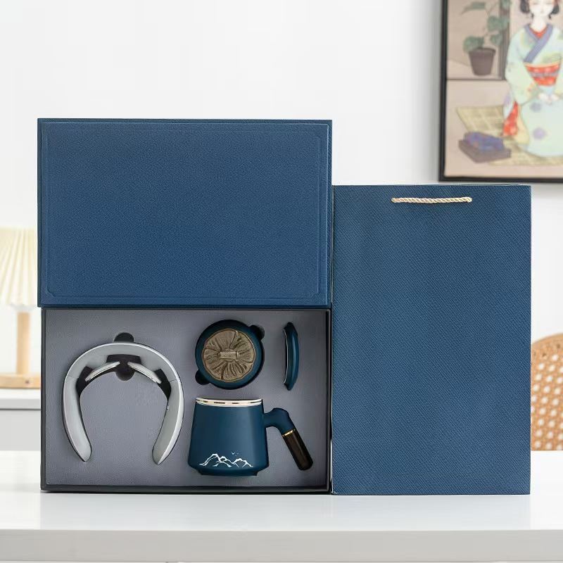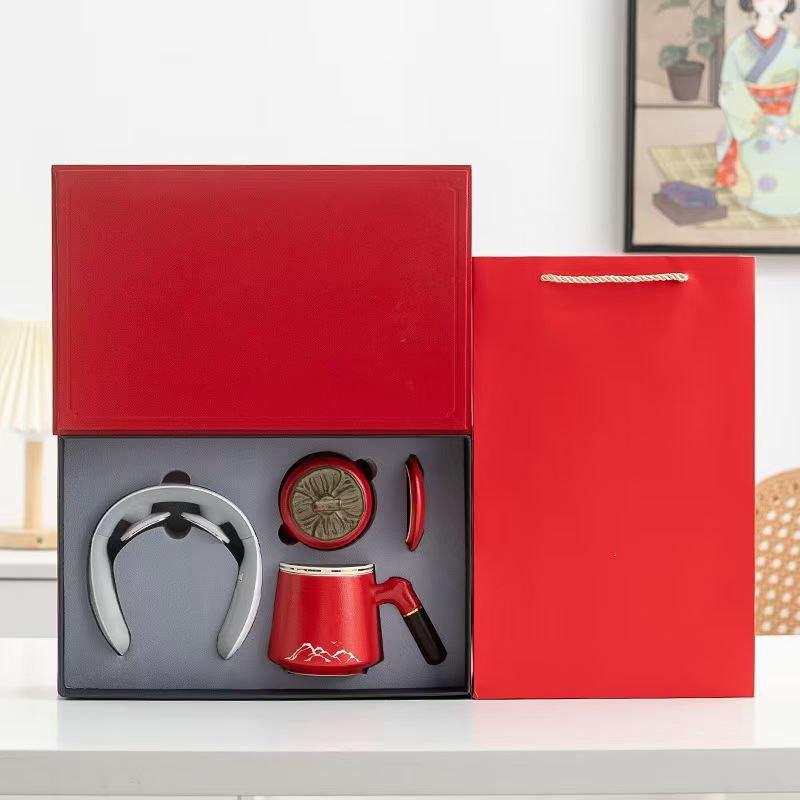 配 制: 1办公杯 1颈椎仪1锦盒 手提袋 规格: 办公杯14.5*10.4cm 礼盒38.2*11cm 工艺:商务实用性礼品,上班族刚需产品。粗陶办公杯,带茶漏,颈椎按摩仪,低频脉冲技术,缓解颈椎疼痛。
