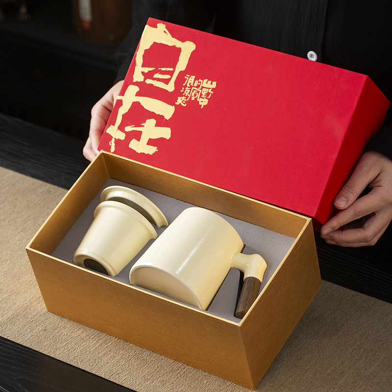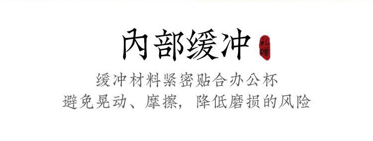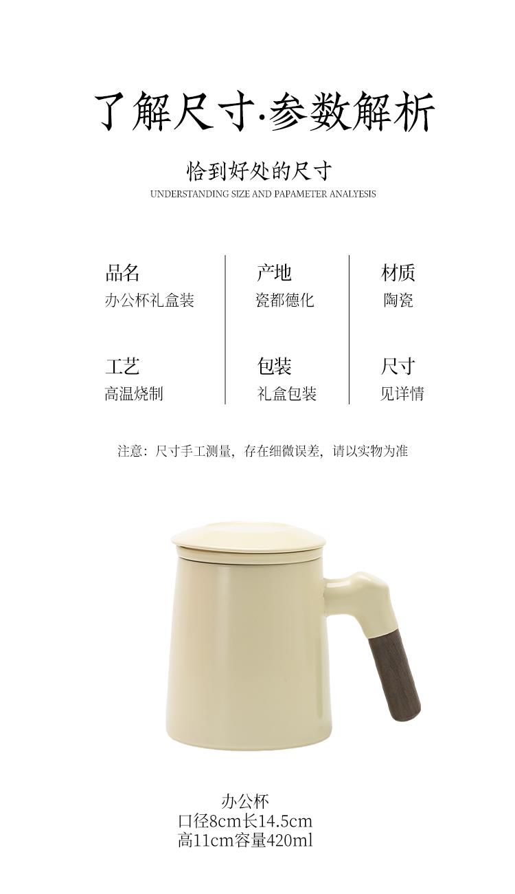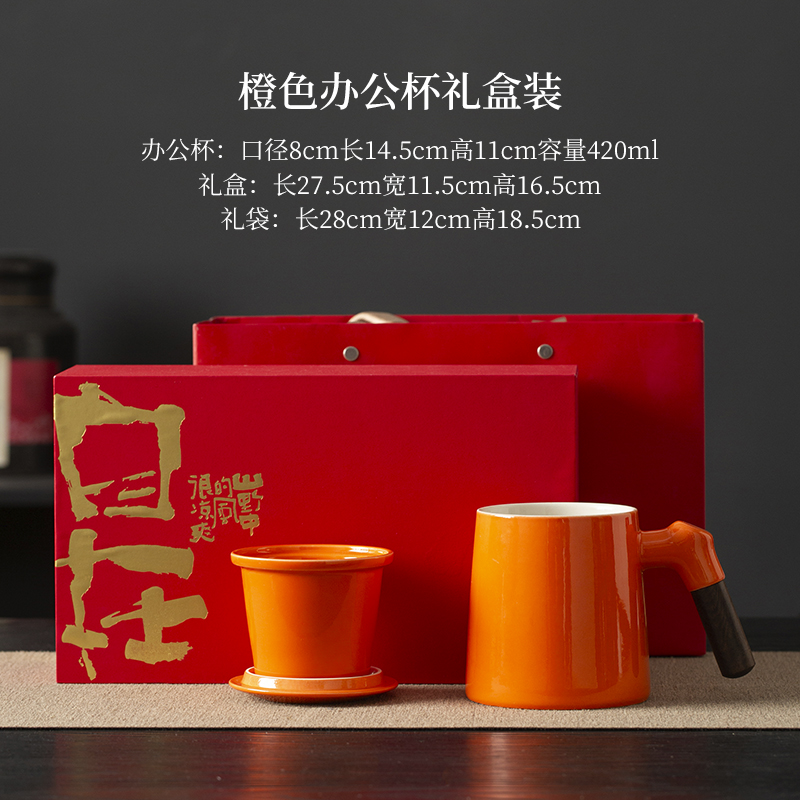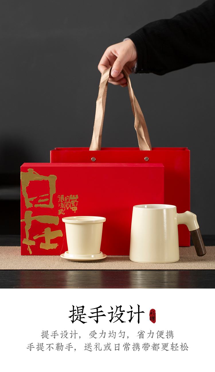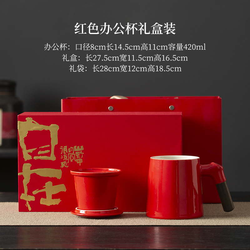 配置:办公杯三件套(含过滤)*1 礼盒*1 礼袋*1 材质:高白瓷 礼盒尺寸:26.5cm*15cm*10.5.cm 产品尺寸:办公杯:宽12cm/高11.7cm/容量:330ml