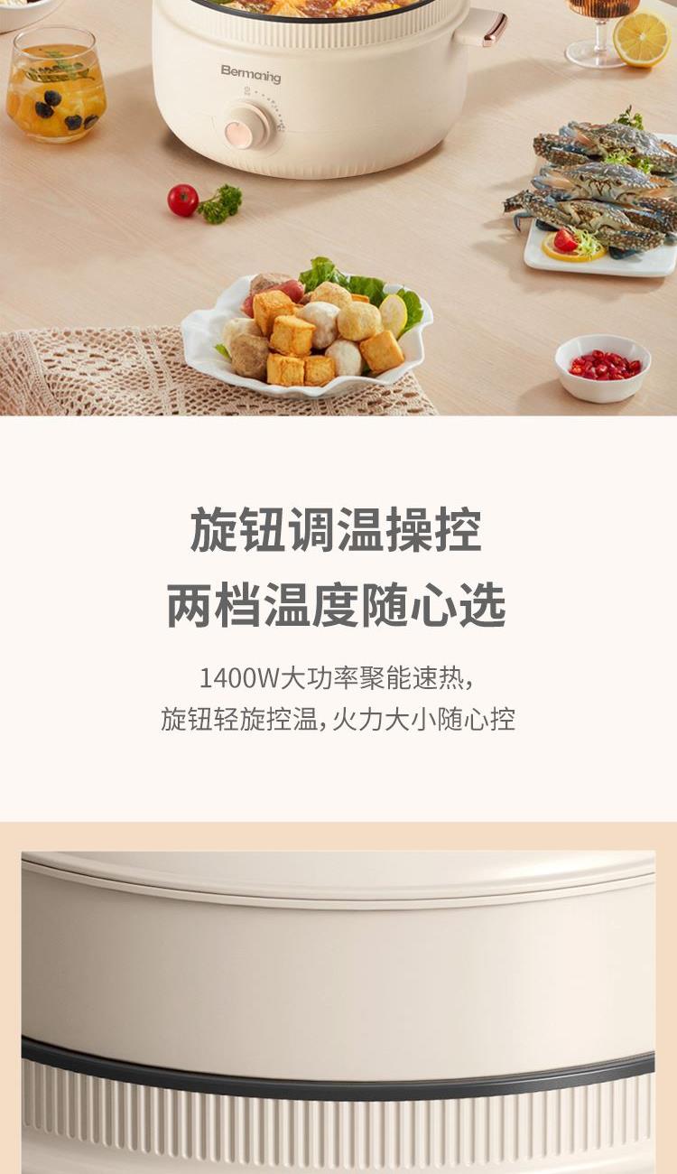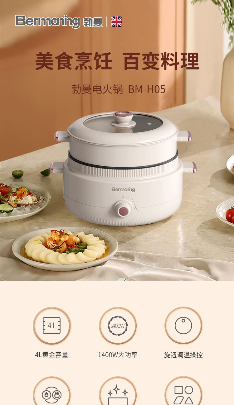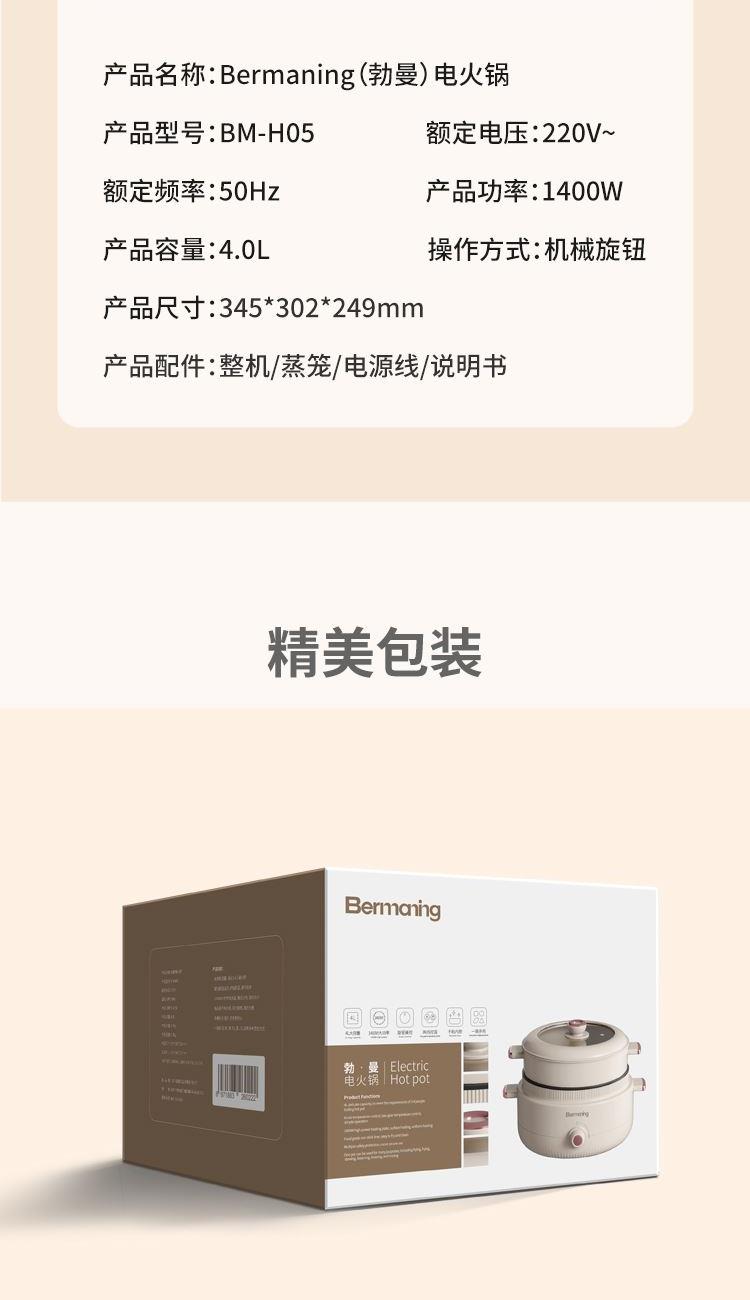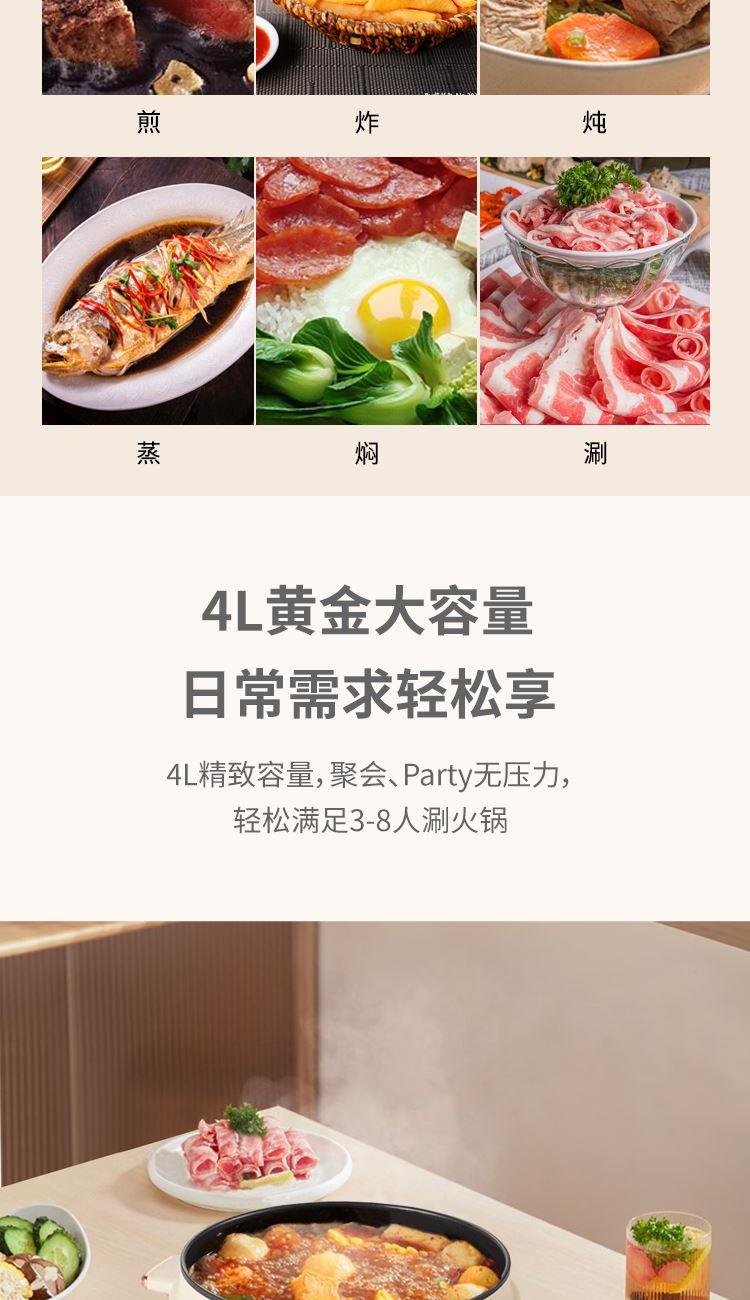 额定电压:220V~ 额定频率:50Hz 产品功率:1400W 产品容量:4L 净 重:1.7kg 毛 重:2.4kg 1400大功率,聚能速热,美食不等待 上蒸下煮,下锅亦可煎、炒、炸、焖、炖、涮火锅,能蒸善煮,一锅搞定 4升大容量聚会、party无压力,轻松满足3-8人涮火锅 旋钮调温,大小两挡随心控,快涮用大火,慢炖用小火,随心所欲 面式加热,不粘内胆,平衡气压透气孔,透明锅盖受热均匀不粘不糊,防烫防溢出,好清洗