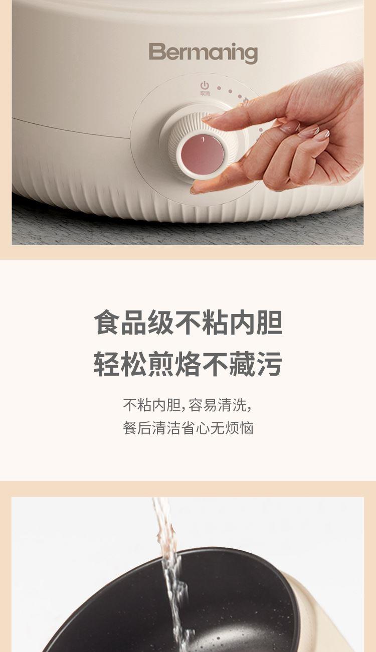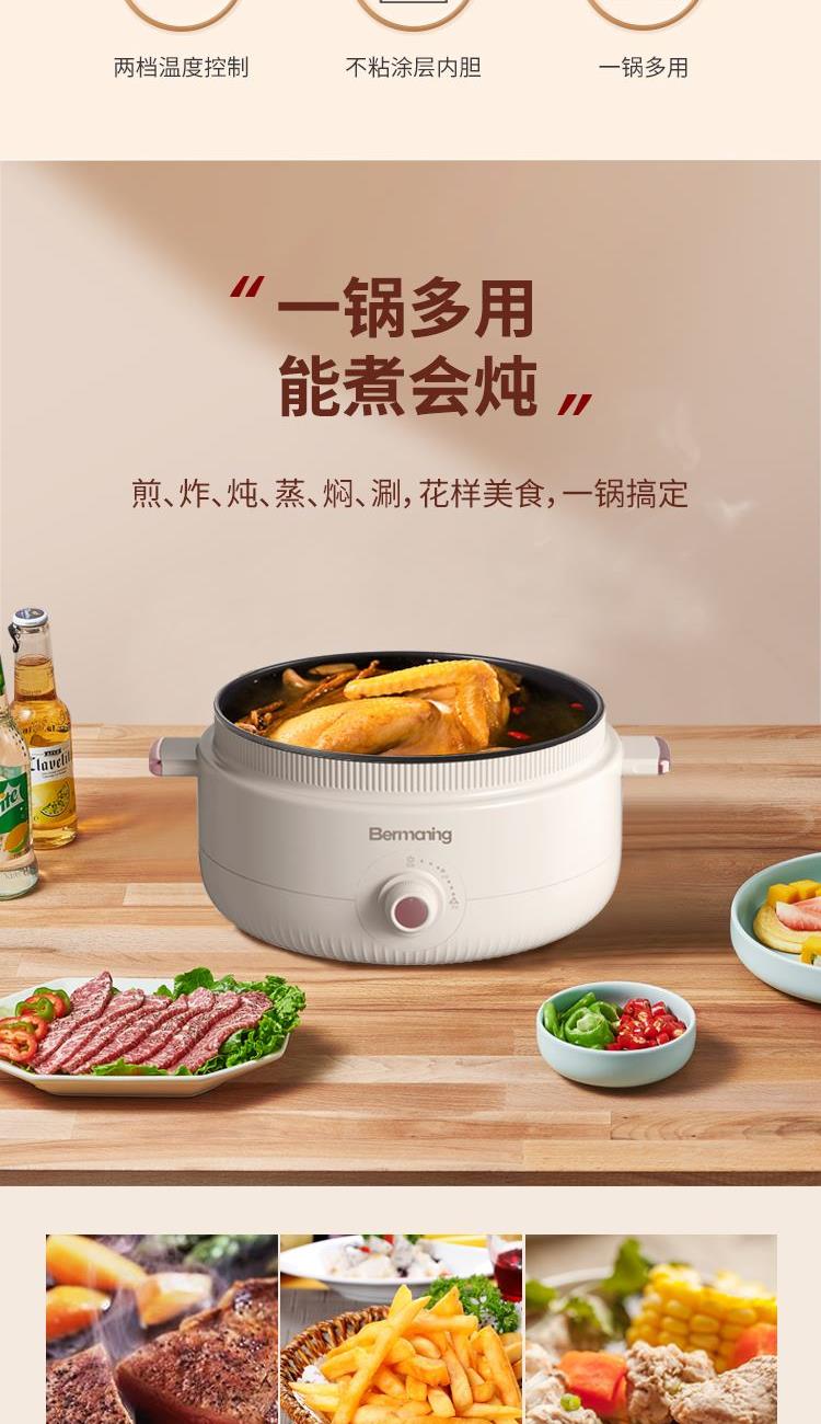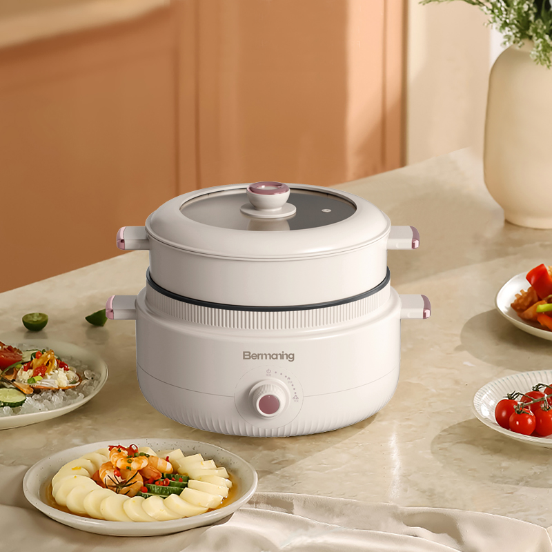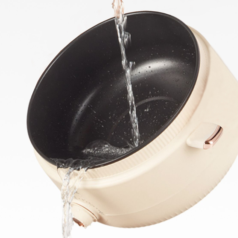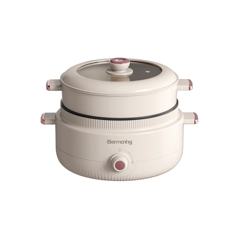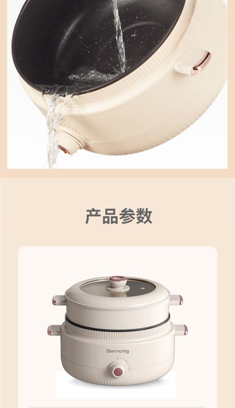 额定电压:220V~ 额定频率:50Hz 产品功率:1400W 产品容量:4L 净 重:1.7kg 毛 重:2.4kg 1400大功率,聚能速热,美食不等待 上蒸下煮,下锅亦可煎、炒、炸、焖、炖、涮火锅,能蒸善煮,一锅搞定 4升大容量聚会、party无压力,轻松满足3-8人涮火锅 旋钮调温,大小两挡随心控,快涮用大火,慢炖用小火,随心所欲 面式加热,不粘内胆,平衡气压透气孔,透明锅盖受热均匀不粘不糊,防烫防溢出,好清洗