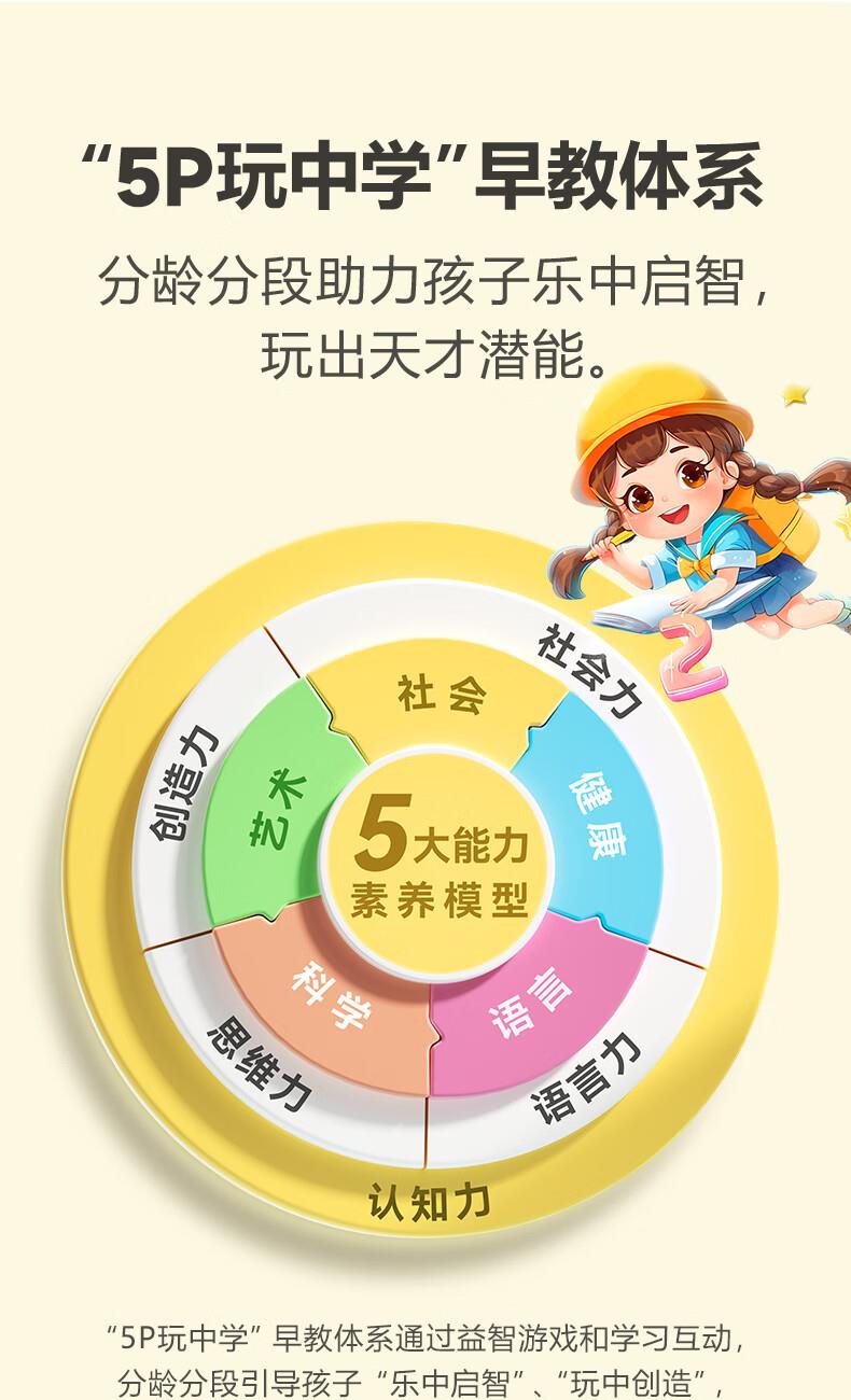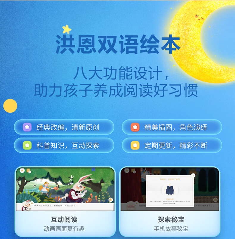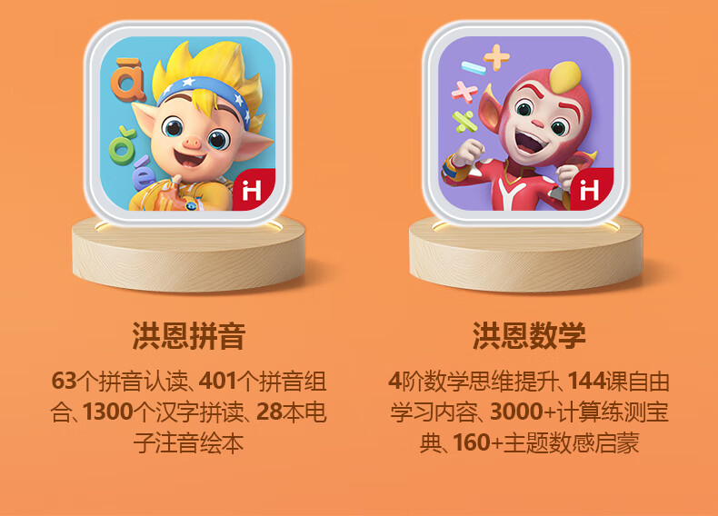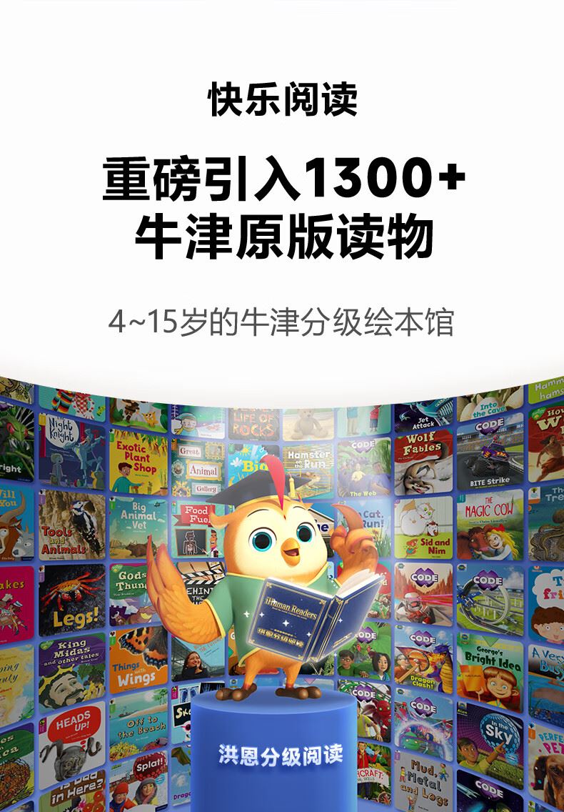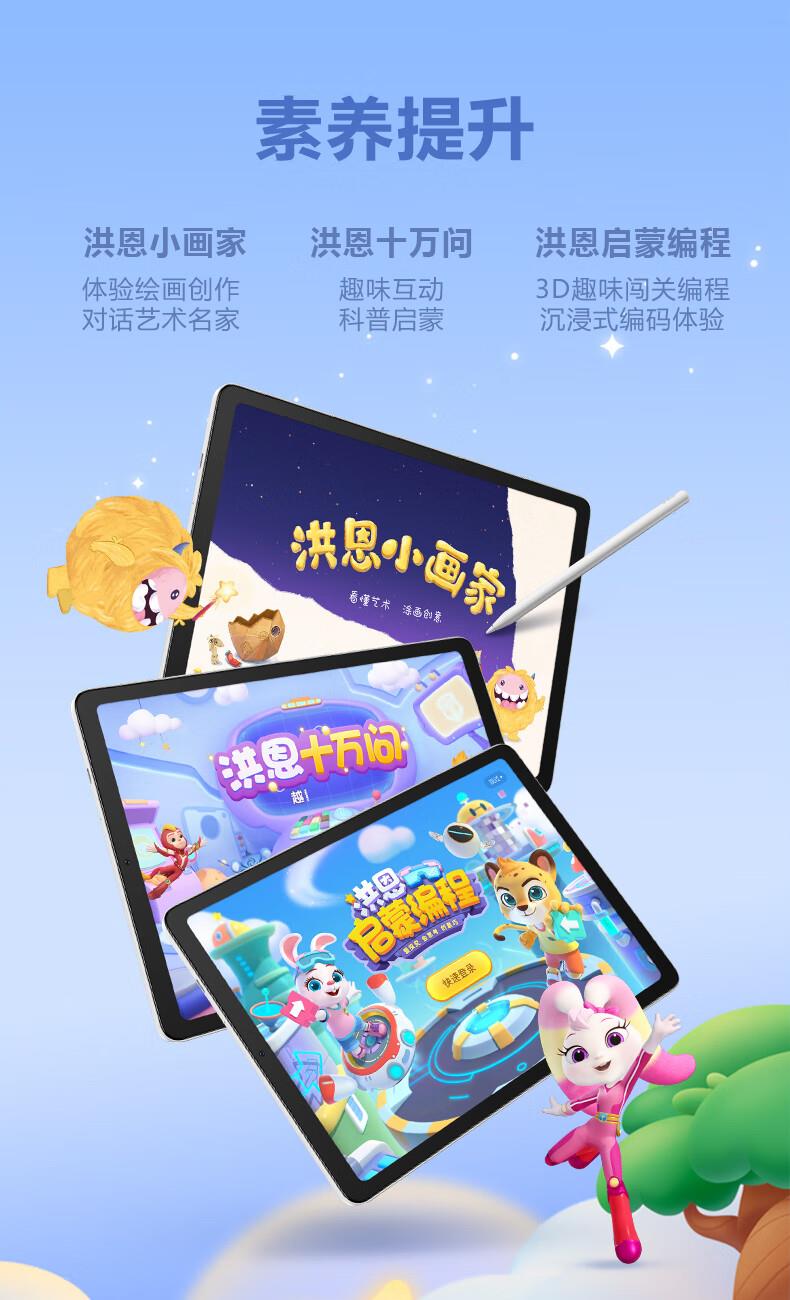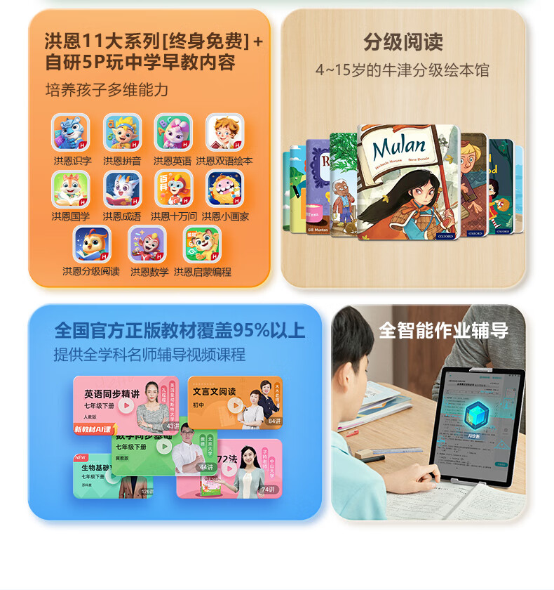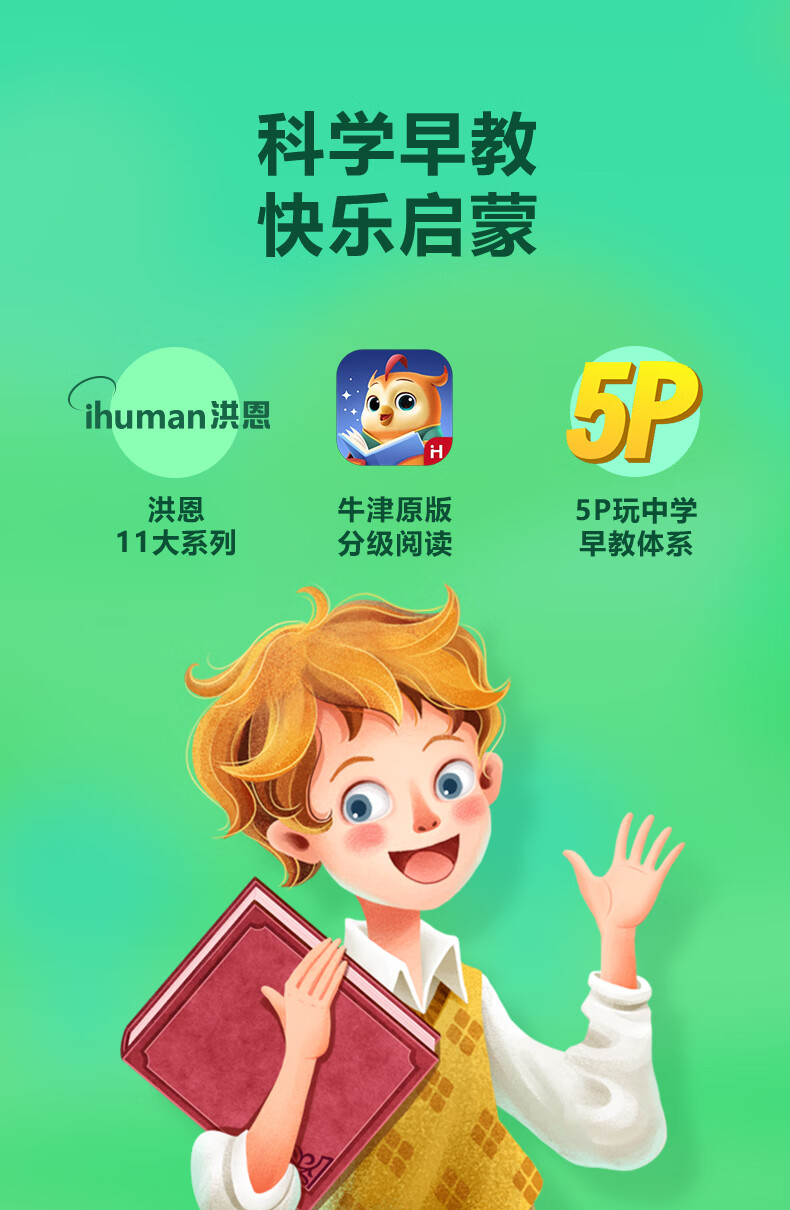 洪恩8大系列【终生免费】 洪恩识字;洪恩拼音;洪恩ABC;洪恩双语绘本;洪恩分级阅读;洪恩思维;洪恩小画家;洪恩十万问; 5大能力素养模型:社会力,语言力,思维力,创造力,认知力;“5P玩中学”早教体系通过益智游戏和学习互动,分龄分段引导孩子”乐中启智“、”玩中创造“,系统构建武大能力素养模型; 全国官方正版教材覆盖95%以上,同步AI互动课,学透新教材,领跑新学期;针对孩子不同学习能力,构建”同步-专项-培优“课程分层体系;全智能作业辅导(定时长、讲难题、批作业、练错题、刷考题);家长管控,一键防沉迷,学习情况一目了然
