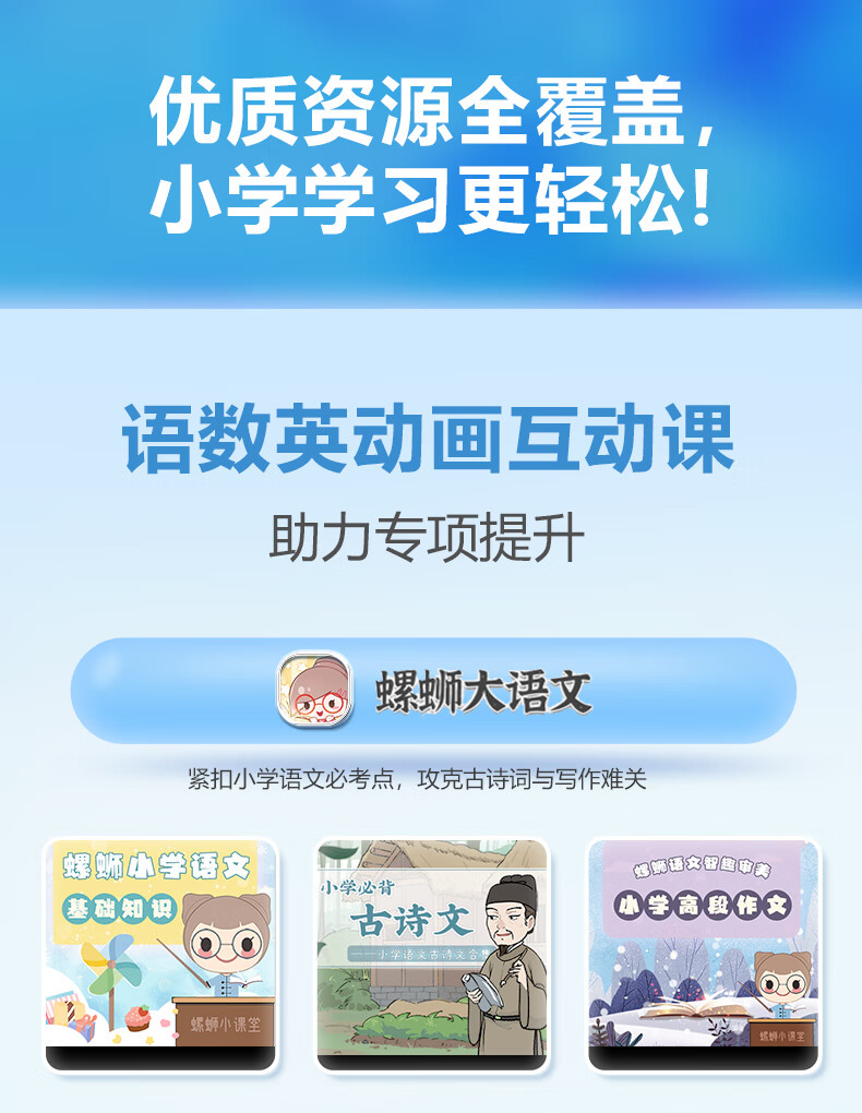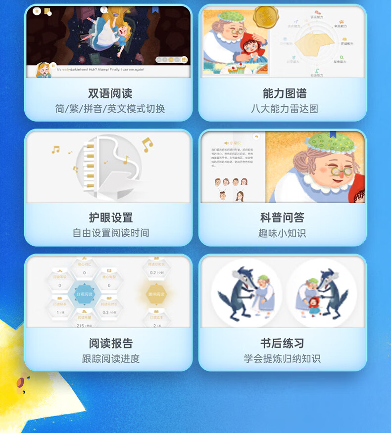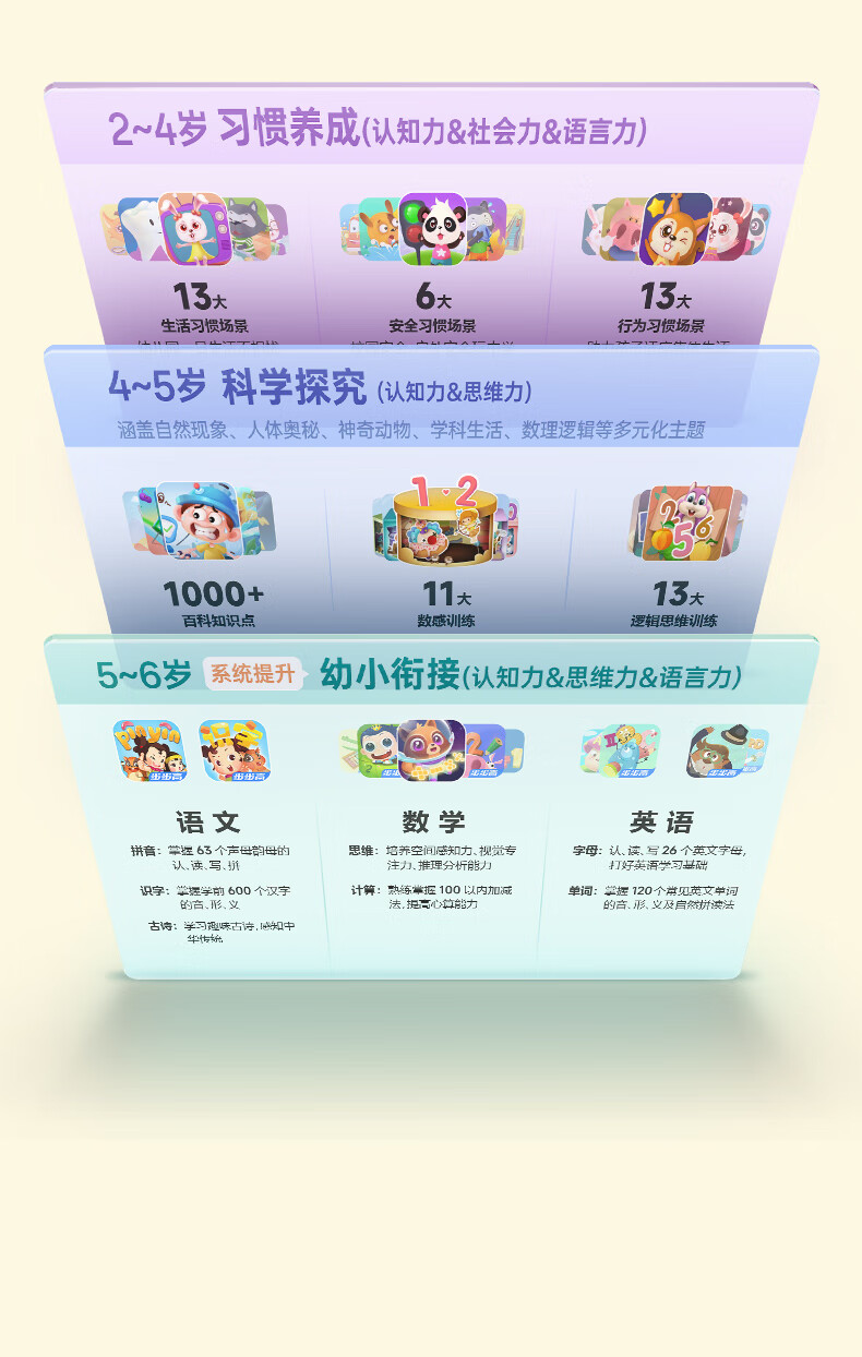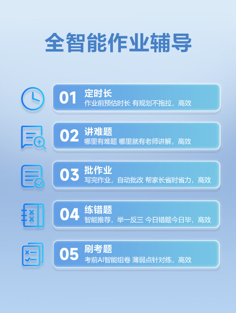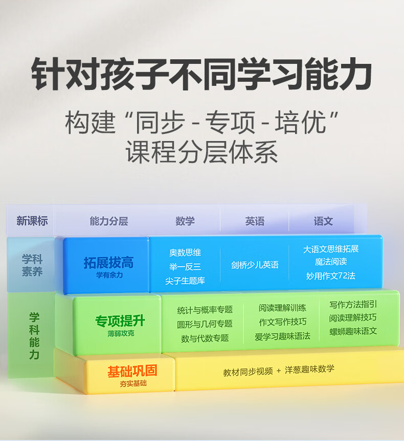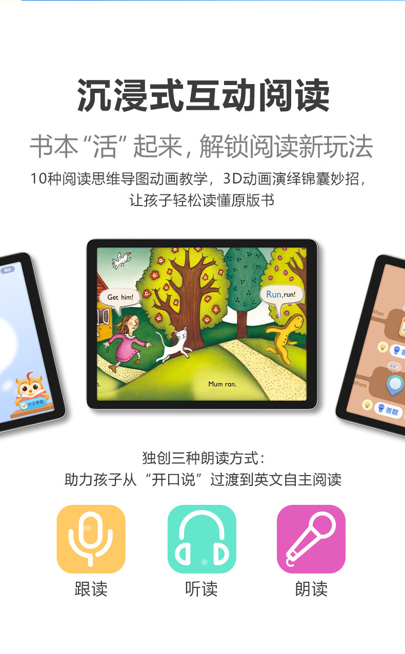 洪恩8大系列【终生免费】 洪恩识字;洪恩拼音;洪恩ABC;洪恩双语绘本;洪恩分级阅读;洪恩思维;洪恩小画家;洪恩十万问; 5大能力素养模型:社会力,语言力,思维力,创造力,认知力;“5P玩中学”早教体系通过益智游戏和学习互动,分龄分段引导孩子”乐中启智“、”玩中创造“,系统构建武大能力素养模型; 全国官方正版教材覆盖95%以上,同步AI互动课,学透新教材,领跑新学期;针对孩子不同学习能力,构建”同步-专项-培优“课程分层体系;全智能作业辅导(定时长、讲难题、批作业、练错题、刷考题);家长管控,一键防沉迷,学习情况一目了然