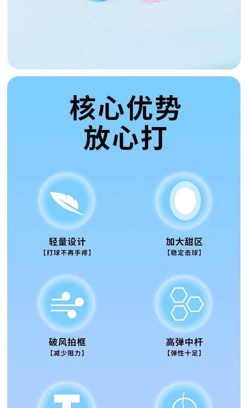 产品介绍: 中杆采用碳纤维材质,韧性强,结合铝框设计,让球拍既轻盈又坚韧,节省体力的同时又极富攻击性,是准专业级选手的优选装备 拍杆一体成型,流线性的设计,能有效减少阻力,力量传输更柔和 手柄处设减震模块,更好地保护手腕 产品规格: 马卡龙记忆碳羽毛球拍x2 、双层牛津包x1 重量:0.38KG 材质:碳纤维、铝、 碳线、杨木、PVC