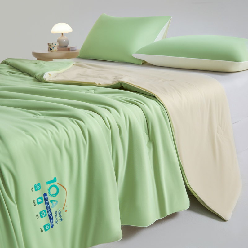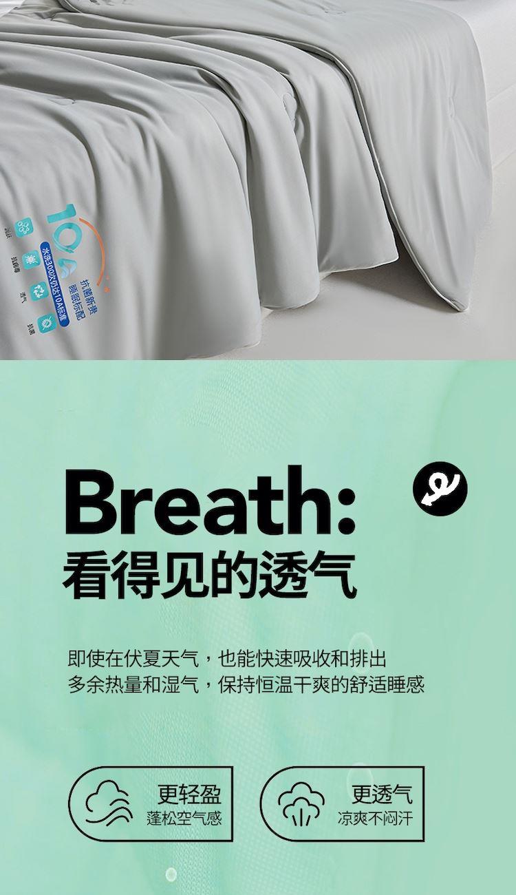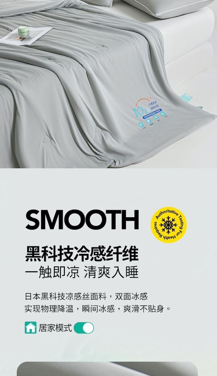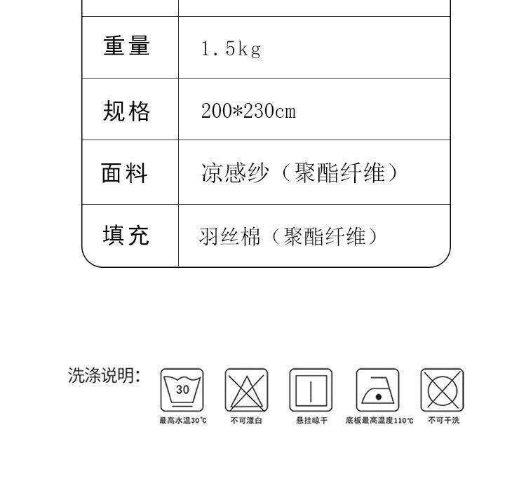 规格:200*230cm 面料:凉感纱(氨纶+聚酯纤维) 填充:羽丝棉(聚酯纤维) 重量:1.5kg 卖点:1.良好的透气度,给您清爽的舒适 2.利用独特的纤维断面结构,从而降低身体的温度 3.生产过程中不添加任何荧光剂,从里到外都很安心