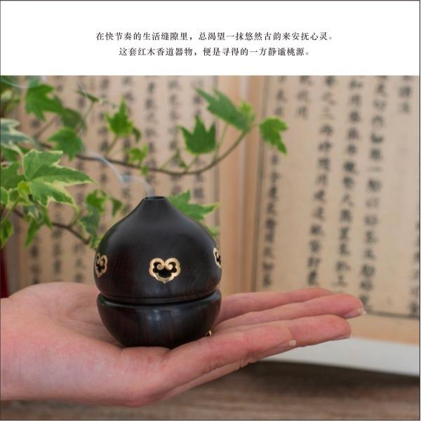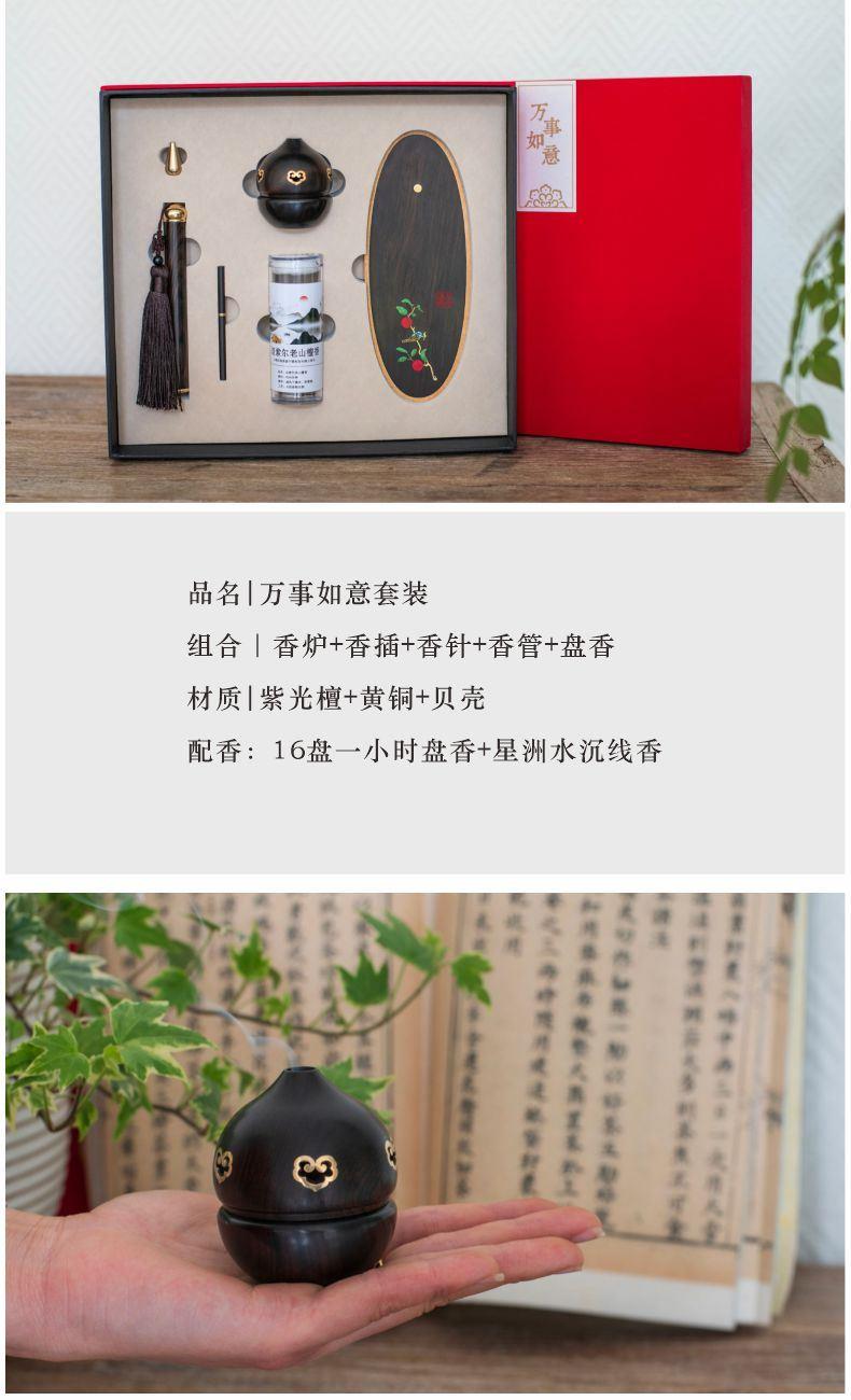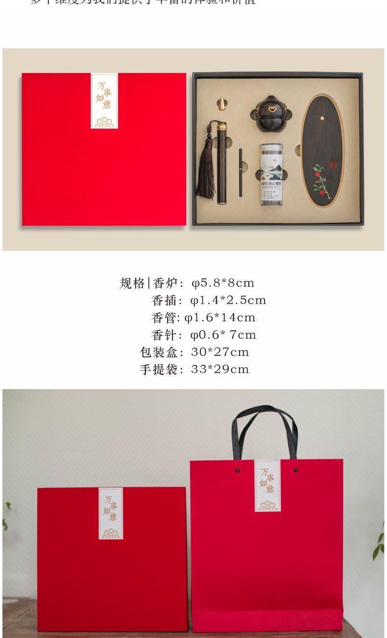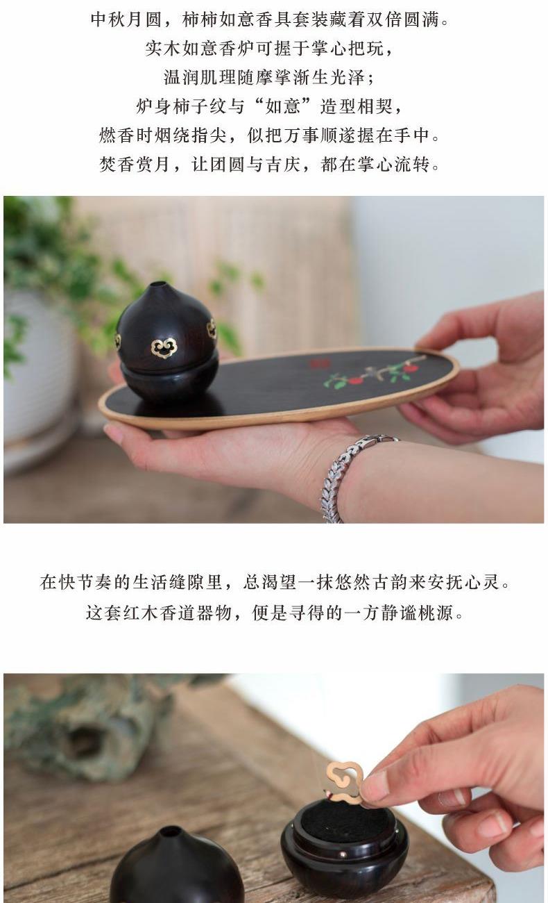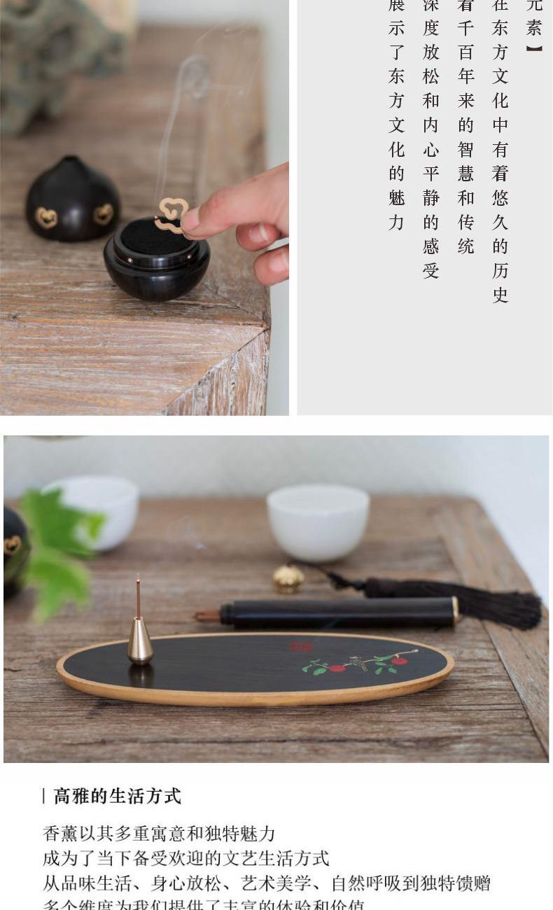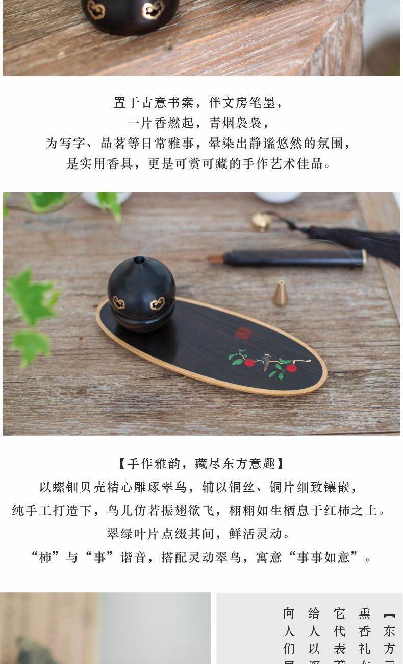 【柿】与【事】谐音双关,喜鹊报禧,寓意——万事顺遂,佳期可期! 【纯手工镶嵌「柿柿如意」香具:手作雅韵,藏尽东方意趣】 以螺钿贝壳精心雕琢翠鸟,辅以铜丝、铜片细致镶嵌,纯手工打造下,鸟儿仿若振翅欲飞,栩栩如生栖息于红柿之上。翠绿叶片点缀其间,鲜活灵动。“柿”与“事”谐音,搭配灵动翠鸟,寓意“事事如意”。香具置于案头,燃香时,青烟袅袅漫过这精巧图景,为书房、茶室晕染出雅致且充满美好期许的氛围,既是实用香器,更是承载东方美学与吉祥祝愿的手作臻品。 参数 组合|香炉+香插+香针+香管+盘香 材质|紫光檀+黄铜+贝壳 规格|香炉:φ5.8*8cm 香插:φ1.4*2.5cm 香管: φ1.6*14cm 香针:φ0.6* 7cm 包装盒:30*27cm 手提袋:33*29cm 配香:16盘一小时盘香+星洲水沉线香