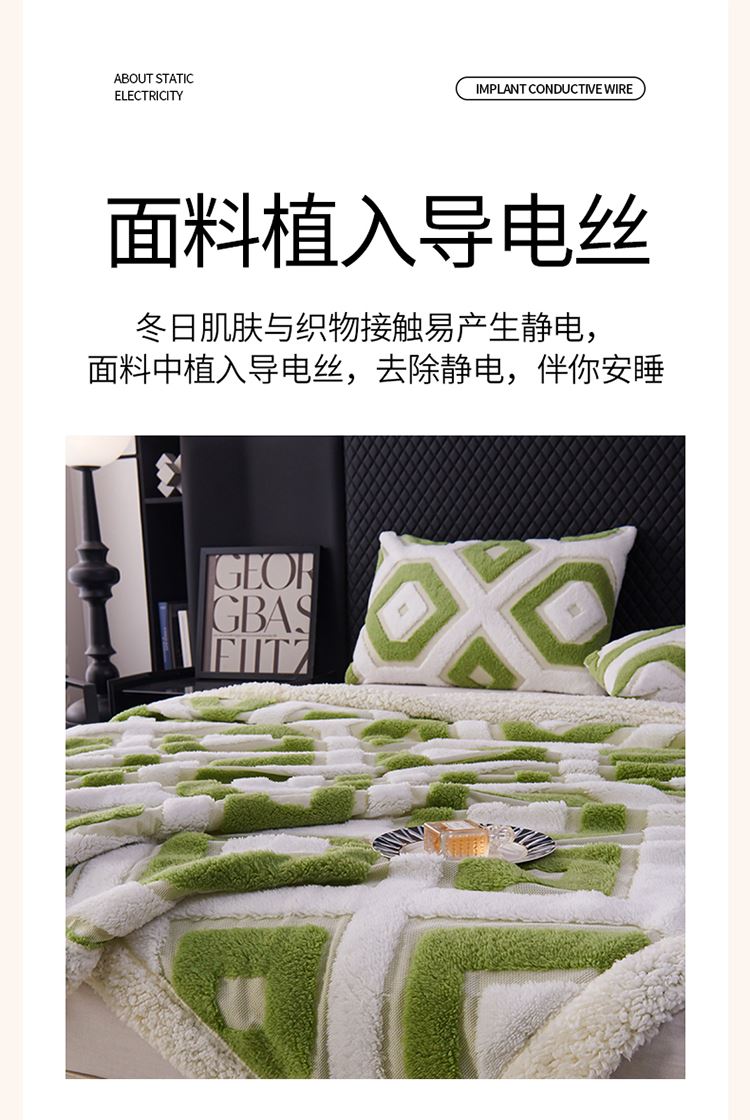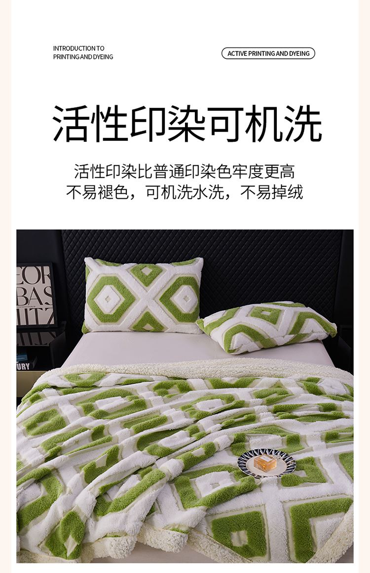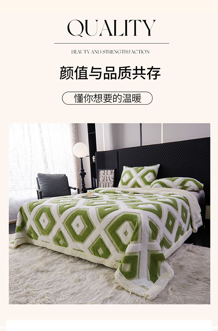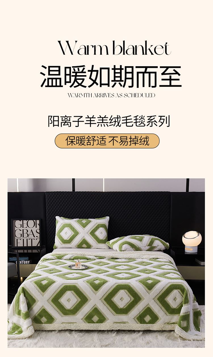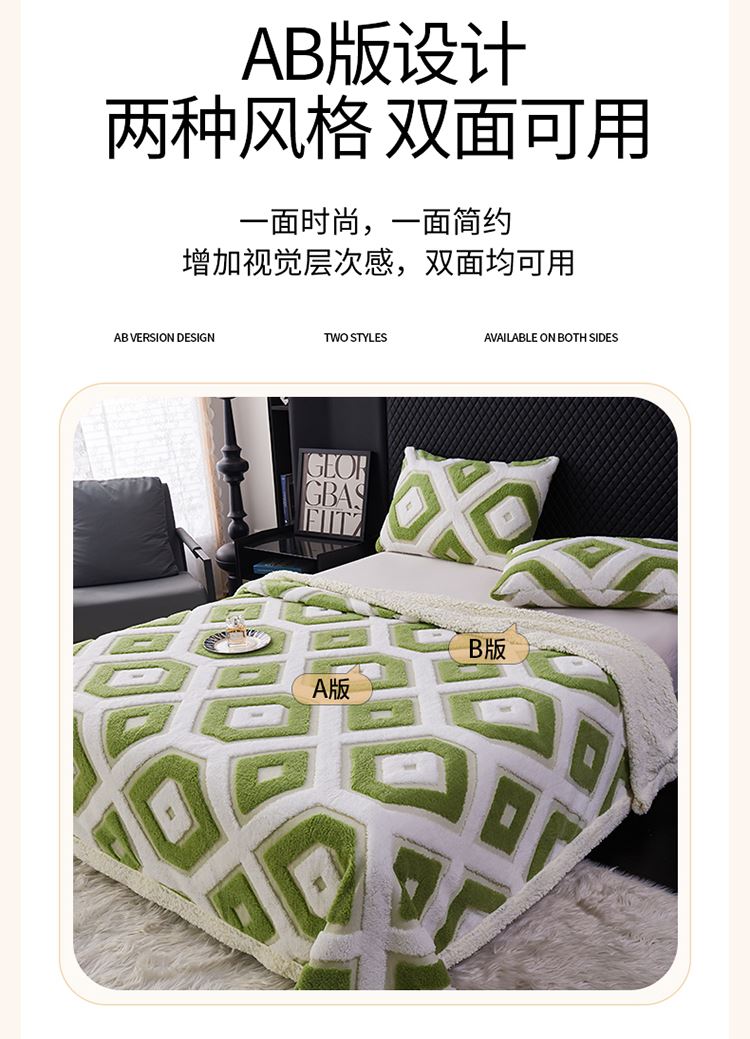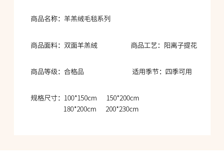 1:温暖如期而至,阳离子羊羔绒毛毯系列 保暖舒适不易掉绒 2:绒毛丰盈,细腻质感盖在身上舒适又保暖 3:AB版设计两种风格 双面可用 一面时尚,一面简约增加视觉层次感,双面均可用 4:尺寸:180*200cm 5:包装:彩盒 6:重量:约1.5kg
