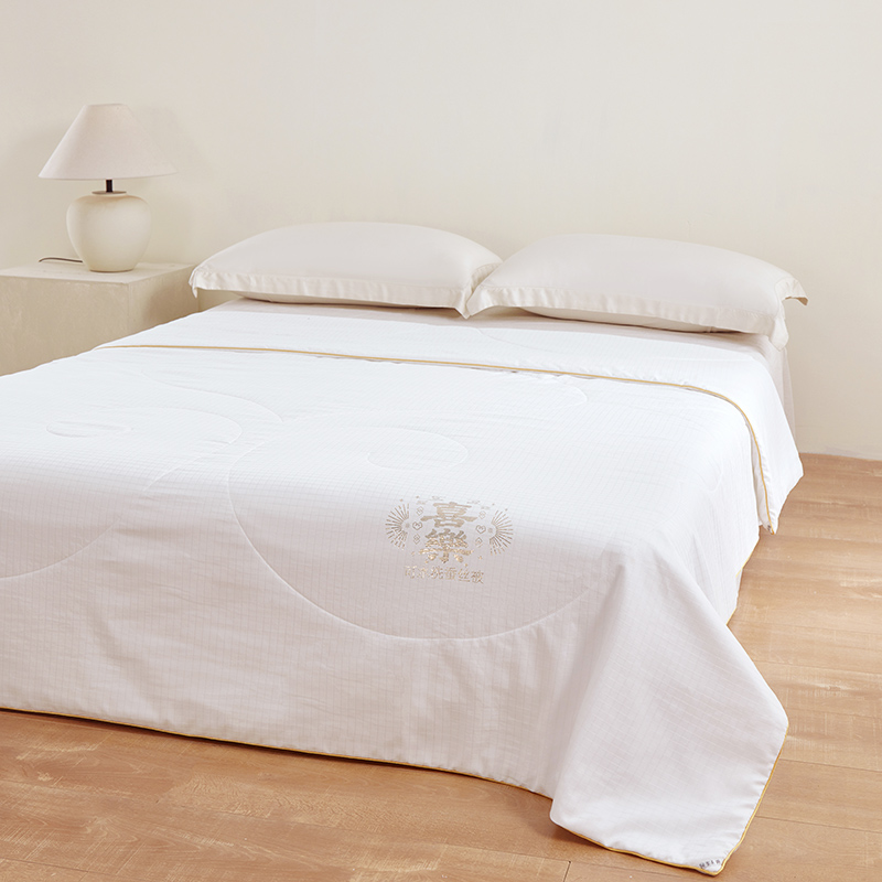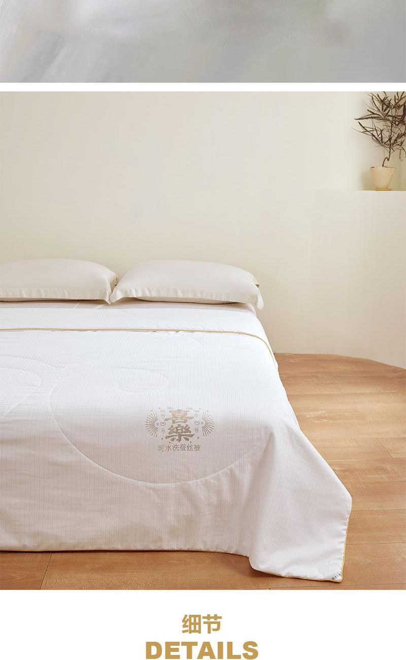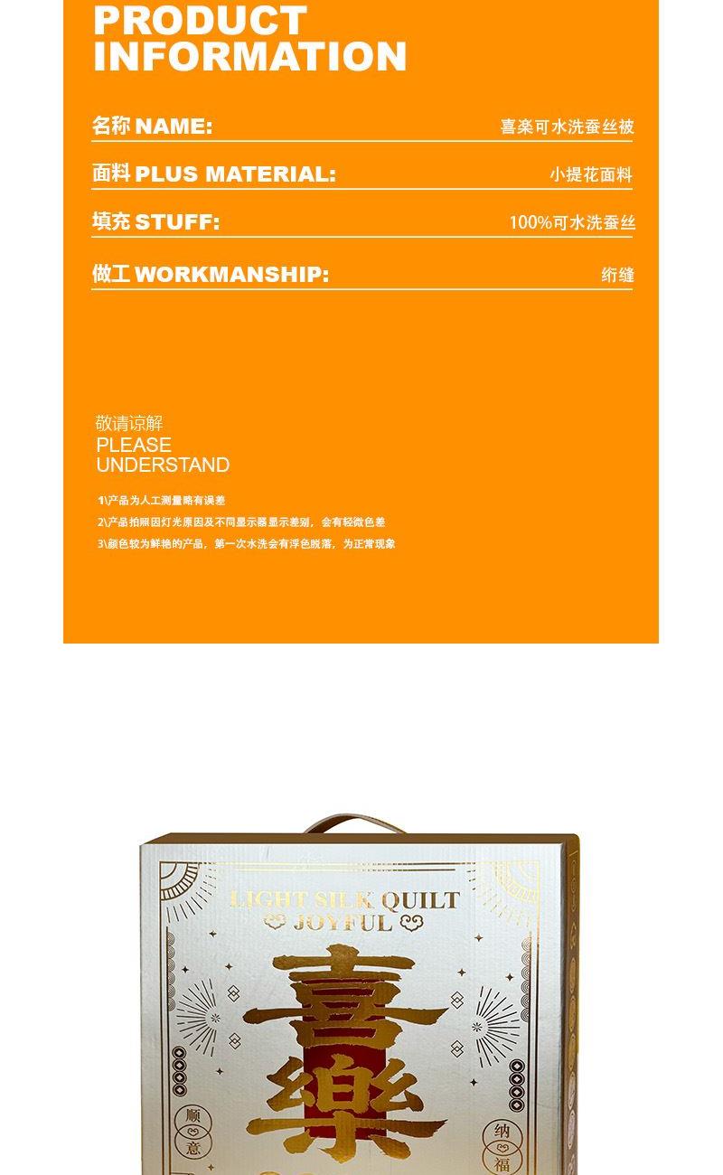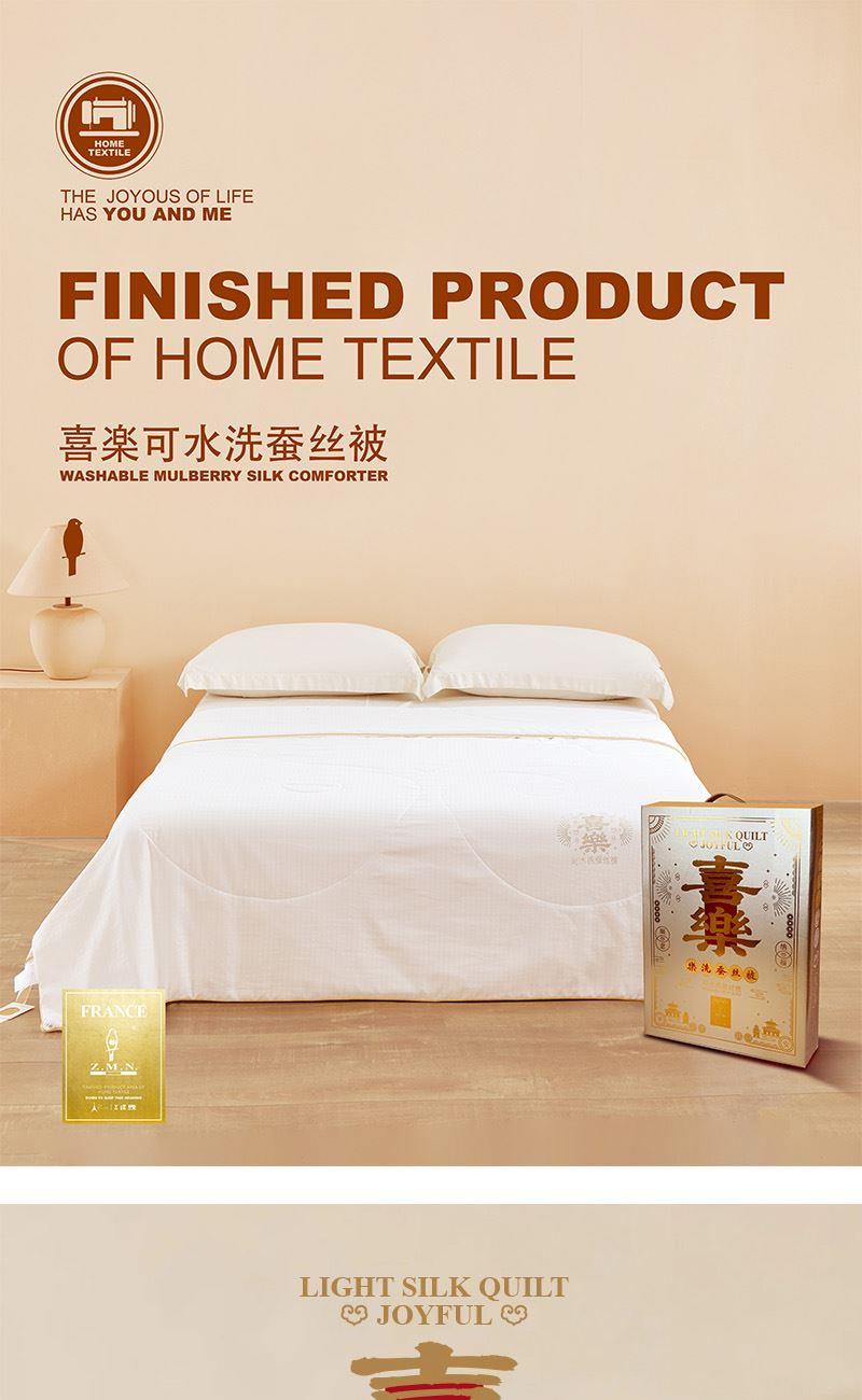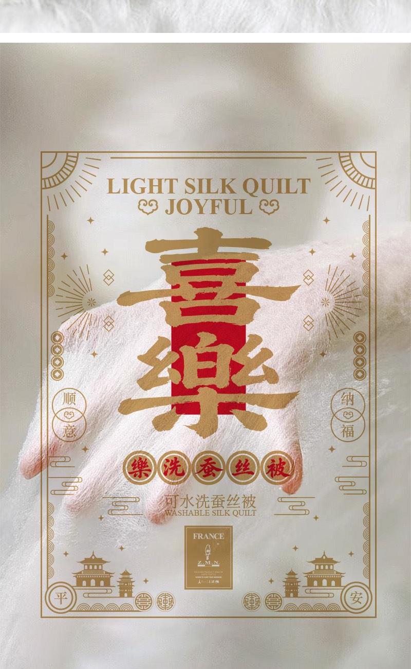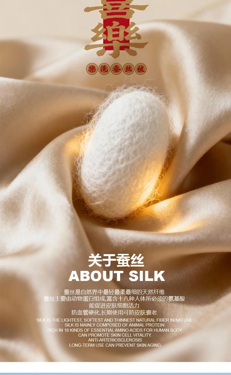 面 料:聚酯纤维 规 格:200x230cm 填充物:蚕丝 重 量: 1420g 卖点:1、采用蚕丝(长丝)填充,创新可水洗处理,解决蚕丝被不可水洗的痛点。 2、蚕丝是天然蛋白纤维,富含氨基酸,吸湿透气,柔软光滑,是被芯填充材质的佼佼者。 3、“喜樂”樂洗巧妙寓意设计,传递美好情感。