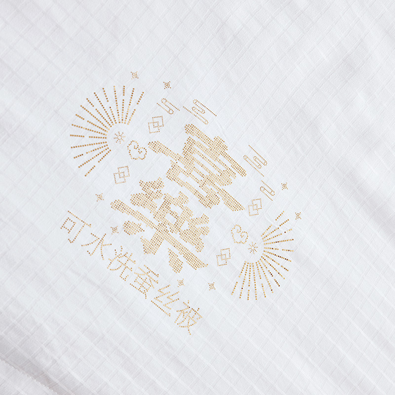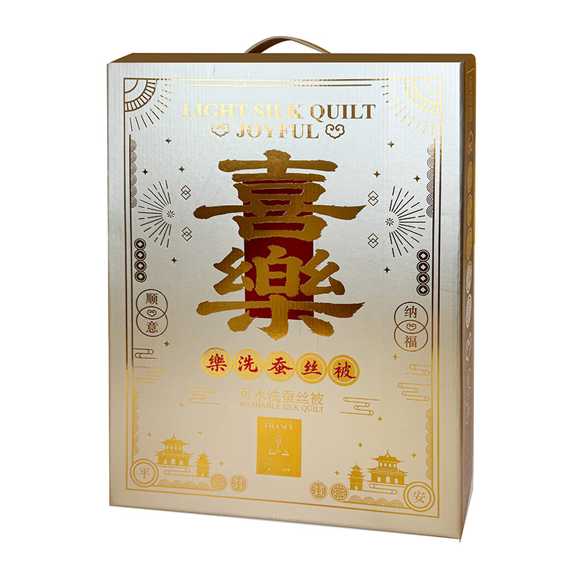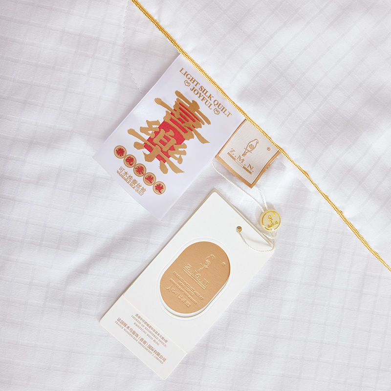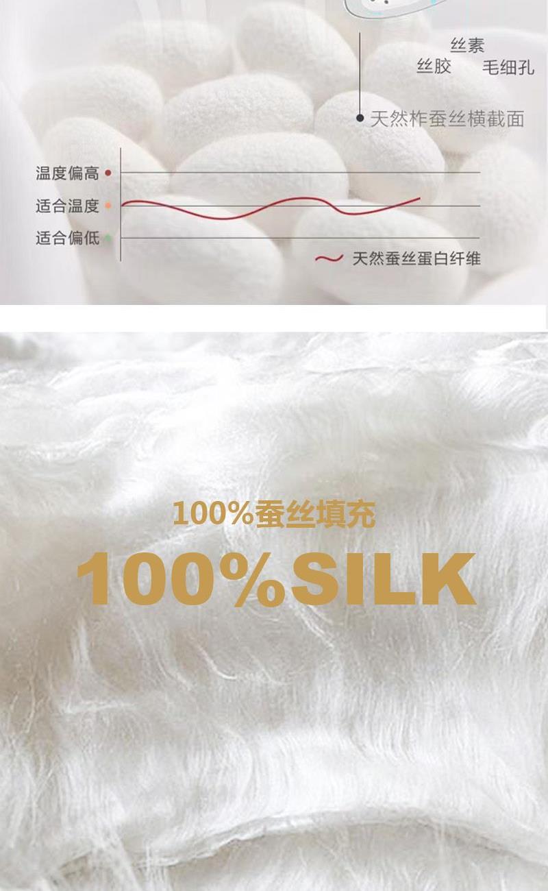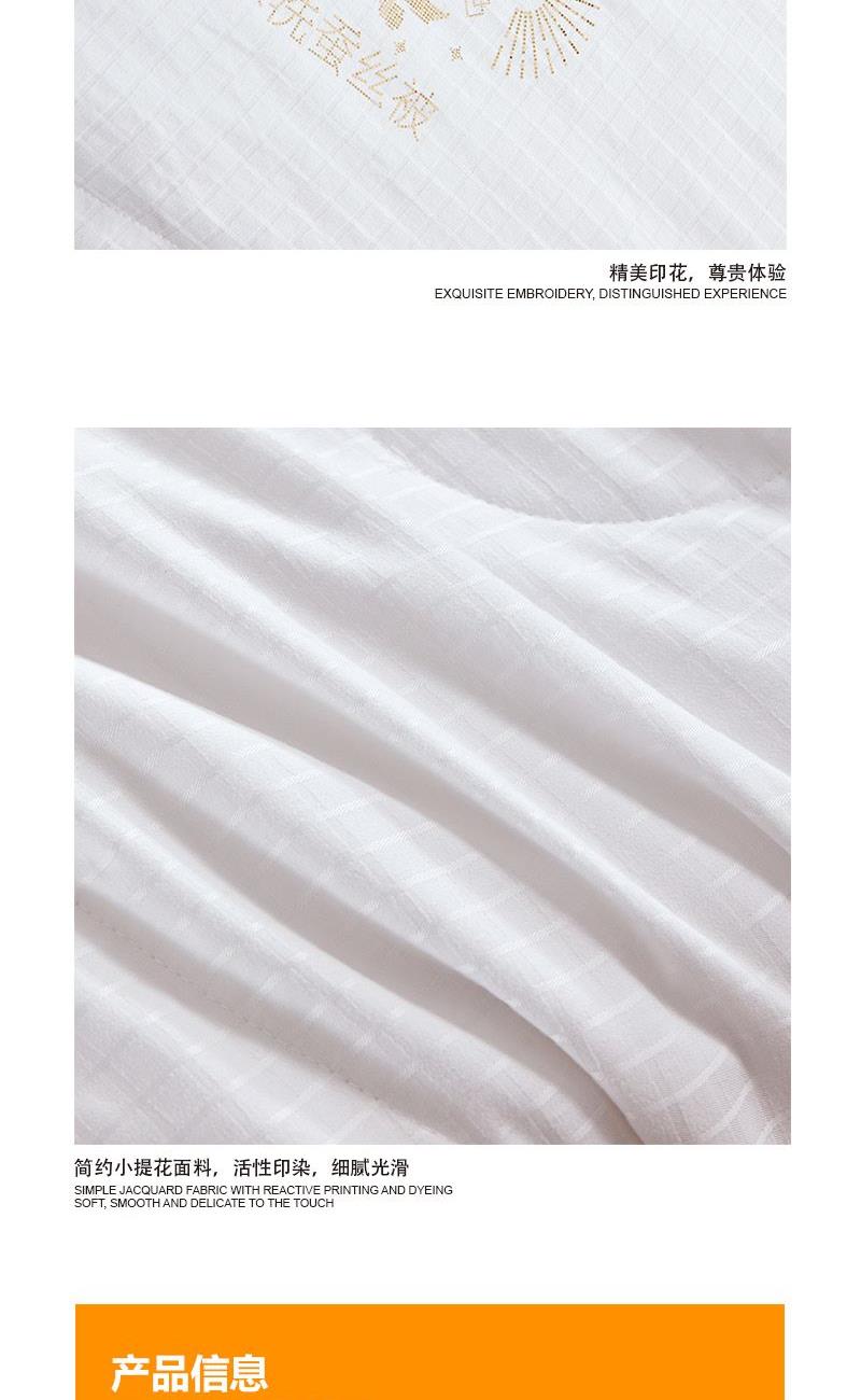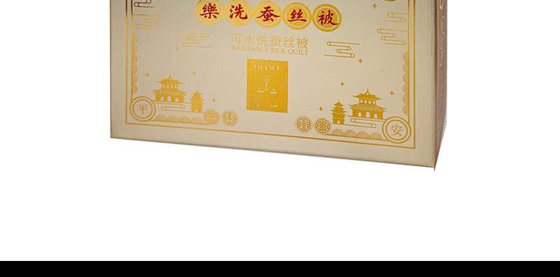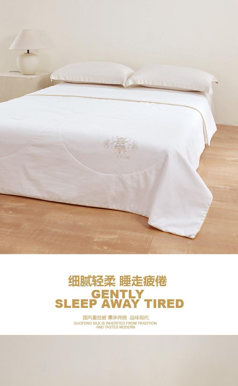 面 料:聚酯纤维 规 格:200x230cm 填充物:蚕丝 重 量: 1420g 卖点:1、采用蚕丝(长丝)填充,创新可水洗处理,解决蚕丝被不可水洗的痛点。 2、蚕丝是天然蛋白纤维,富含氨基酸,吸湿透气,柔软光滑,是被芯填充材质的佼佼者。 3、“喜樂”樂洗巧妙寓意设计,传递美好情感。