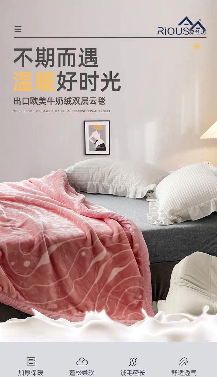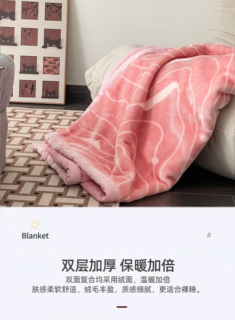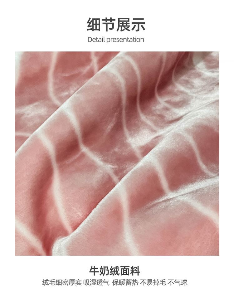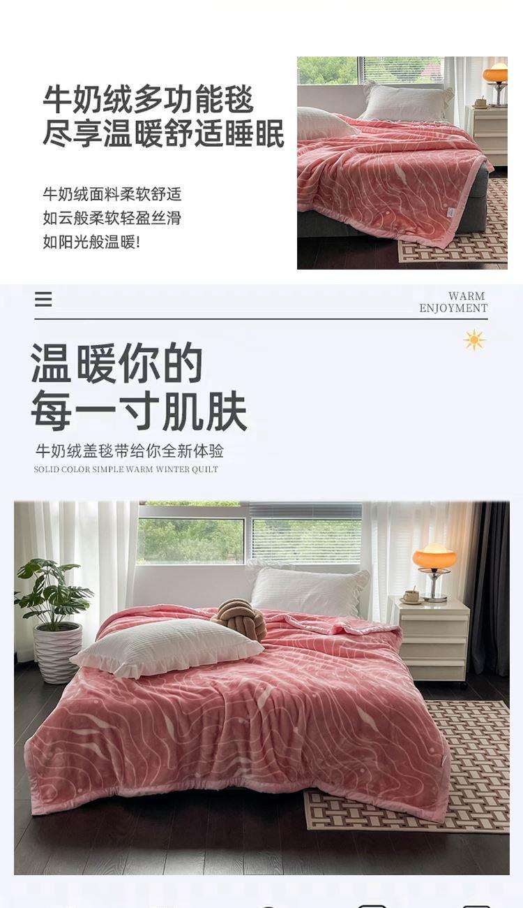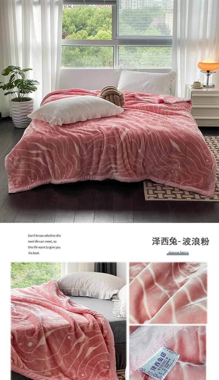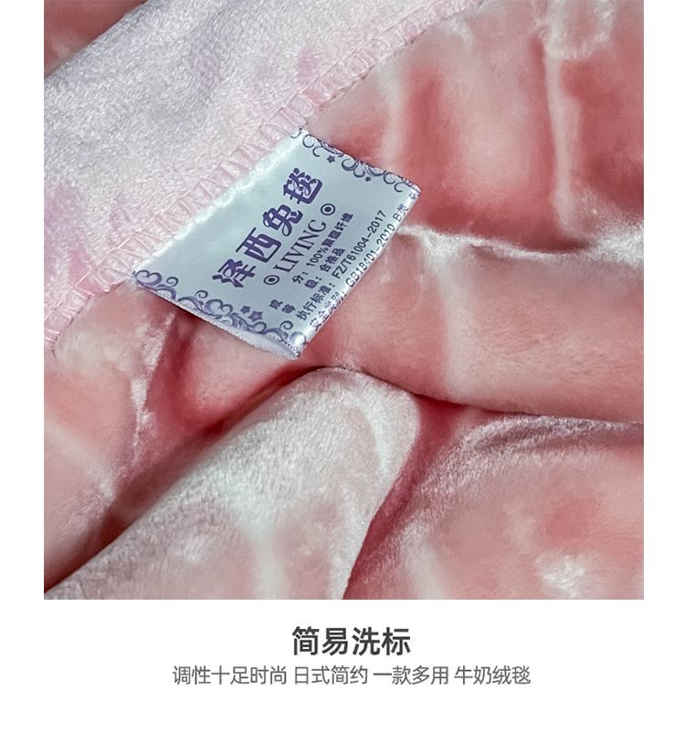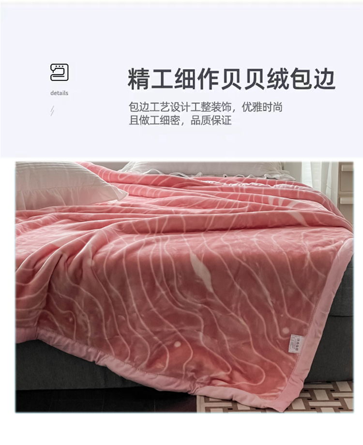 规格:200*230cm 2.8kg 面料:牛奶绒(聚酯纤维) 花色:波浪粉、黛蓝、魅力棕、千鸟格灰 云毯是以轻、薄、柔为理念的产品,云毯的美观性、舒适度、使用寿命等方面都要优于传统毛毯,并且具有水洗、机洗不变形、不影响毛面效果等优点,且亲肤度高,手感滑爽,同时对肌肤无任何刺激,颜色多彩靓丽,在冬日里,一触即暖的特性,深受大众喜爱。