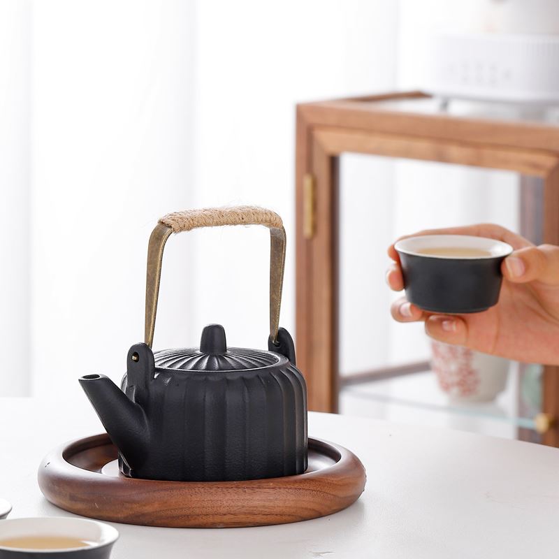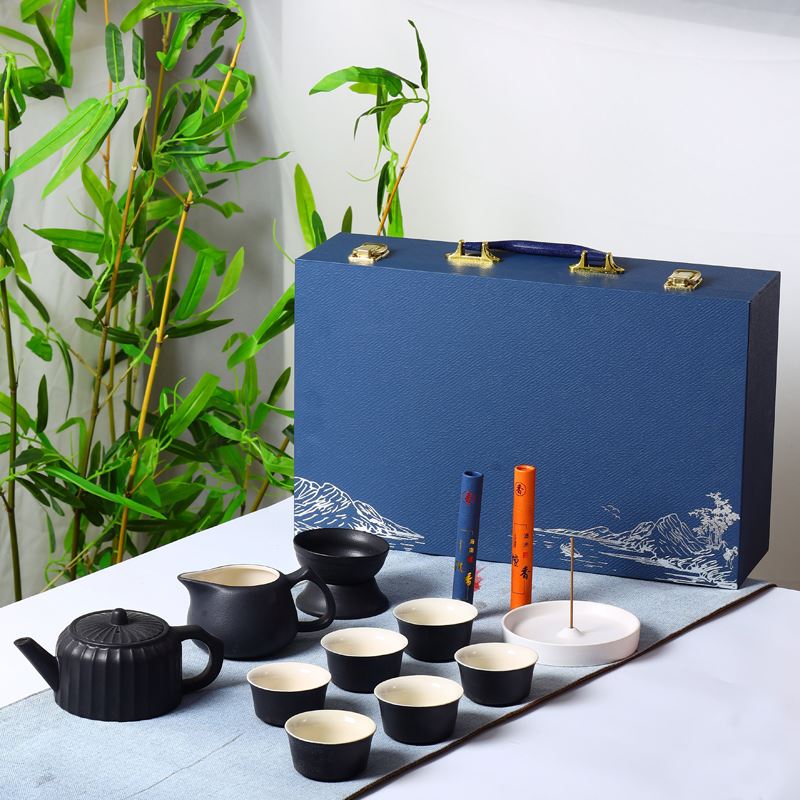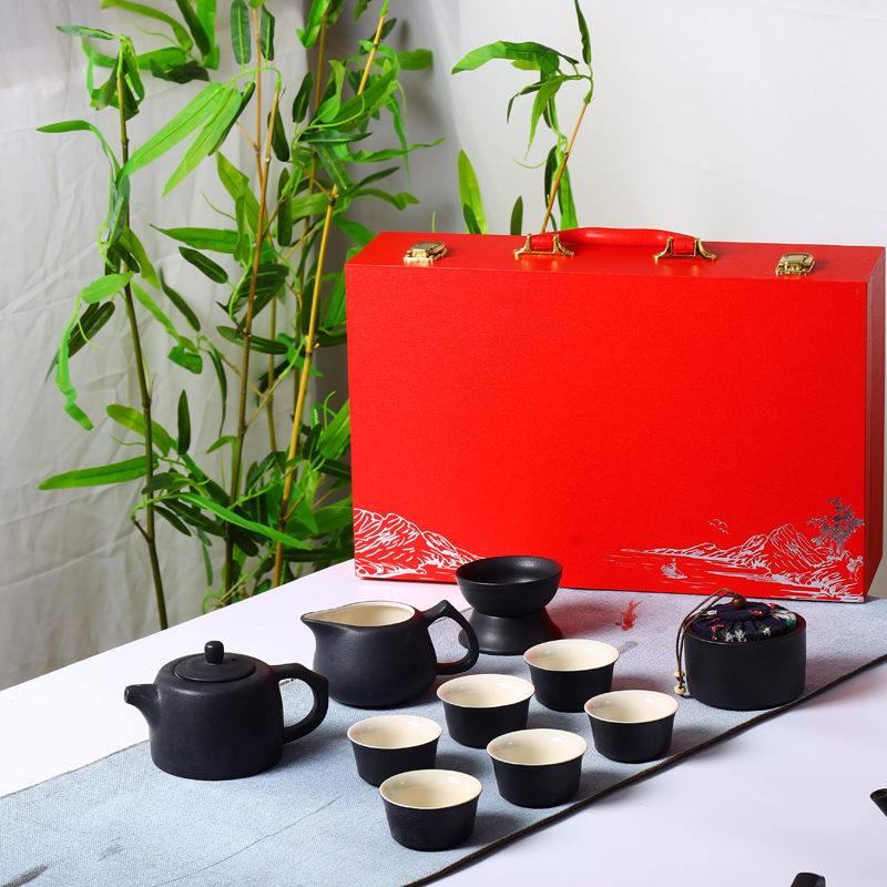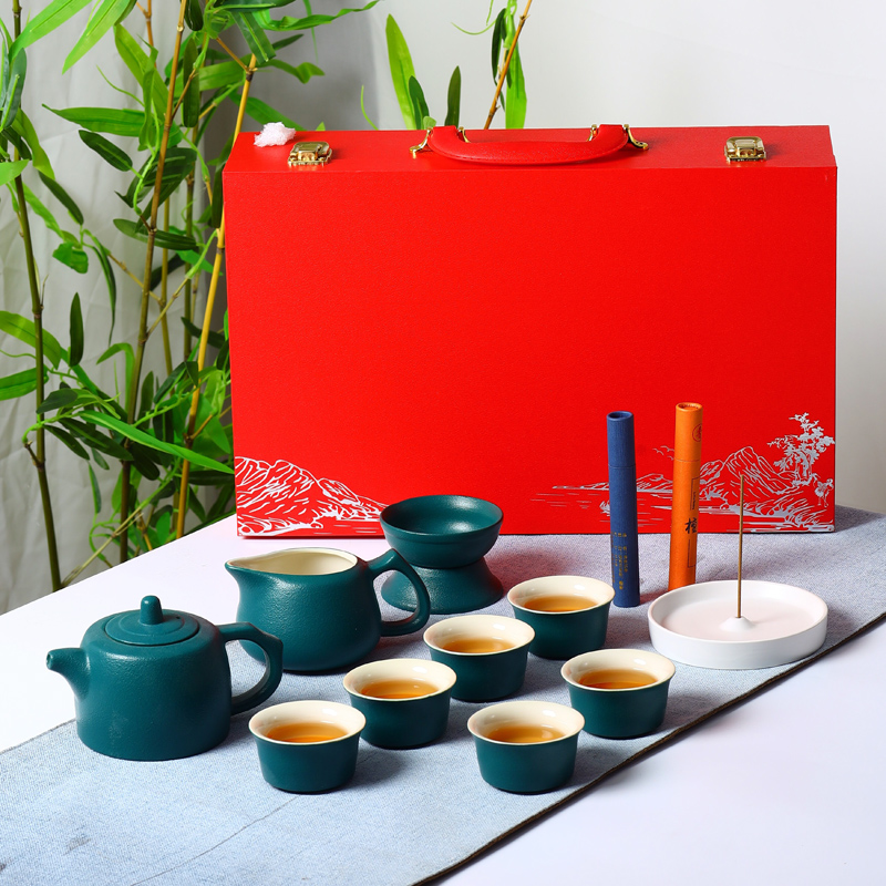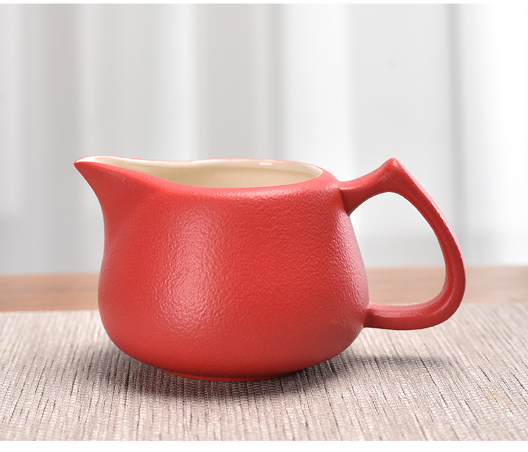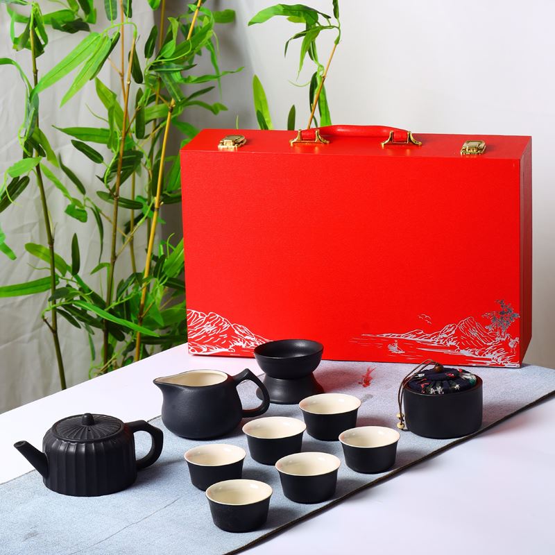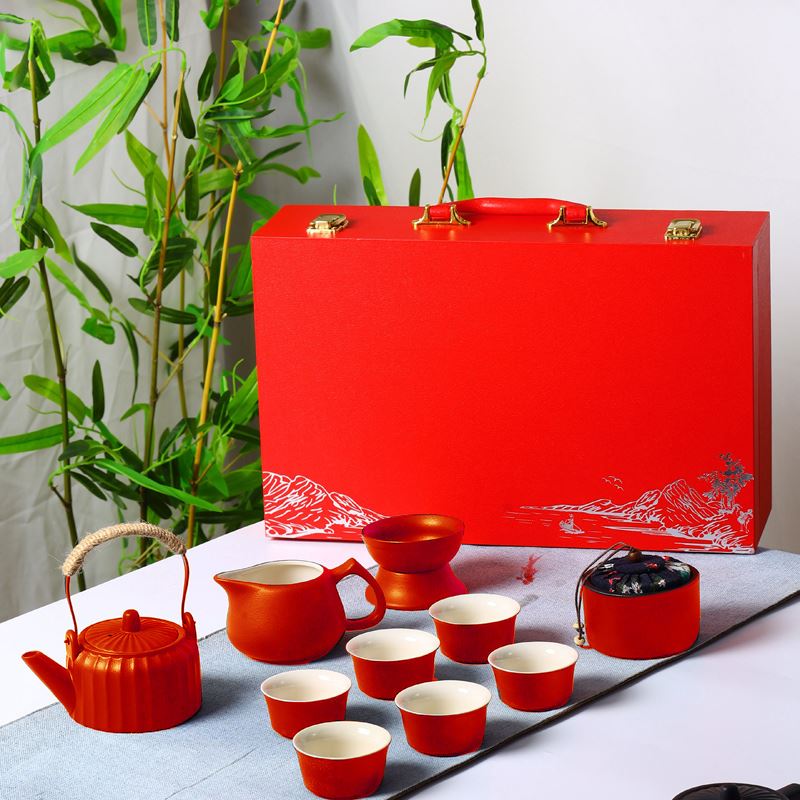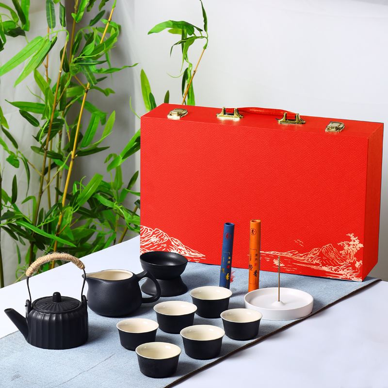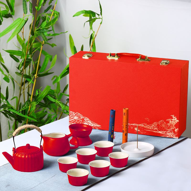 配制:1壶 6杯 1香盘2檀香/或1茶叶罐 1公道杯1茶托茶漏 1礼盒 材质:粗陶 规格: 茶壶:11.7*9.5cm 杯: 6.3*3.3cm 公道杯:11.9*8.5cm 茶叶罐: 8*7cm 推荐说明:红、黑色可选,多款壶型。亚光磨砂釉茶具,手感舒适。13头一应俱全,大气实用