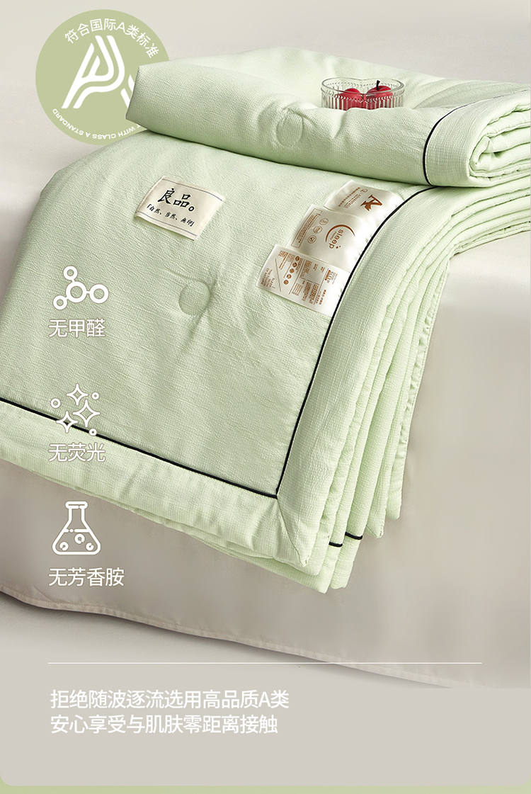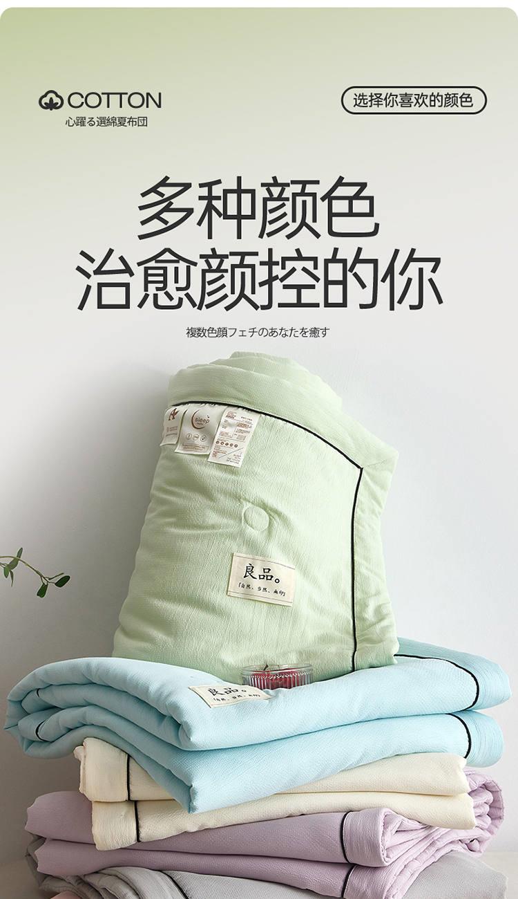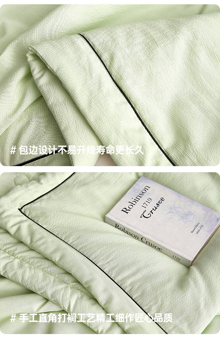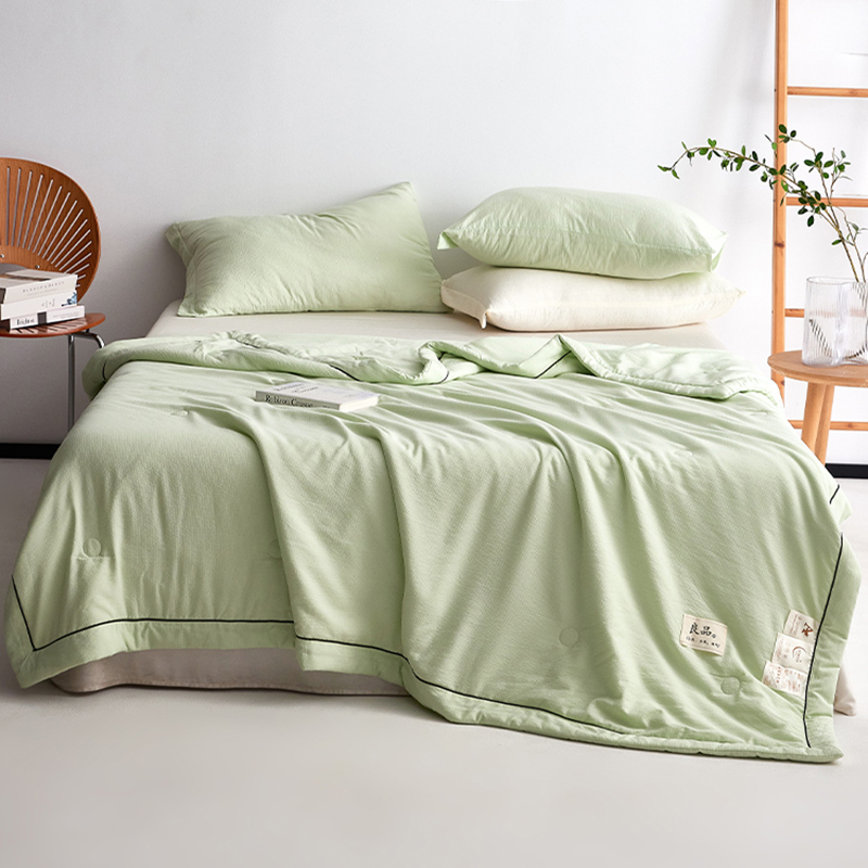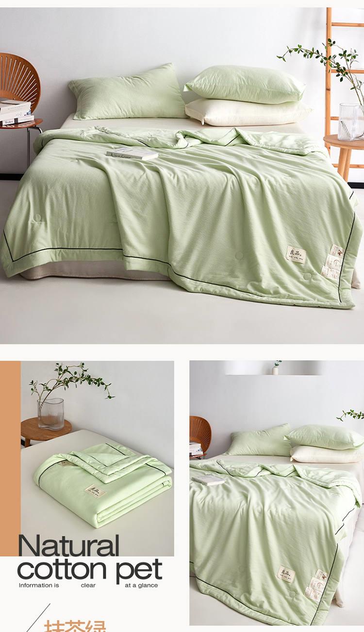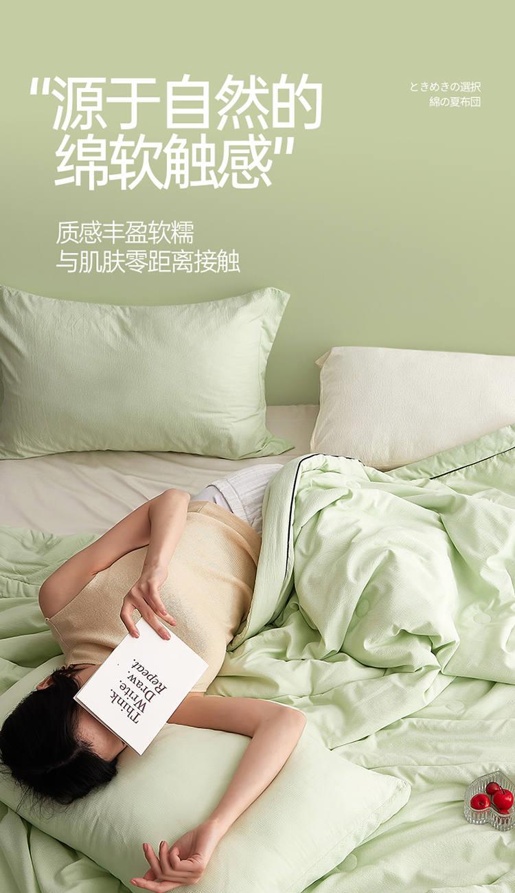 规 格:150*200cm 花 型:抹茶绿/象牙白/迷雾紫/太湖蓝/钛金灰/仙草粉 面 料:聚酯纤维 填充物:整张羽丝棉(聚酯纤维) 工 艺:定位绗缝 A类级别夏被,无甲醛无荧光无芳香胺,泡泡棉纱质面料柔软光滑,吸湿透气,不易变形,敏感肌肤适用;泡泡棉的透气性能十分良好且拥有吸湿快干的优点,优质整张羽丝棉填充,蓬松柔软;无惧机洗水洗,久洗如新,解放双手;细节满分,手工直角包边 不易开线 更加耐用。