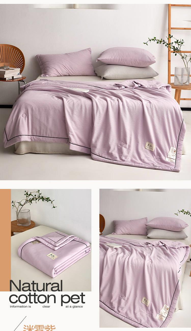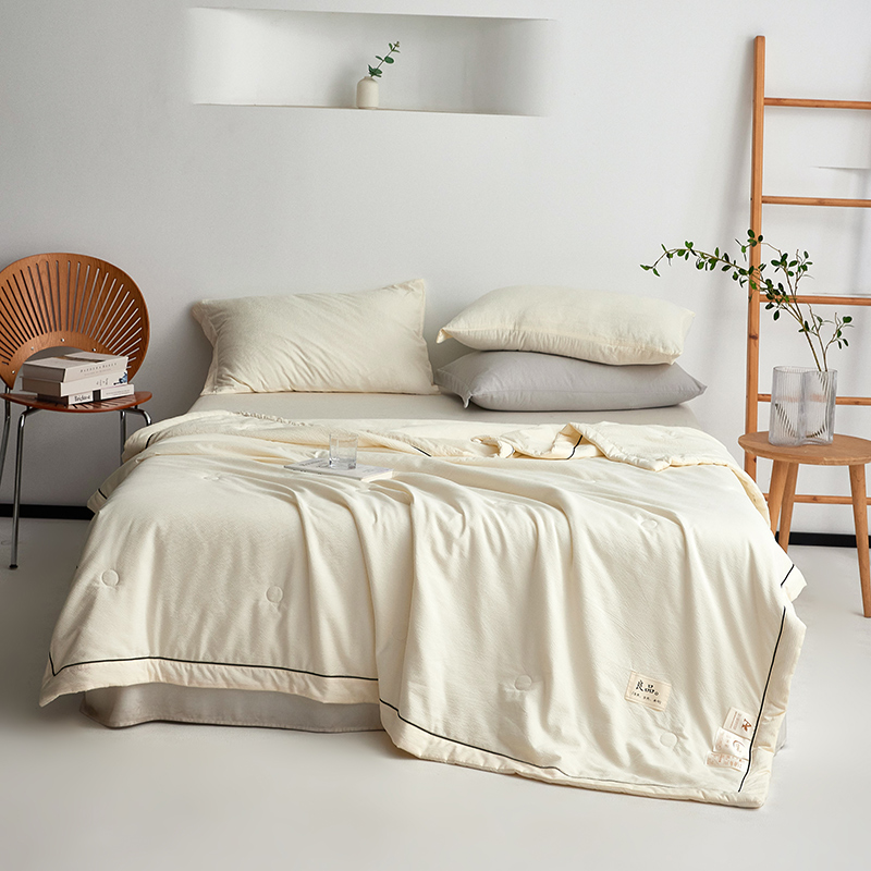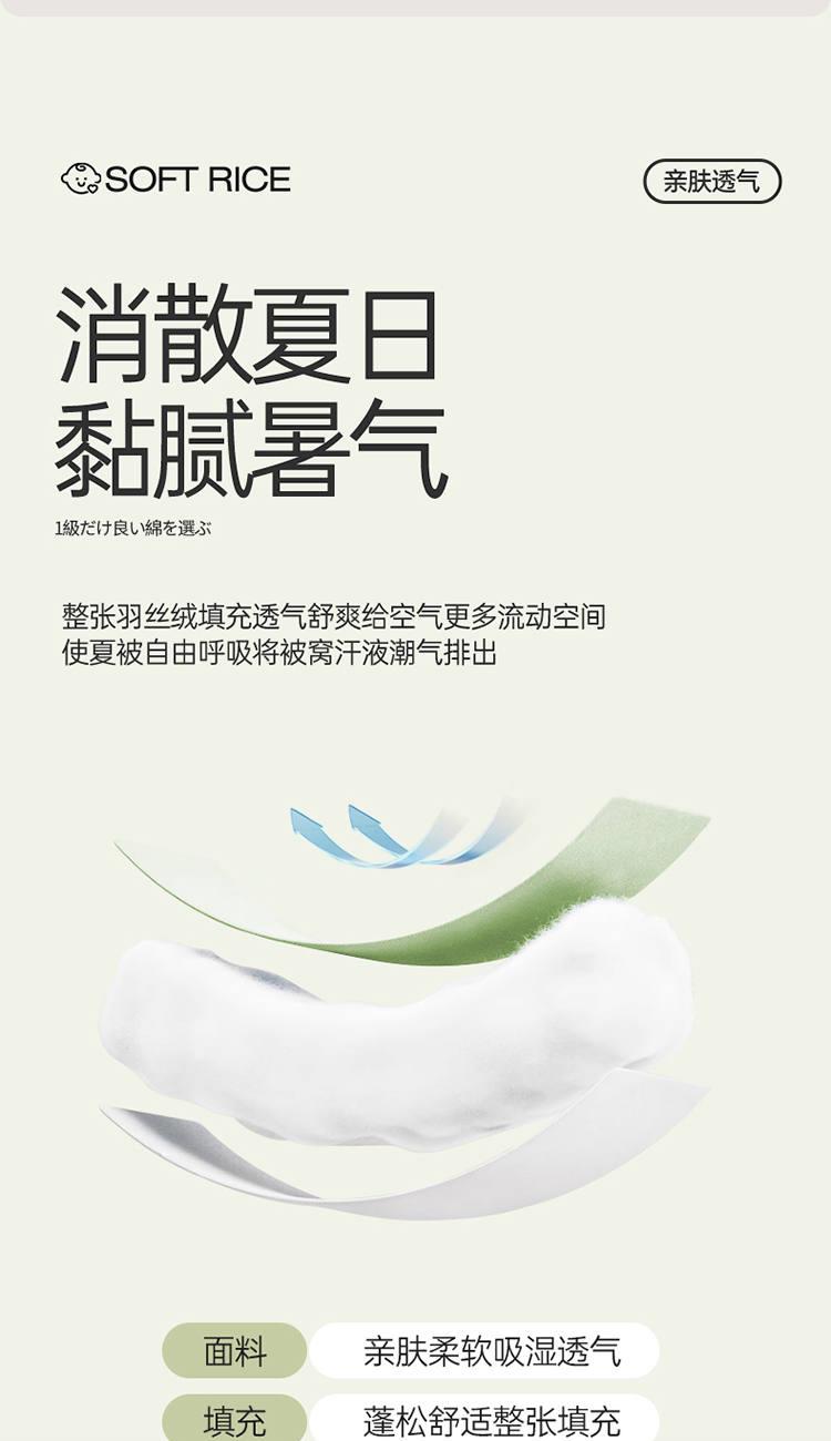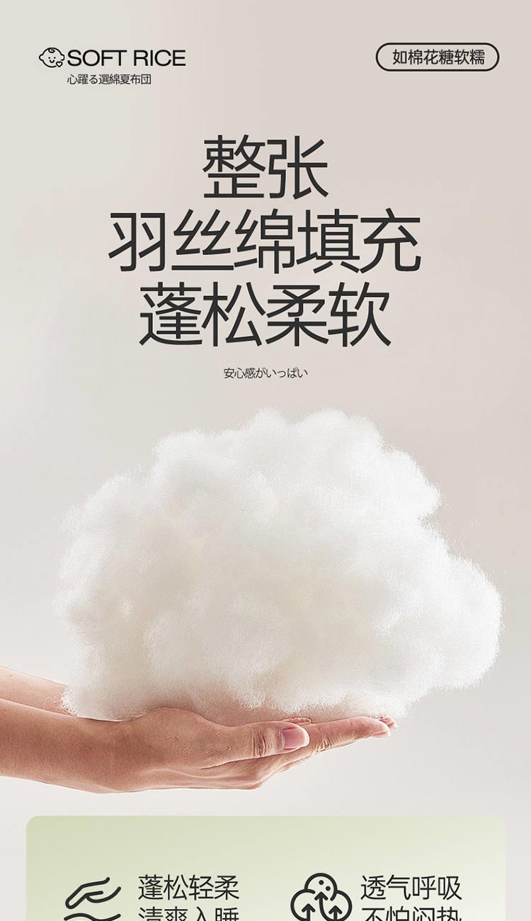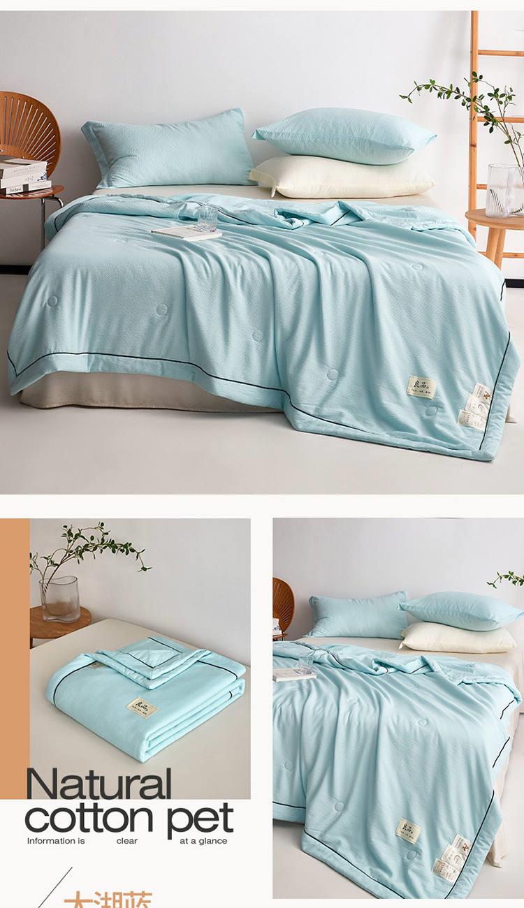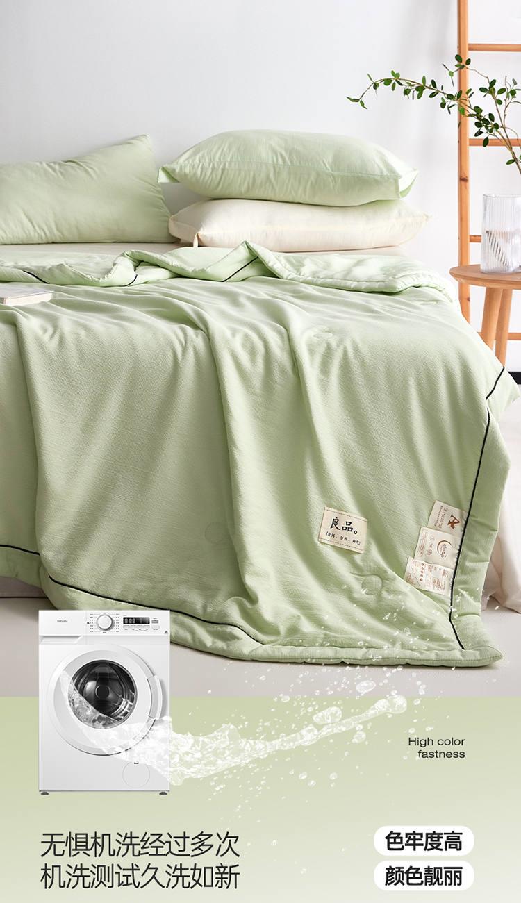 规 格:150*200cm 花 型:抹茶绿/象牙白/迷雾紫/太湖蓝/钛金灰/仙草粉 面 料:聚酯纤维 填充物:整张羽丝棉(聚酯纤维) 工 艺:定位绗缝 A类级别夏被,无甲醛无荧光无芳香胺,泡泡棉纱质面料柔软光滑,吸湿透气,不易变形,敏感肌肤适用;泡泡棉的透气性能十分良好且拥有吸湿快干的优点,优质整张羽丝棉填充,蓬松柔软;无惧机洗水洗,久洗如新,解放双手;细节满分,手工直角包边 不易开线 更加耐用。