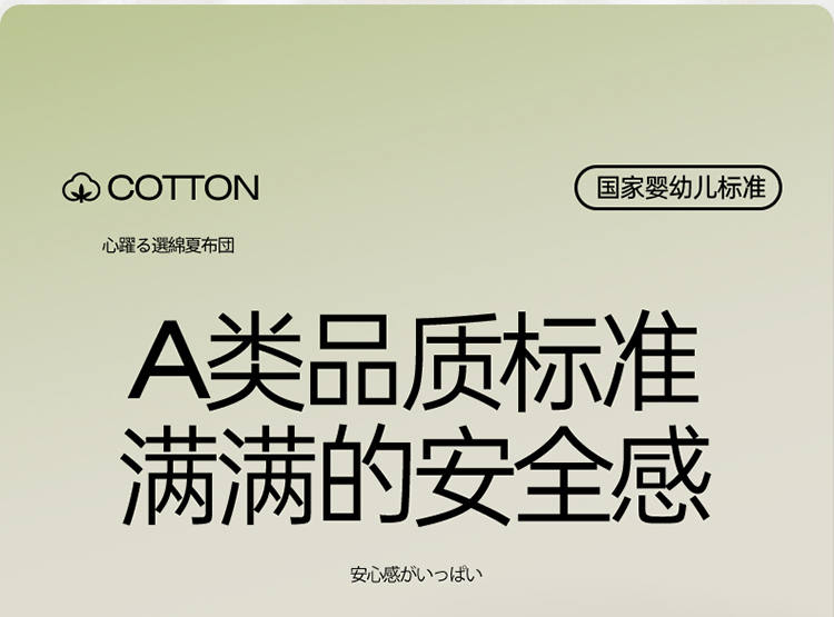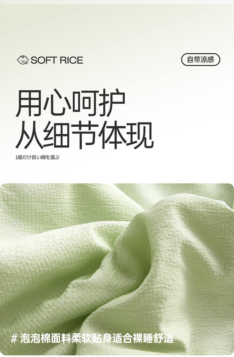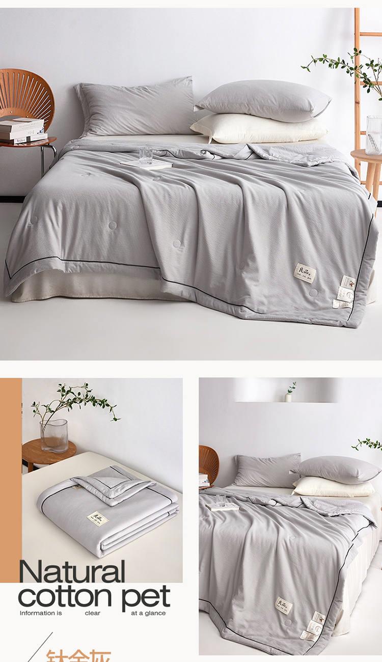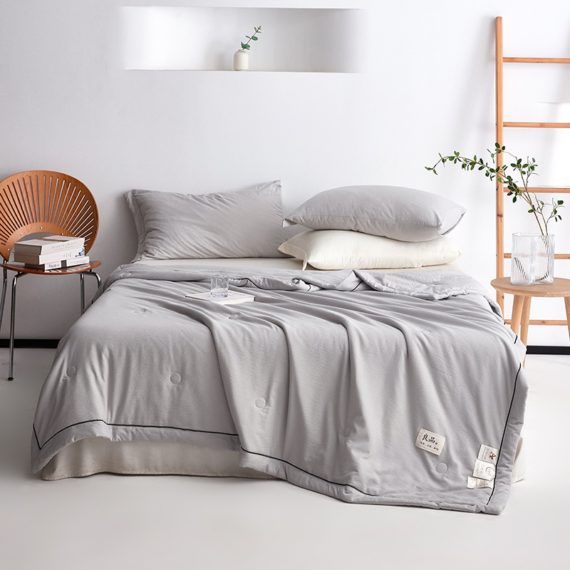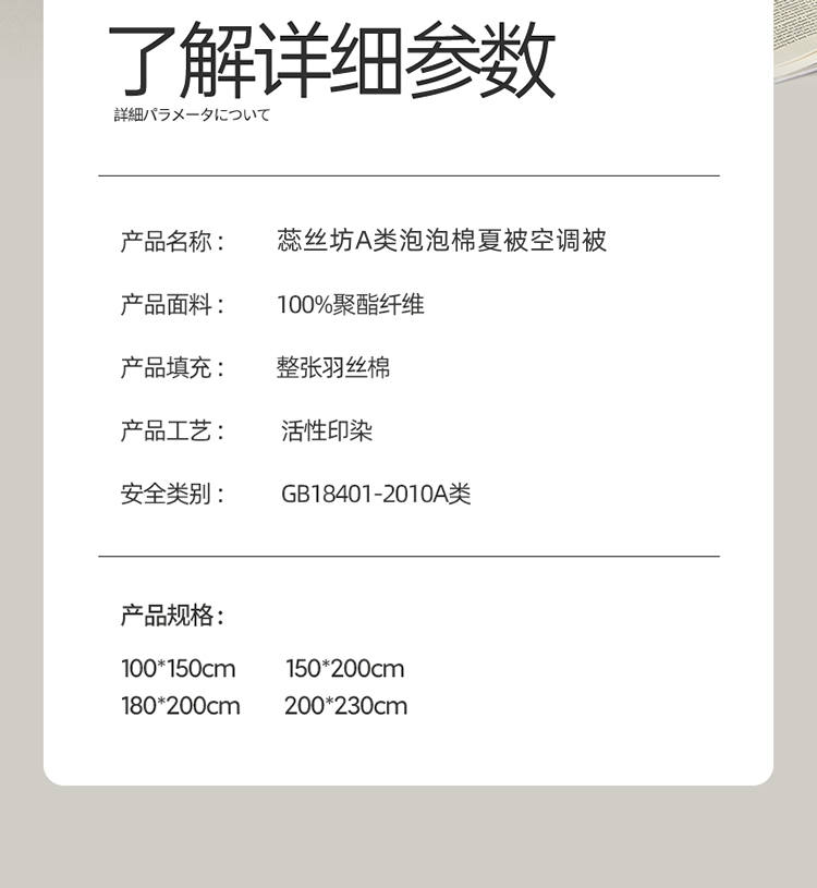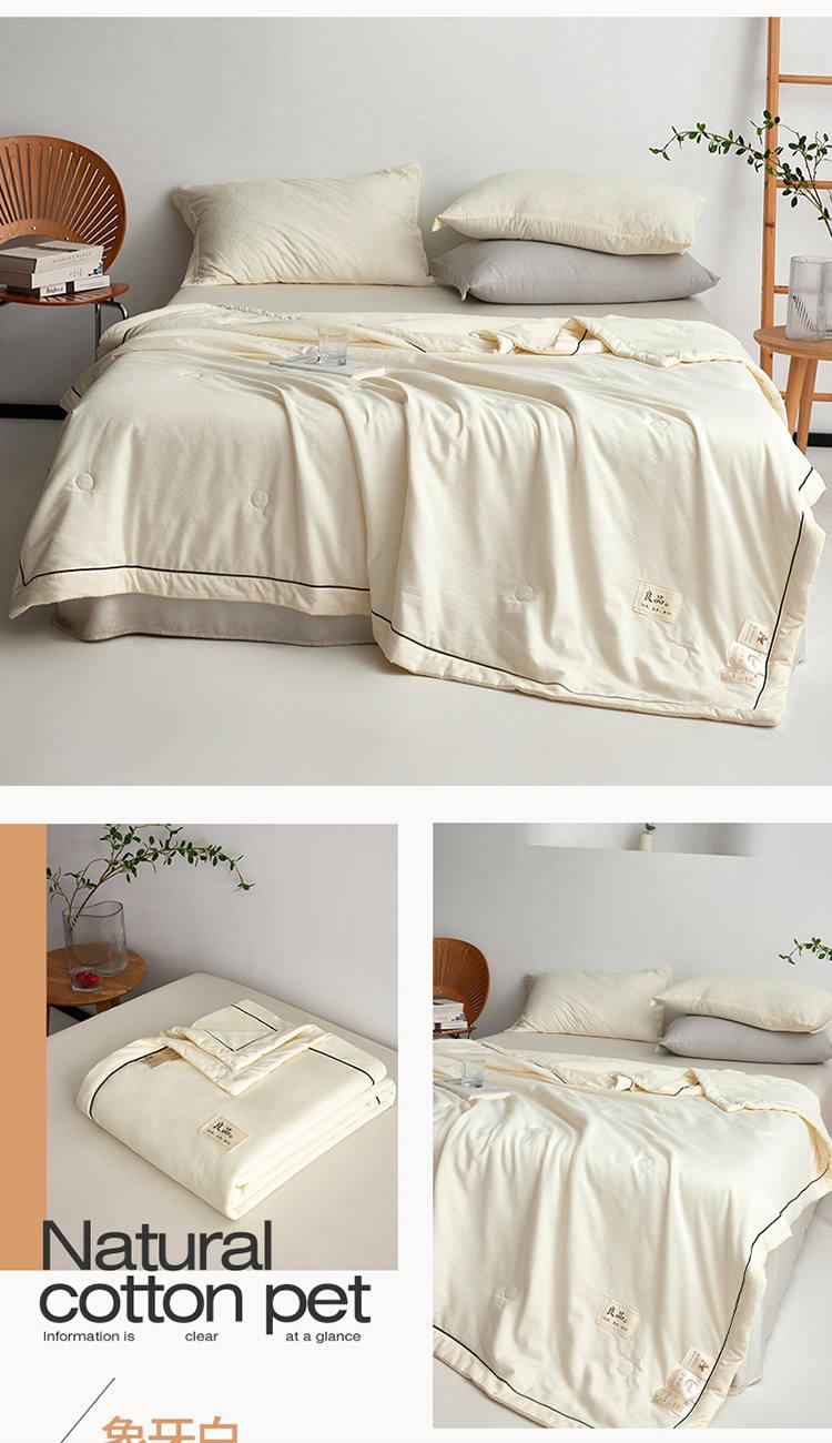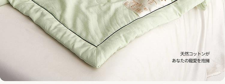 规 格:150*200cm 花 型:抹茶绿/象牙白/迷雾紫/太湖蓝/钛金灰/仙草粉 面 料:聚酯纤维 填充物:整张羽丝棉(聚酯纤维) 工 艺:定位绗缝 A类级别夏被,无甲醛无荧光无芳香胺,泡泡棉纱质面料柔软光滑,吸湿透气,不易变形,敏感肌肤适用;泡泡棉的透气性能十分良好且拥有吸湿快干的优点,优质整张羽丝棉填充,蓬松柔软;无惧机洗水洗,久洗如新,解放双手;细节满分,手工直角包边 不易开线 更加耐用。
