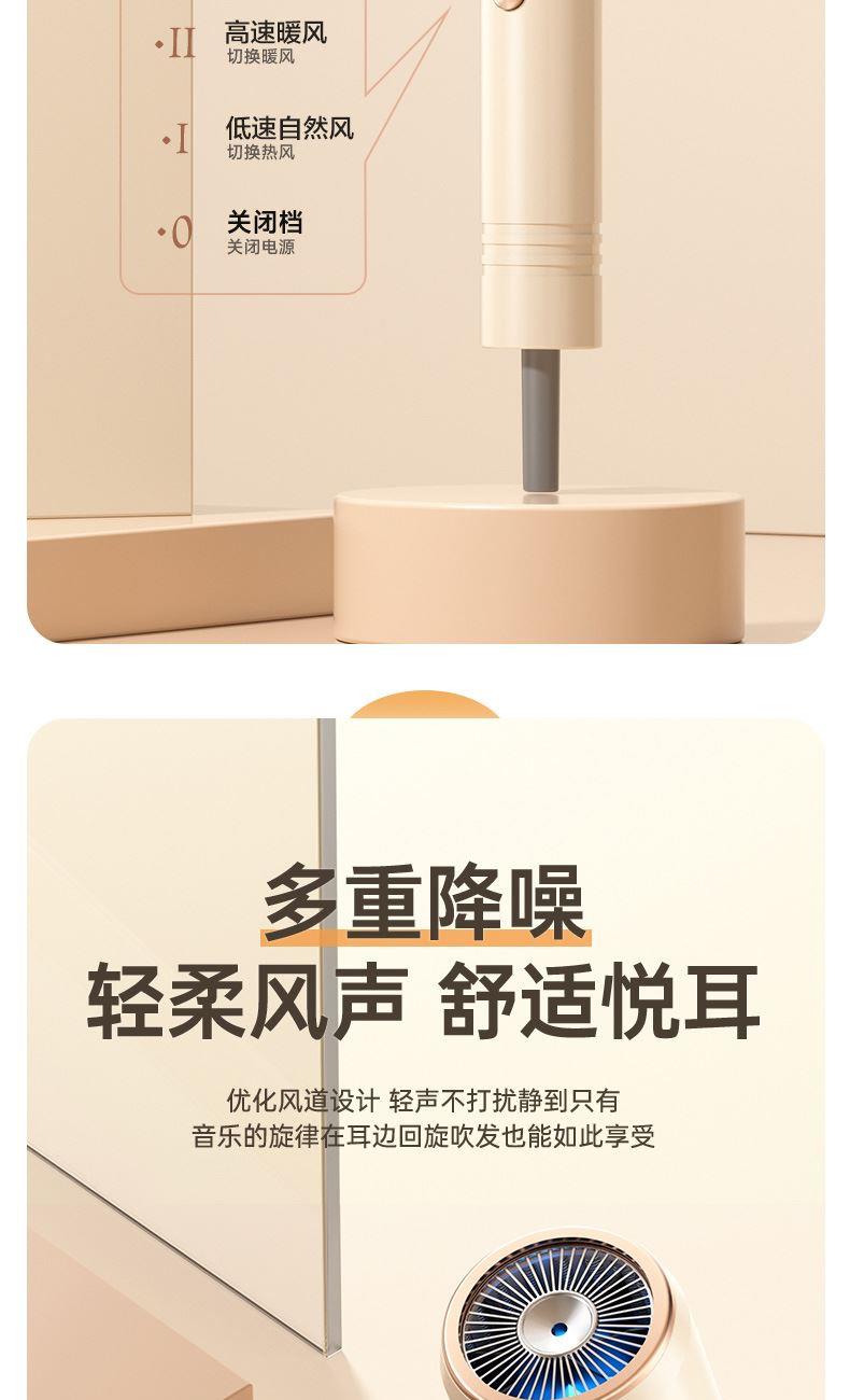 颜色:米白色 额定功率:1800W 档位:3档调节 机身克重:305g(不含线) 产品尺寸:245*72*92mm 1、大功率120000转,8倍风速提升 2、新一代V16电机,干发速度倍增 3、风力强劲,27米超高风速 4、智能温控检测NTC和微处理器MCU每秒50次实时监测调控风温,保护头皮和发丝。