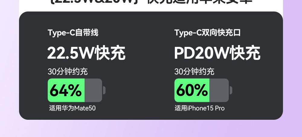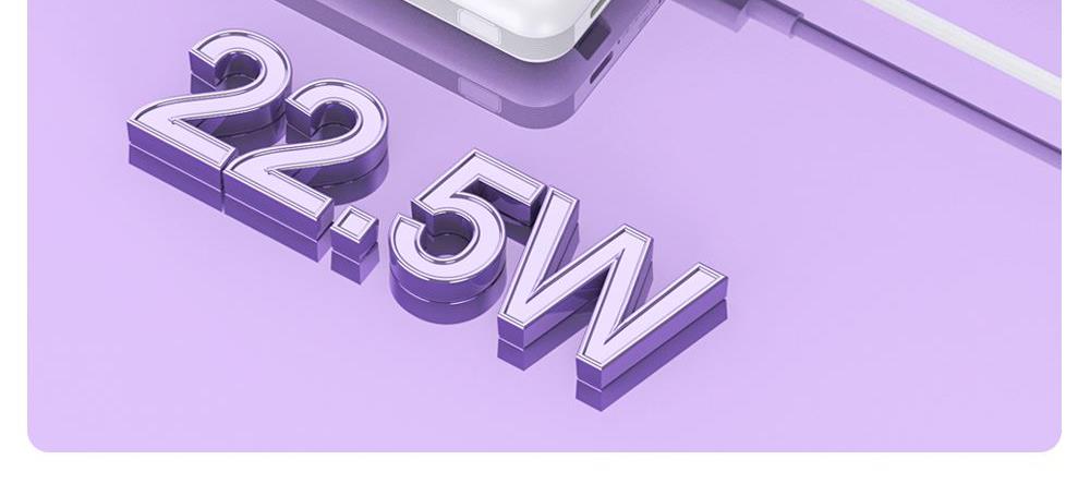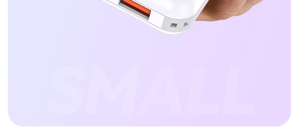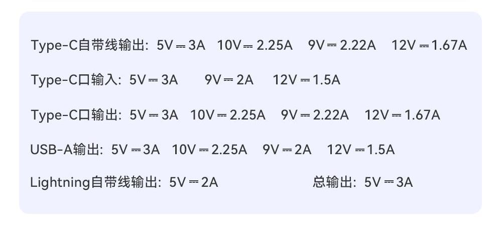 Type-C口输入 :5V-3A/9V-2A/12V-1.5A Type-C口输出 :5V-3A/10V-2.25A/ 9V-2.22A/12V-1.67A Type-C线输出 :5V-3A/10V-2.25A/9V-2.22A/12V-1.67A USB口输出 :5V-3A/10V-2.25A/9V-2A/12V-1.5A 苹果线输出 :5V-2A 产品尺寸 :108mm*69mm*19mm 产品颜色 :白色/黑色 规格明细 :80个/大箱;20个/小箱 产品毛重 :286g 产品净重 :229g · 自带苹果和Type-C双输出线,Type-C线支持22.5W超级快充 · Type-C接口输入输出均支持快充,充电宝自身充电速度提升一倍 . 自带一个USB口输出,出门多给一部手机供电 · 数字电量显示,时刻掌握充电宝剩余电量 · 自带线材精选TPE外被,历经10000+次弯折测试,品质如一 · 认证芯片,有效保护电池,延长电池寿命,提高续航能力 · 符合国际航空运输标准,安心携带登机 · 广泛兼容,智能匹配,适用市面上绝大多数手机