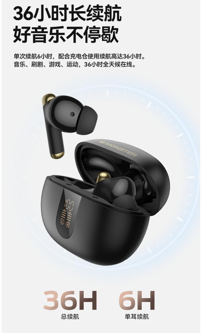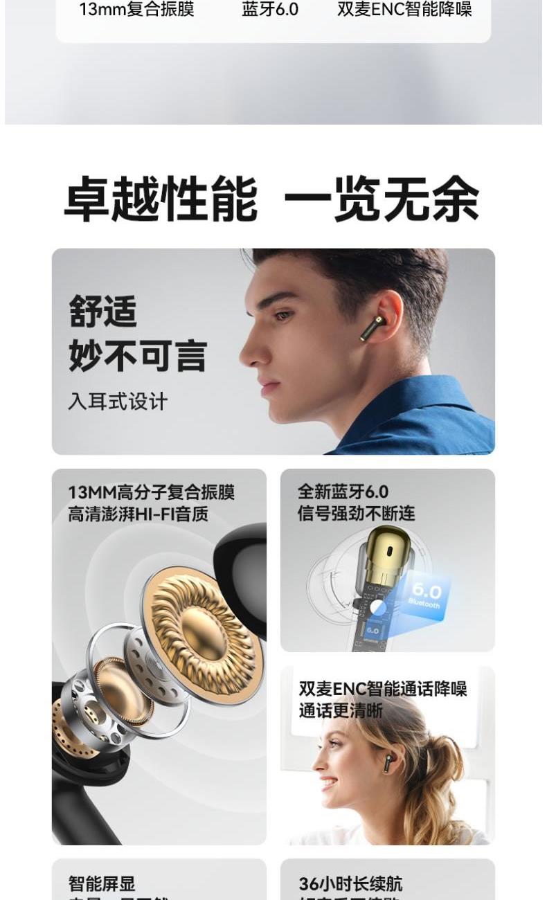 • 6h单次续航,36h充电舱续航,告别电量焦虑