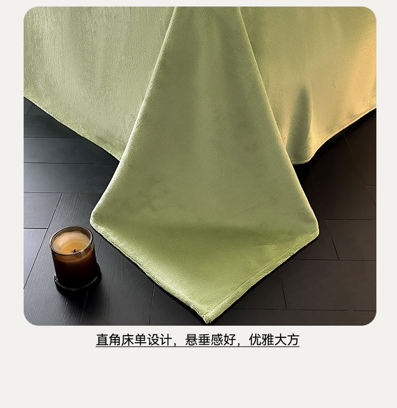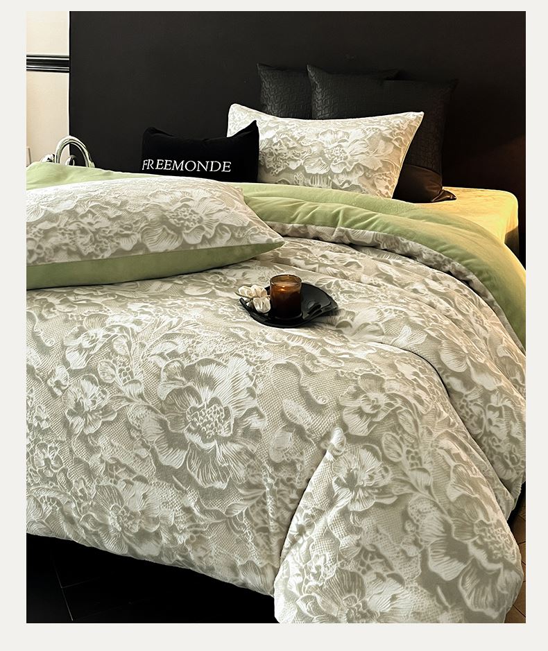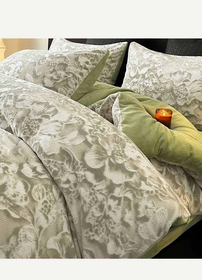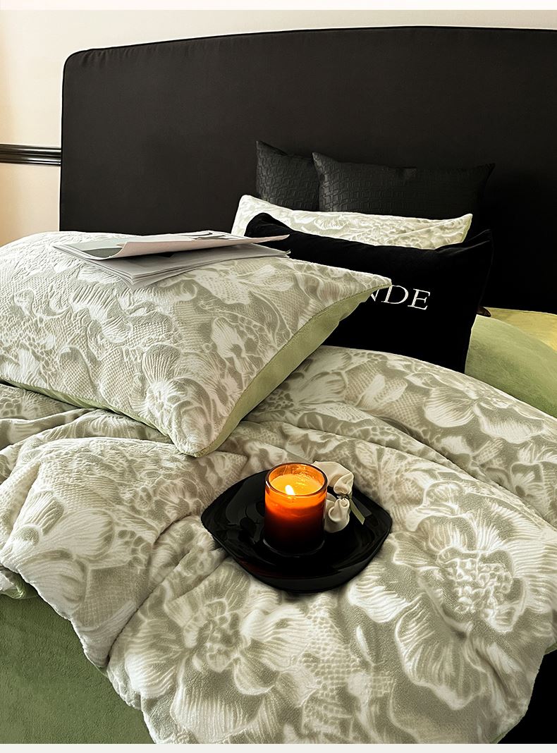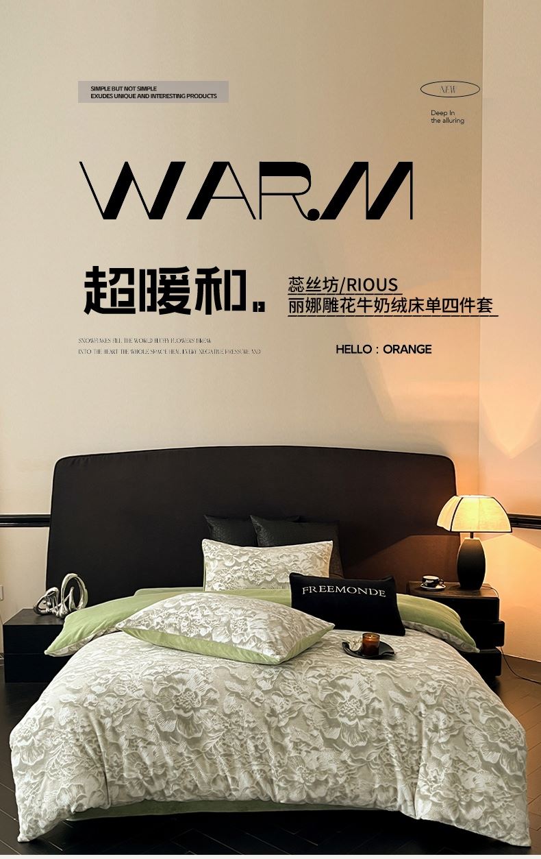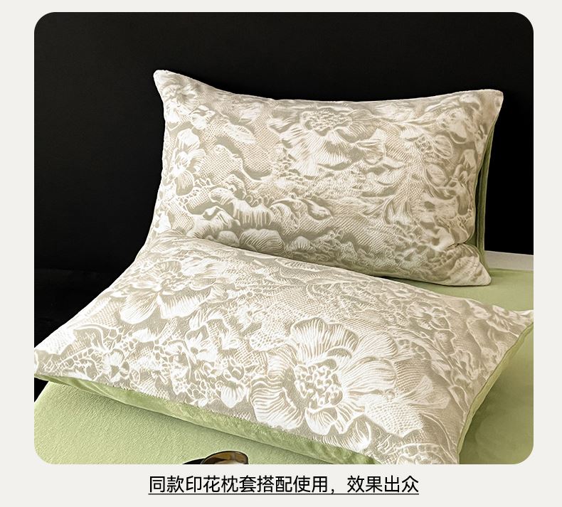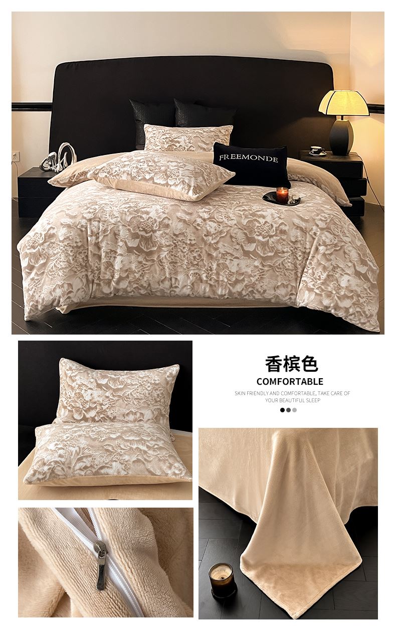规格:1.5-1.8M床适用 被套200*230cm 床单230*250cm 枕套48*74cm 面料:牛奶绒 花色:香草灰、橙意粉、香槟色、月光绿 雕花牛奶绒面料,绒毛细密,不易起球和掉毛,撸猫般的柔顺手感,远离寒冬,高颜值AB双面设计,A面采用时髦洋气的印花图案点缀,栩栩如生,B面纯色简约,给卧室增添一抹冬日的亮色。