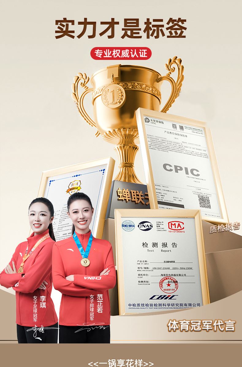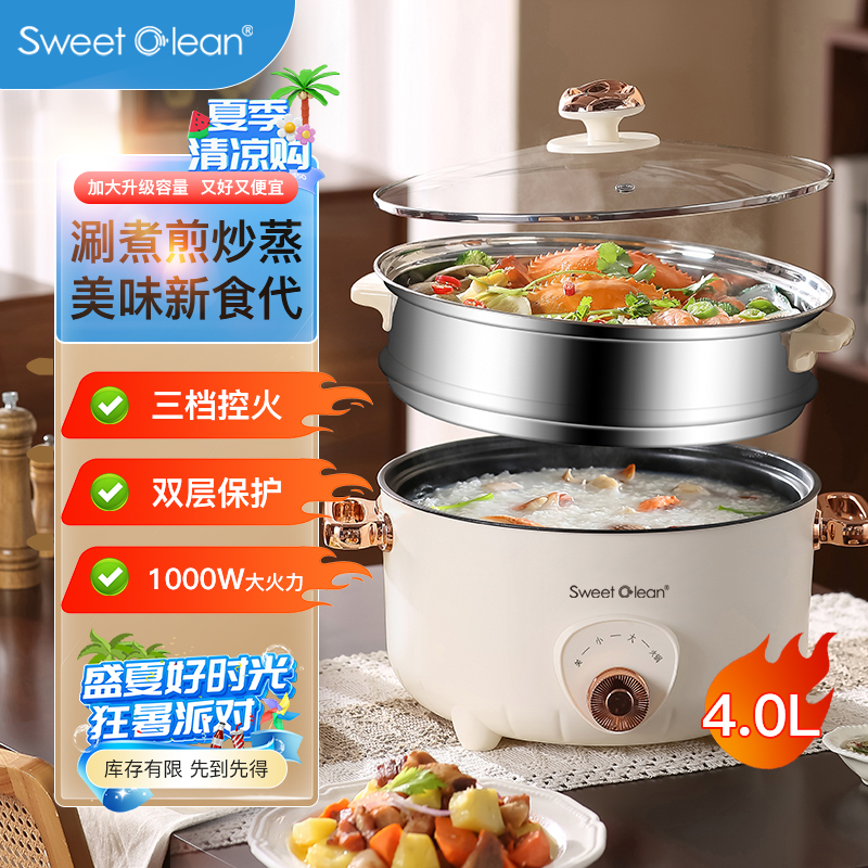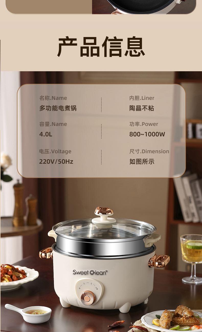 容量.:4.0L 电压.:220V/50Hz 内胆:陶晶不粘 功率:800~1000W 精通蒸/煮/涮的电火锅一锅多用美食享不停,蒸、一锅同出两种美食,上蒸下煮方便快捷。不粘锅体熬煮不糊,自动保温美味回温,双层防烫更安全,分离式电火锅身蒸架分离便捷清洗,玻璃锅盖,人性化透视化可观察食物状态。蒸笼,选用食品级PP材质健康安全安心。锅身塑料锅身安全防烫外观简约耐看,旋钮一键旋钮选择火力大小可调控操作简单。
