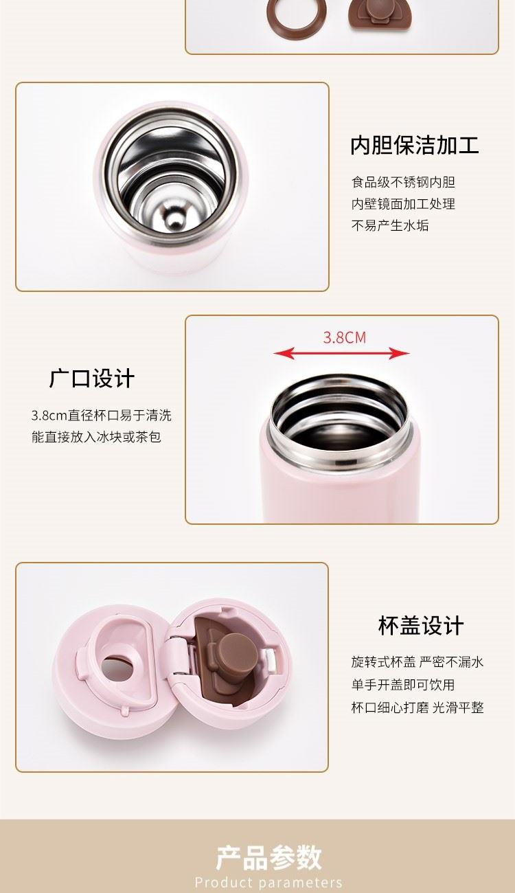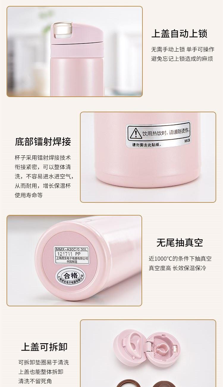 容量:300ml 颜色:白色、粉色、雪纺蓝、靛蓝色、雏菊粉 产品尺寸:5.8X5.8X19.8cm 重量:0.15kg 保温效果:1小时84℃以上,6小时63℃以上 保冷效果:6小时9℃以下 产地:中国 单手使用轻松快捷,一键开启自动上锁 优质304不锈钢材质 梦重力轻量设计 底部镭射焊接,可整体清洁,不易进水进空气 上盖可拆卸清洗