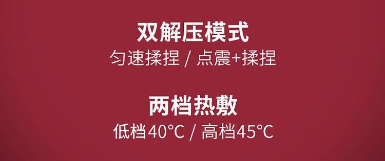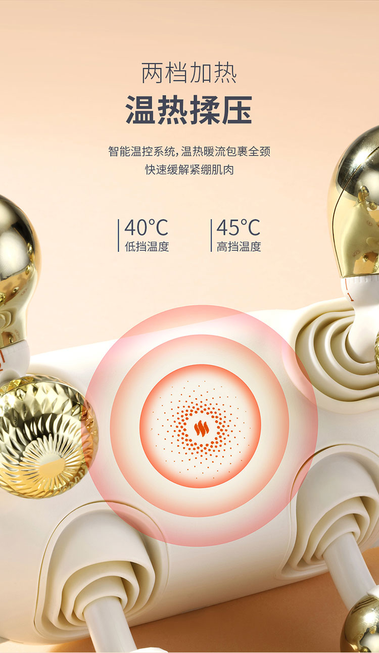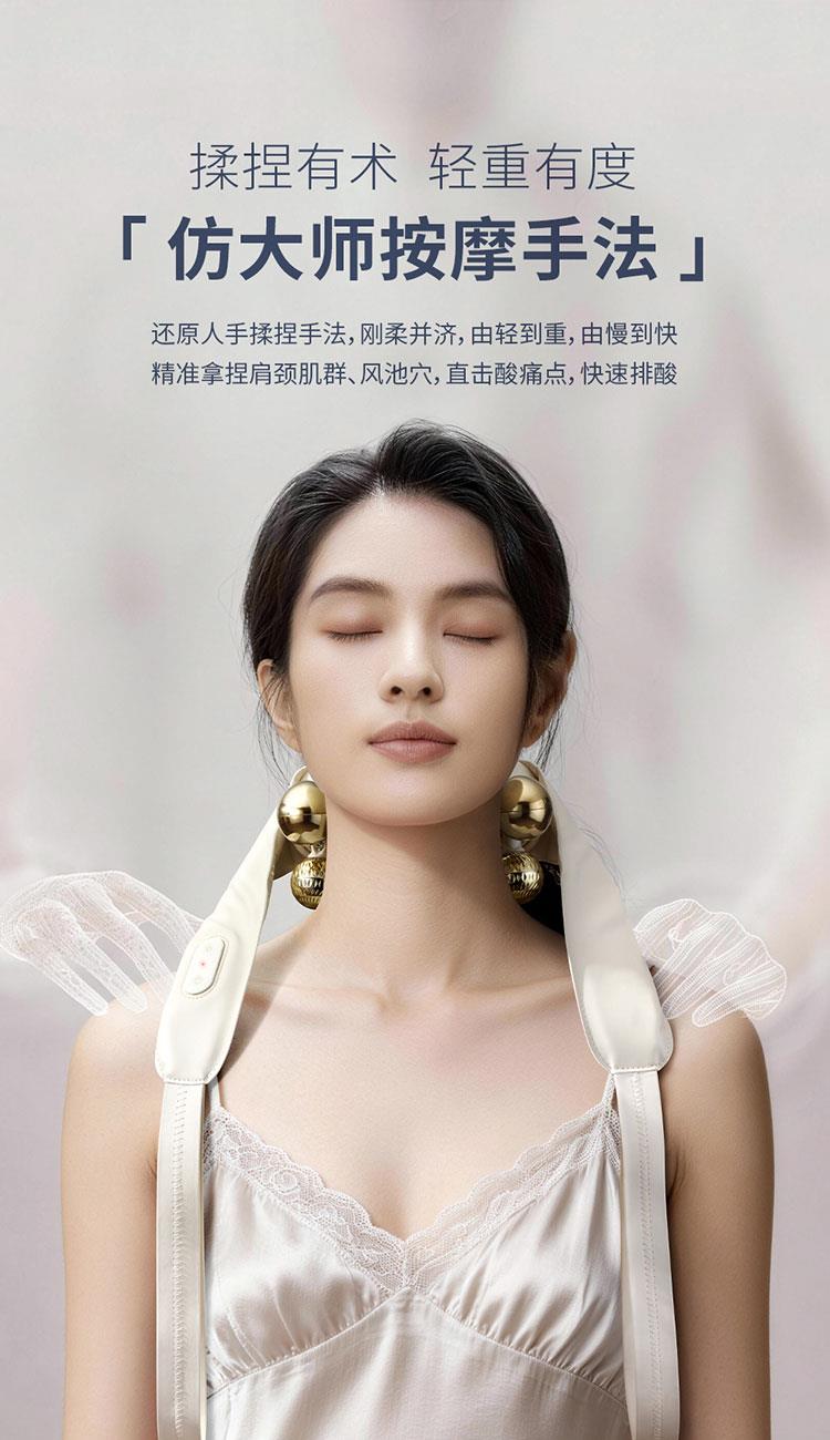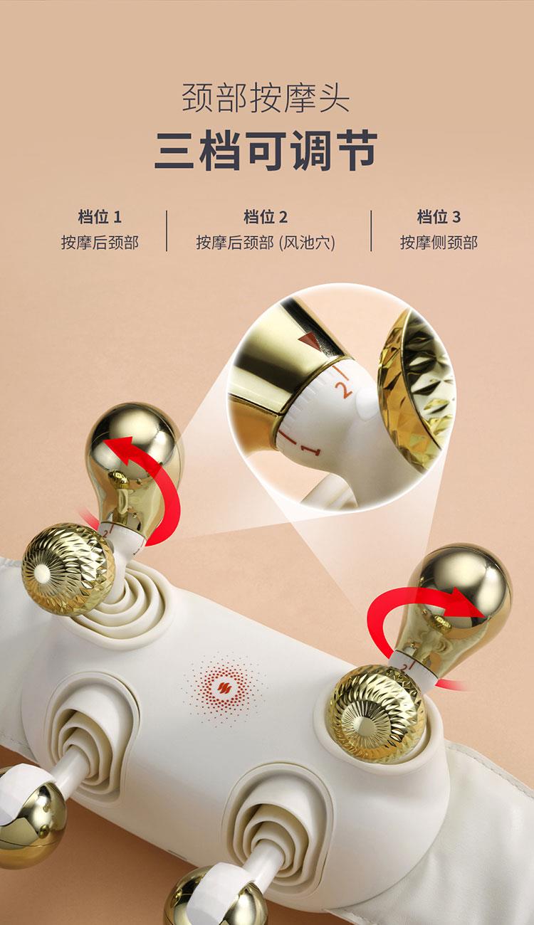 产品规格: 1、工作电压:7.4V 2、工作功率:18W 3、电池容量:2000mAh 4、皮料材质:PU皮 5、工作时长:10min 6、产品颜色:米白色 产品特点: 1、仿大师按摩手法,还原人手揉捏,刚柔并济,快速排酸; 2、颈部按摩头,三档可调节,缓解颈椎不适; 3、两档加热,智能控温,缓解紧绷肌肉; 4、两档按摩模式,双解压,每一种皆是享受; 5、10min智能定时,穴位揉捏,恰到好处; 6、两种佩戴方式,解放双手。