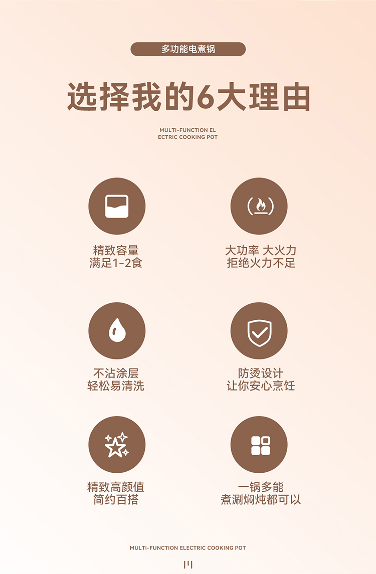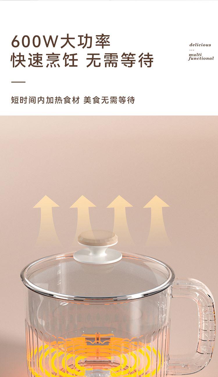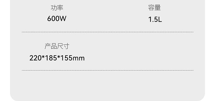 产品尺寸:225*177*170mm 彩盒尺寸:198*178*144mm 外箱尺寸:730*410*435mm 单台净重:0.74kg 单台毛重:0.76kg 容量:1.5L 额定电压:220V~ 额定频率:50Hz 额定功率:600W 材质:外壳PP 内胆:不锈钢+涂层 盖子:玻璃 包装材料:彩盒> 1.5L黄金容量,一锅多用途,精煮花样多 > 双档火力调节,把控不同所需火候 > 食品级不粘内胆,清洗更省心 > 可视化玻璃盖,烹饪状态一目了然,防烫把手,暖心设计